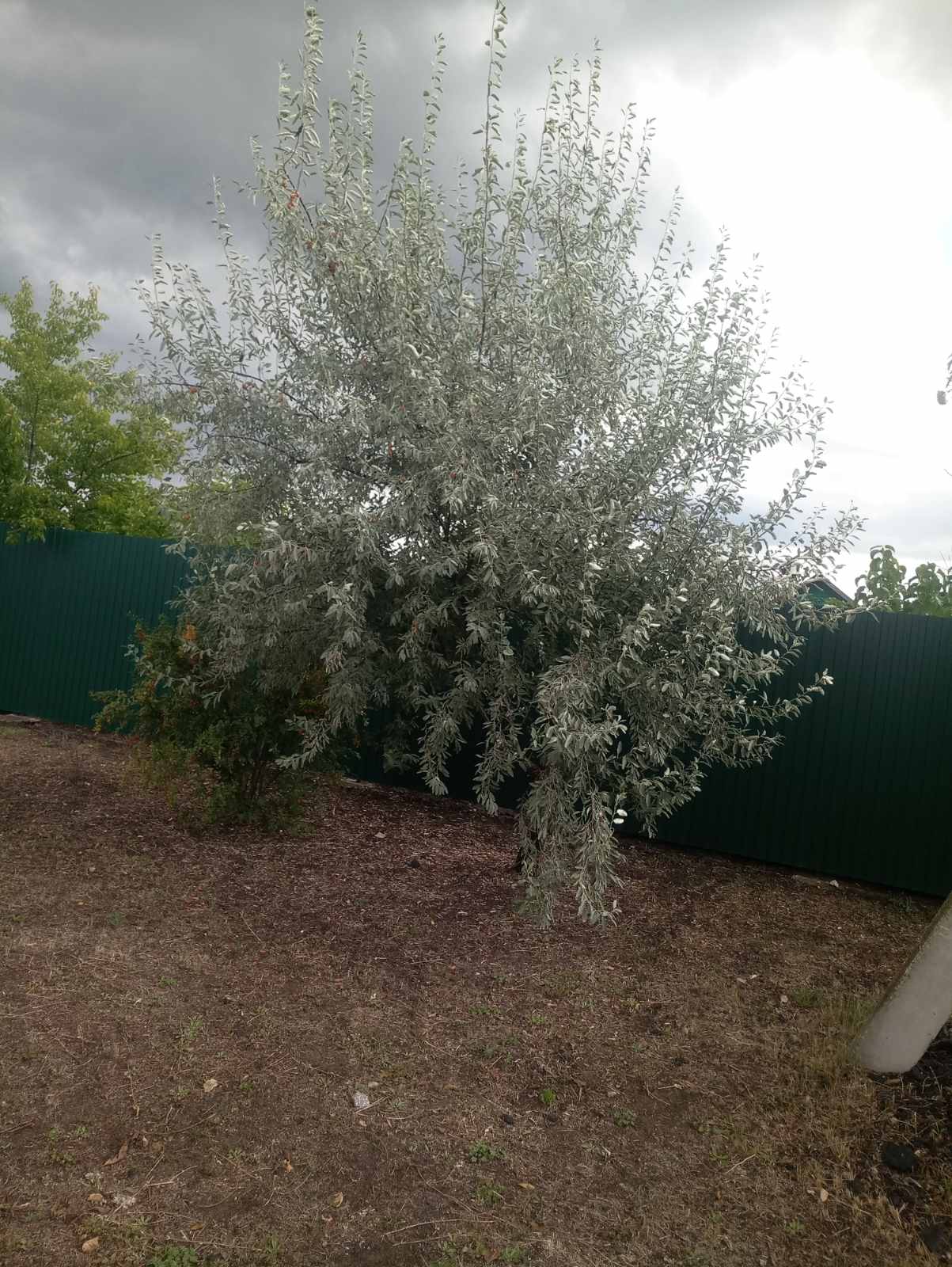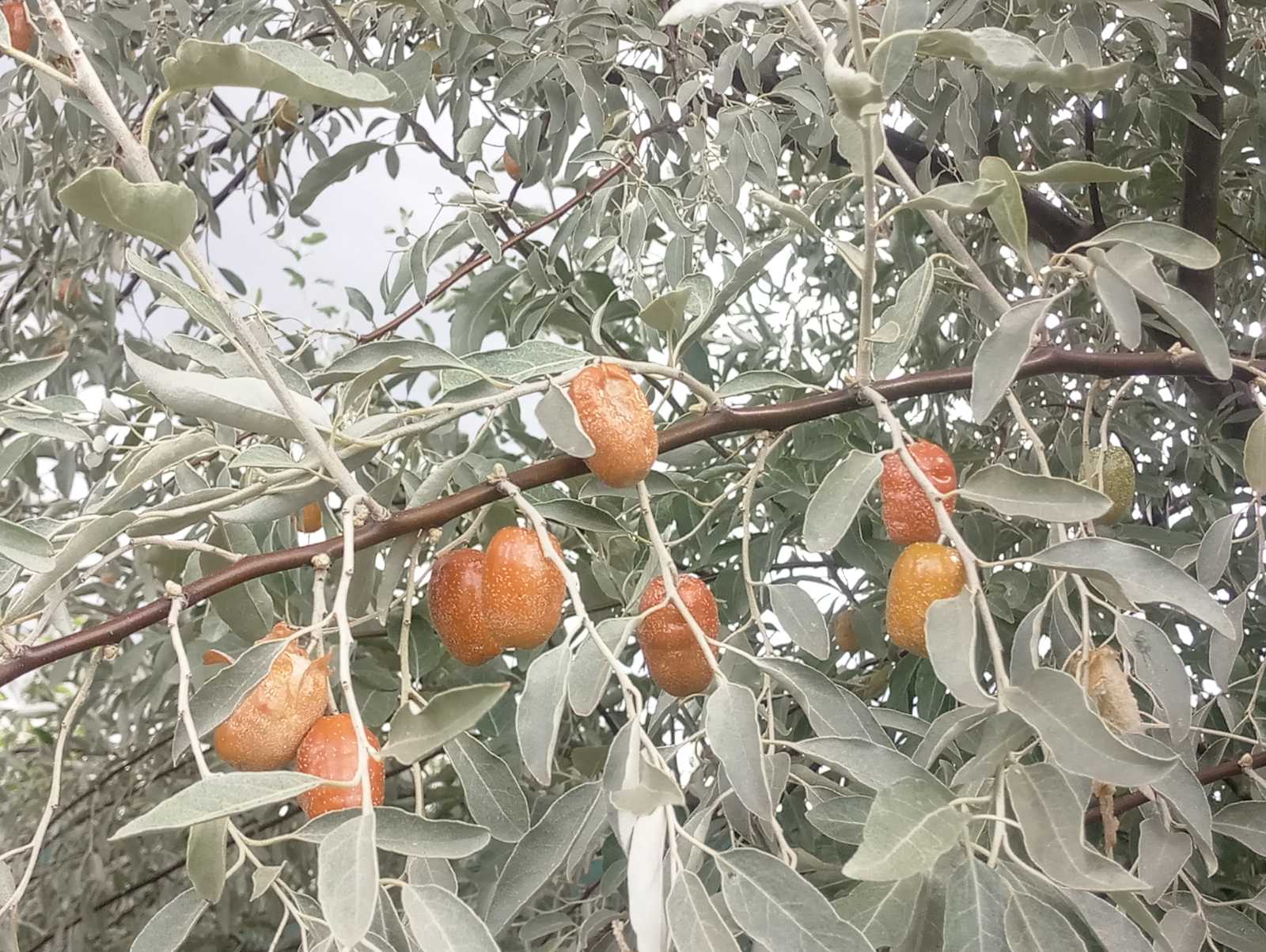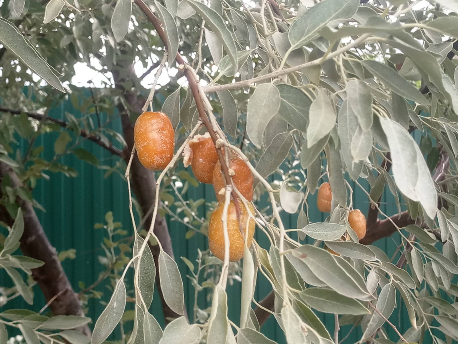 Лох узколистный с колючками, просто на молодых побегах их нет. У нас он везде как сорняк растёт. Плоды по виду и по вкусу мелкие финики напоминают, только мякоть мучнистая.