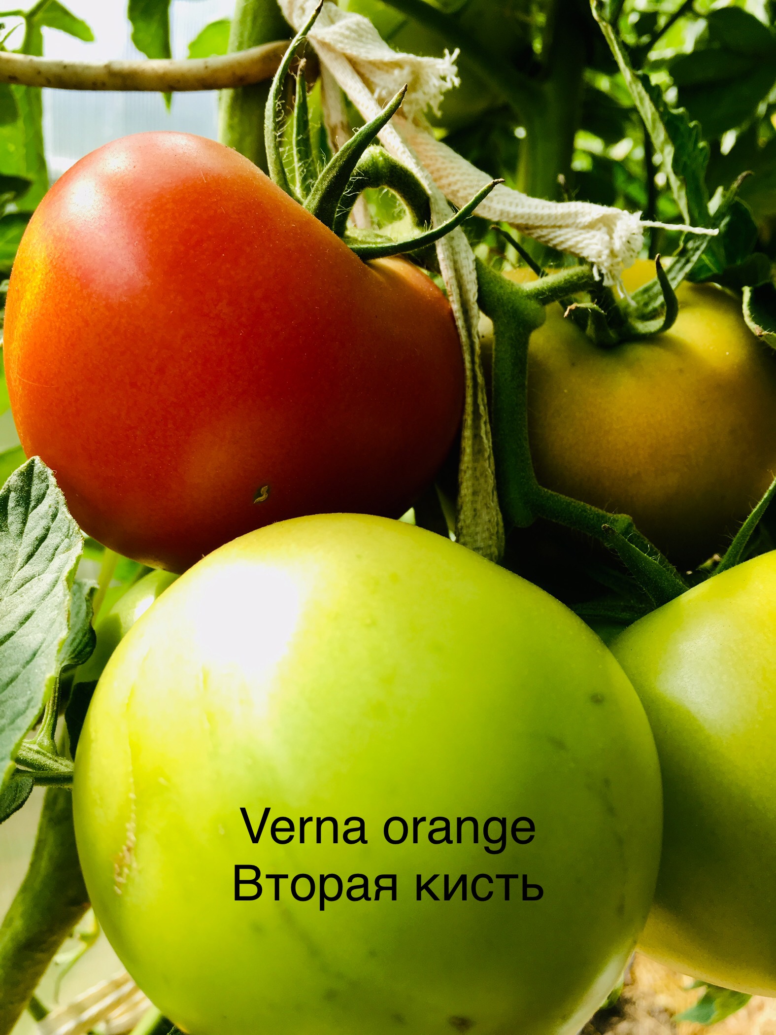 Изначально семена с Verna orange, на первой кисти 5 красных шариков и один окрасился в желтый. Оборвала красные, пусть один повисит пока. Вторая кисть только начал краситься первый томат, и - кажется - будет темно оранжевым.