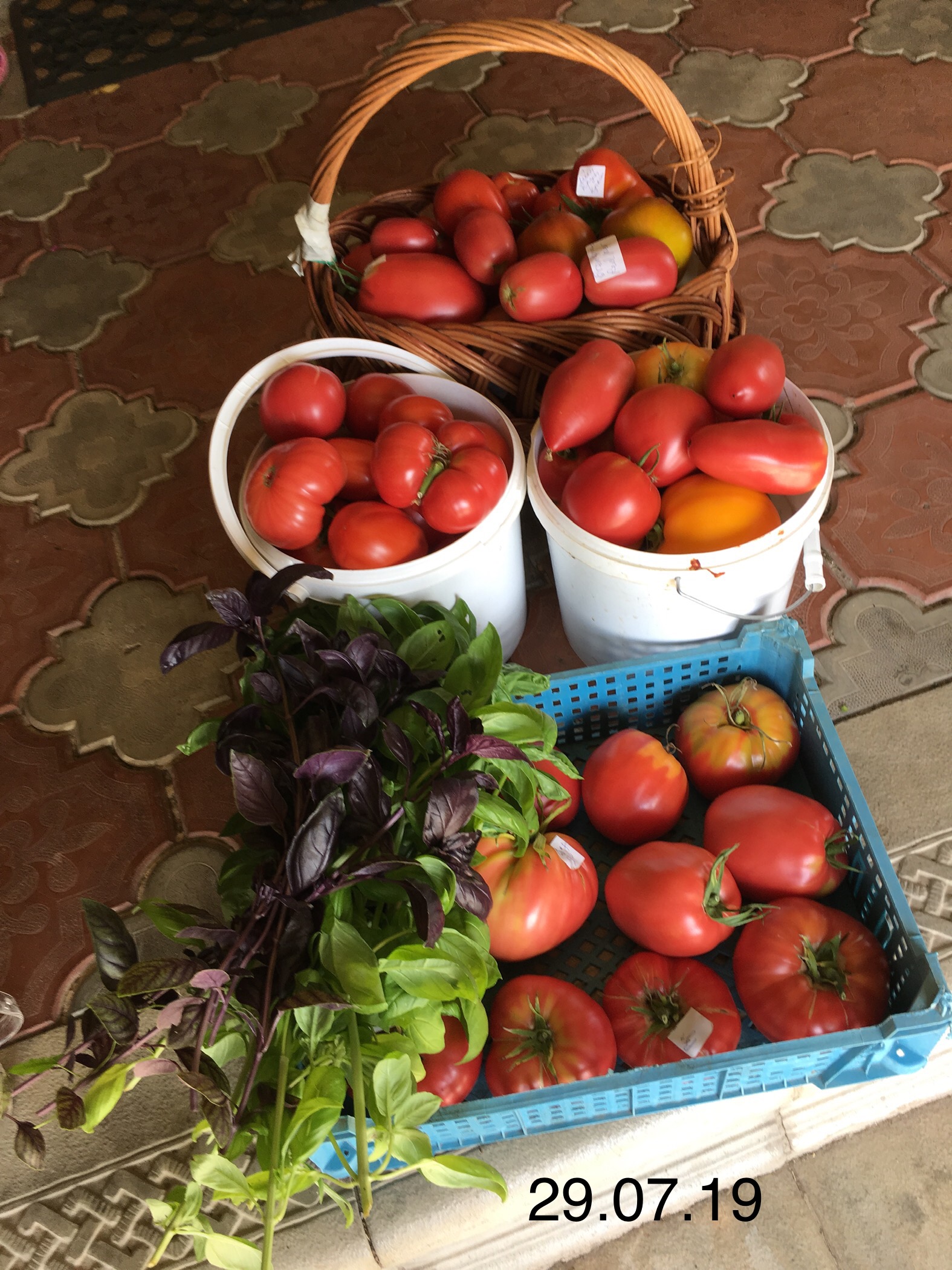 Слева верхнее ведерко Розовый гай. В этом году все помидоры очень вкусные, и с хорошей ровной мякотью.