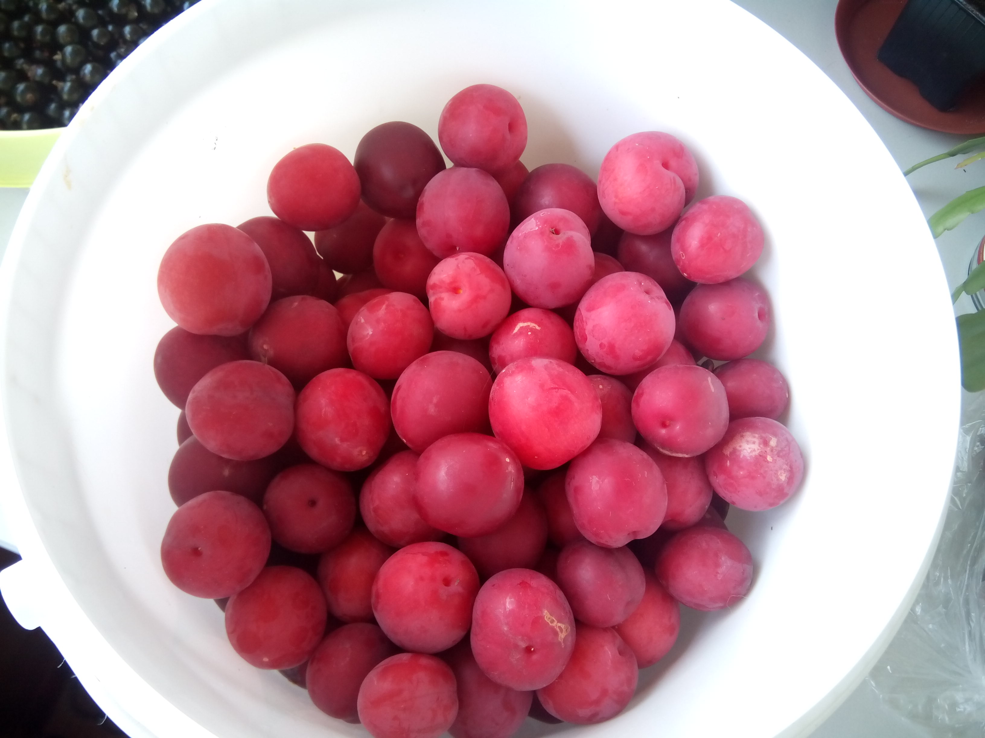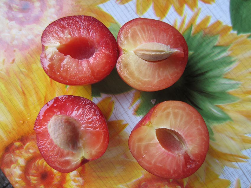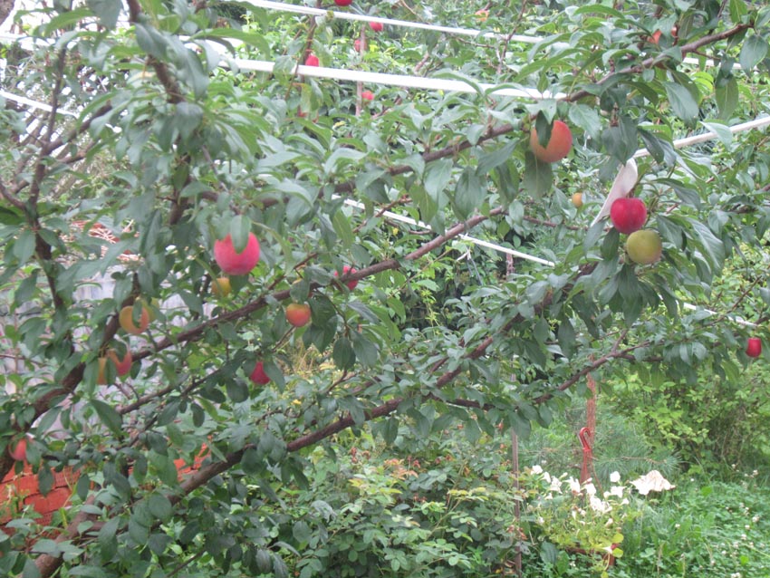 Созревает алыча Шатер (черенок из отдела зелёного черенкования,привита на сливу Скороспелка красная). Созревание не равномерное, при созревании осыпается. Плоды в этом году не крупные, но из много. Из-за многочисленных дождей не растрескались, сладость набрали, хоть и меньше по сравнению с прошлым годом. Плоды достойного вкуса, мякоть сочная, жёлтая с красным, шкуркая толстая кислая, косточка средняя, отделяется сложно, при перезревании отделяется хорошо. Прививка с 2015 года не подмерзала, чувствует себя отлично, крона формируется в достаточно горизонтальном направлении, не выше 2,5 метров. Привита на высоте примерно 1,5 метров от земли.