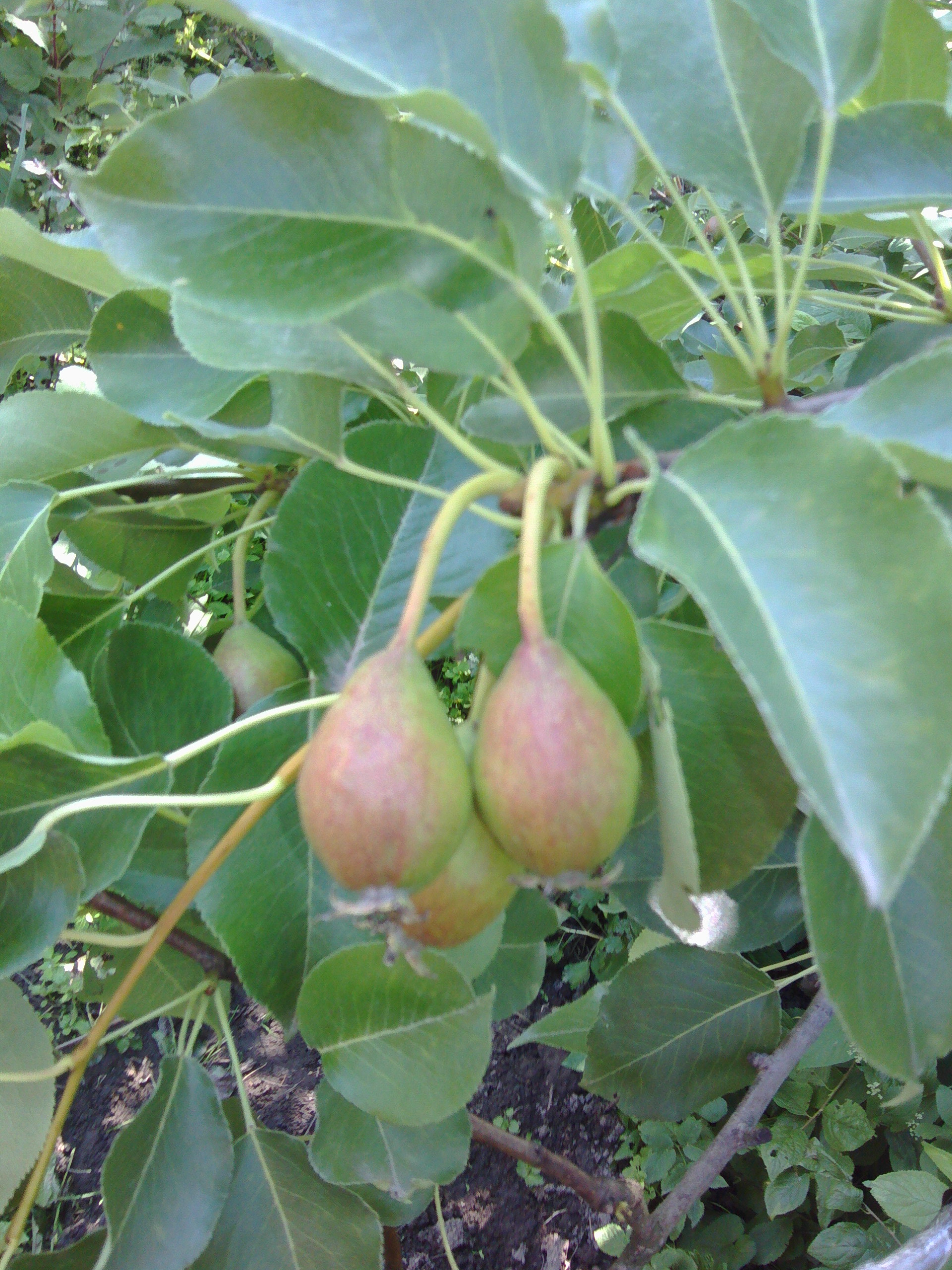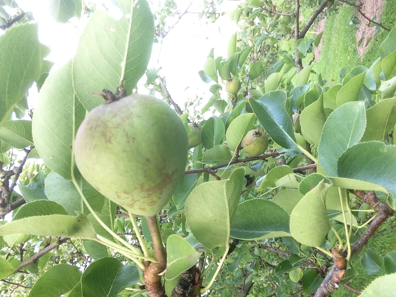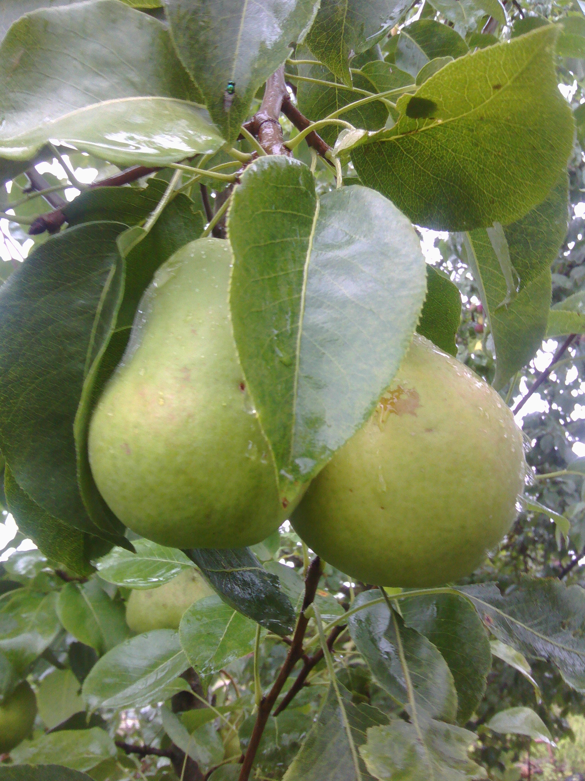 Прошло время, грушки существенно подросли и налились, теперь от загара не осталось и следа, висят себе типичные зеленоватые грушки.