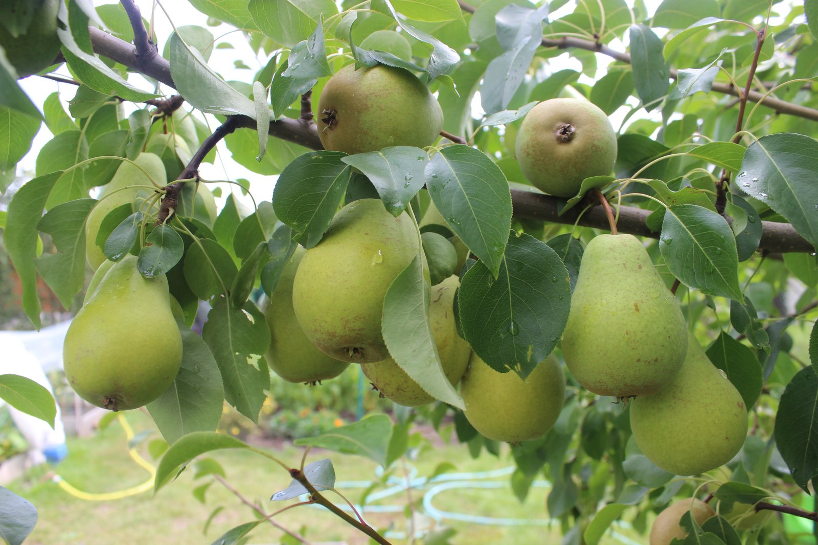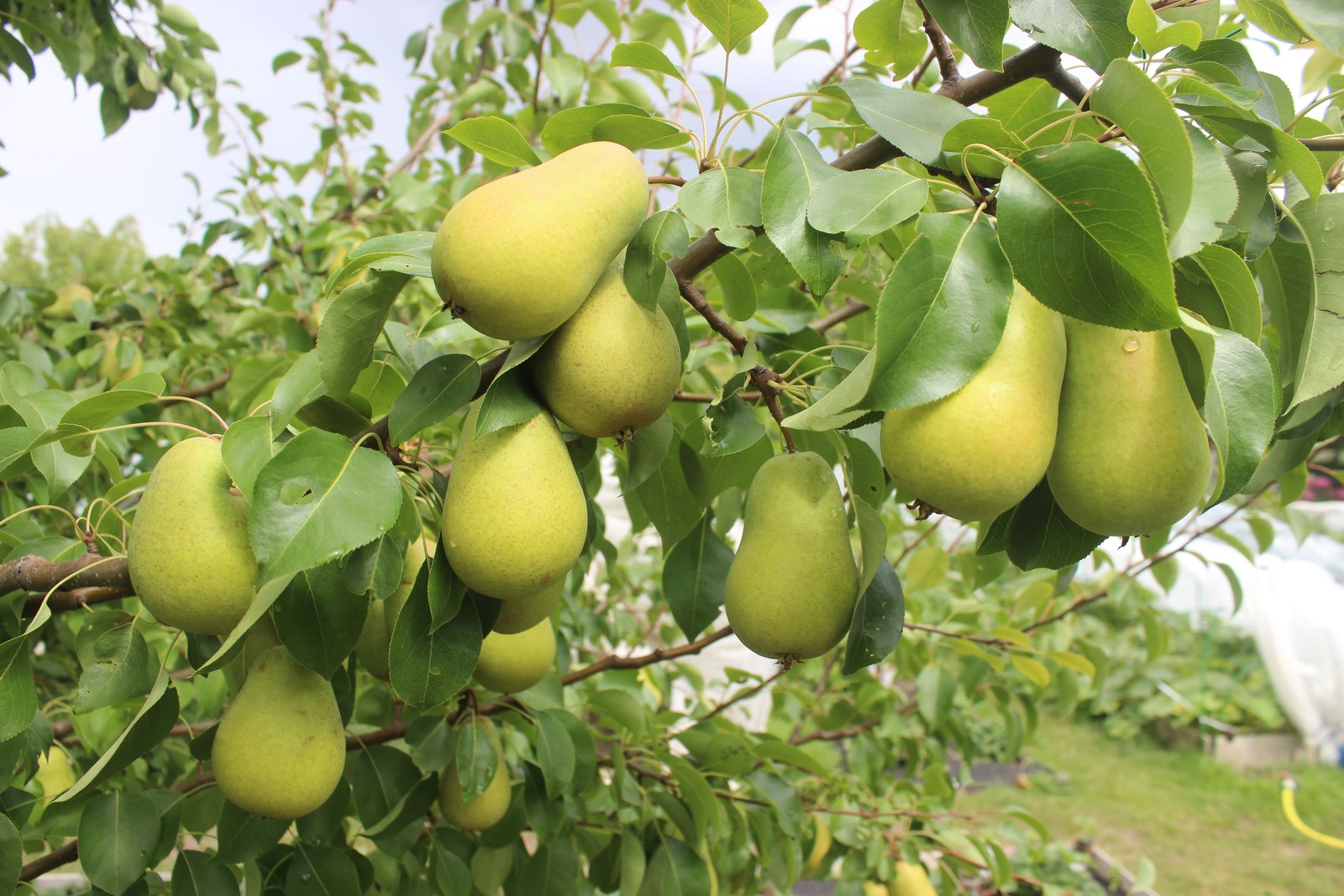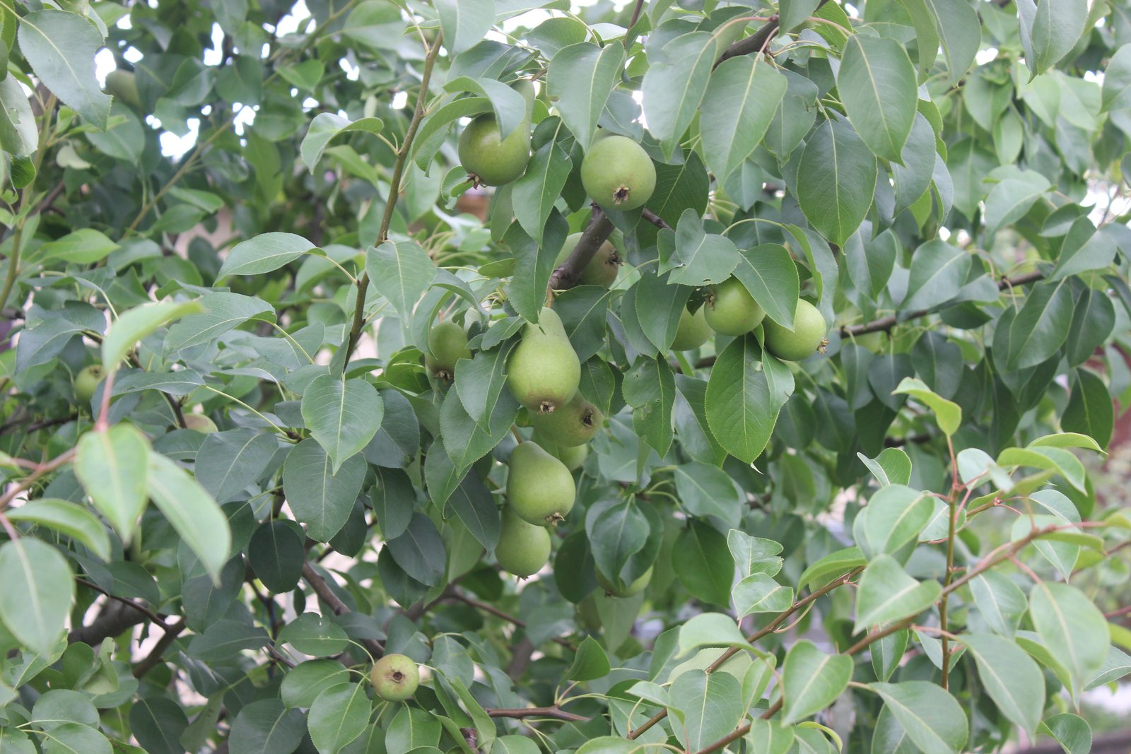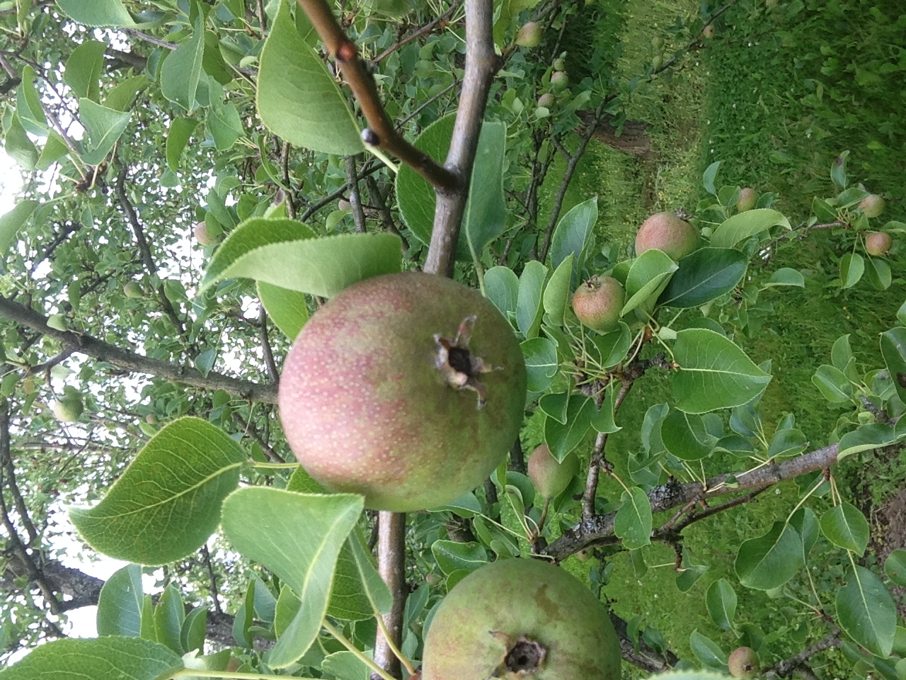 Прошло время, грушки существенно подросли и налились, теперь от загара не осталось и следа, висят себе типичные зеленоватые грушки.