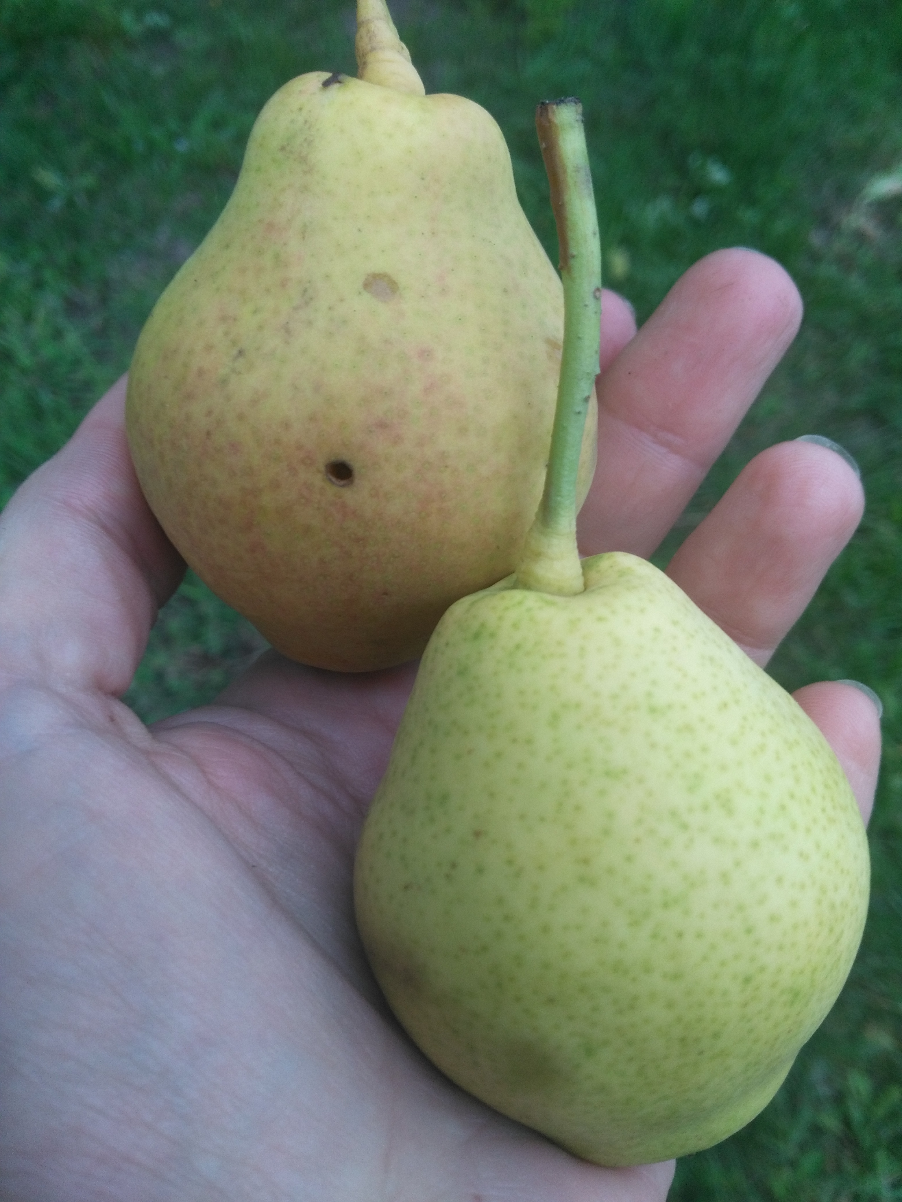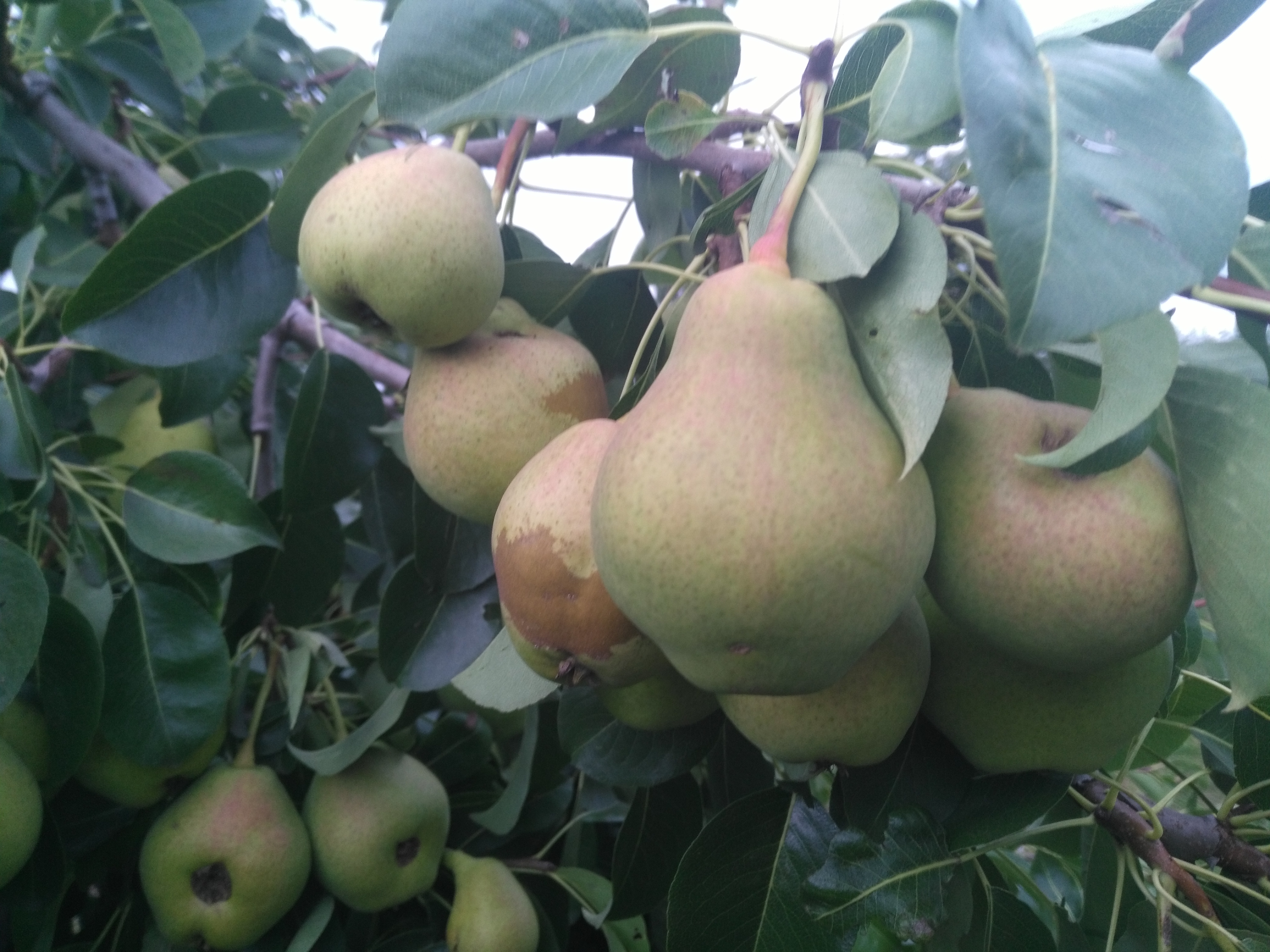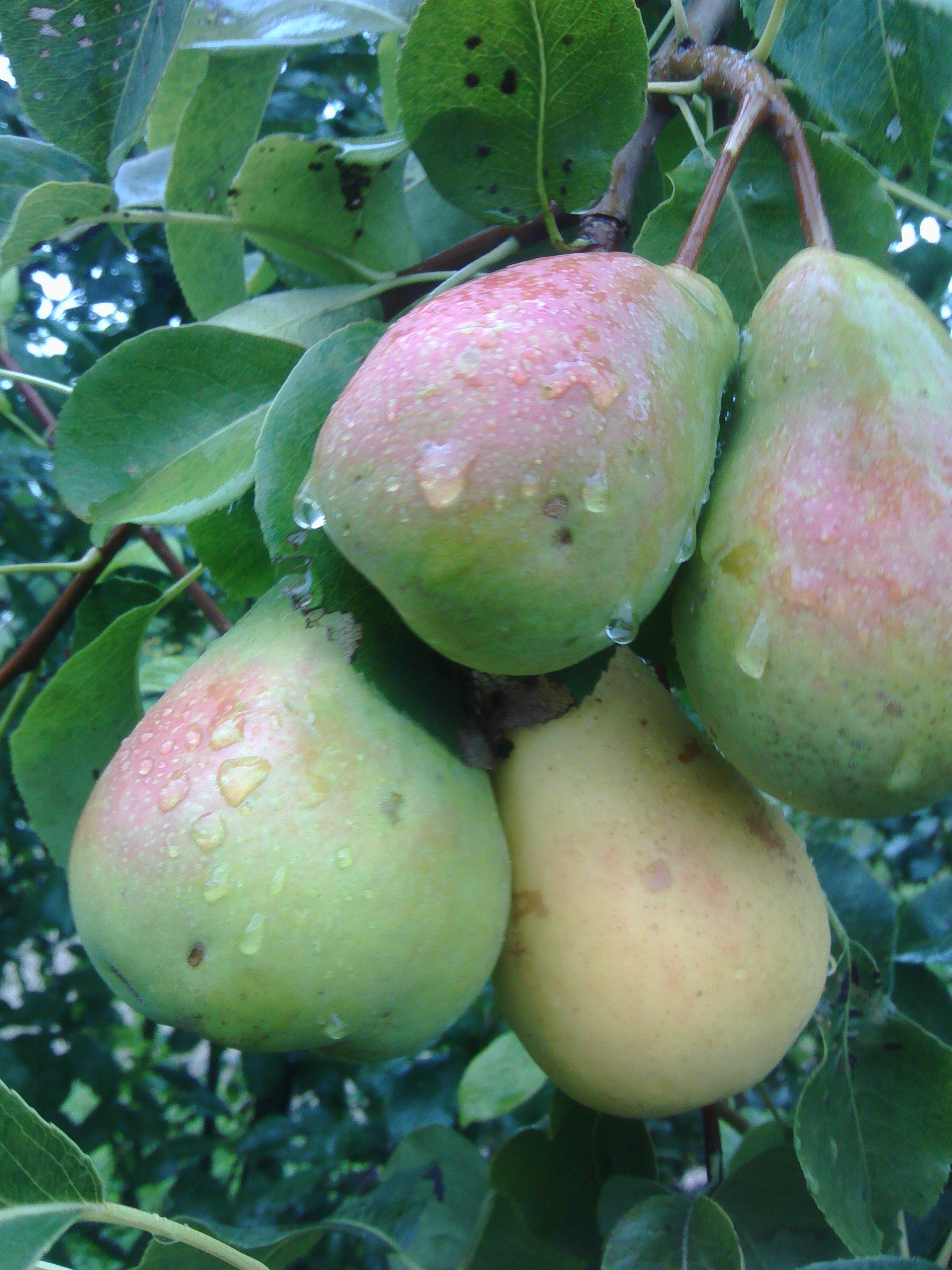 Здравствуйте! Помогите определить сорт груши. Покупалась как Любимица Яковлева, но сравниваю с фото из инета - как-то не похожа. Сейчас уже начинают опадать спелые, но не массово. Основная масса плодов еще зеленая. На вкус пресноваты, без терпкости. Сейчас.жесткая, когда становится съедобной, то обычно не сочная, быстро становится картофельной. Но в этот раз некоторые упавшие груши были довольно сочными (не Августовская роса, конечно, но и совсем не картошка), мякоть нежная, даже маслянистая.