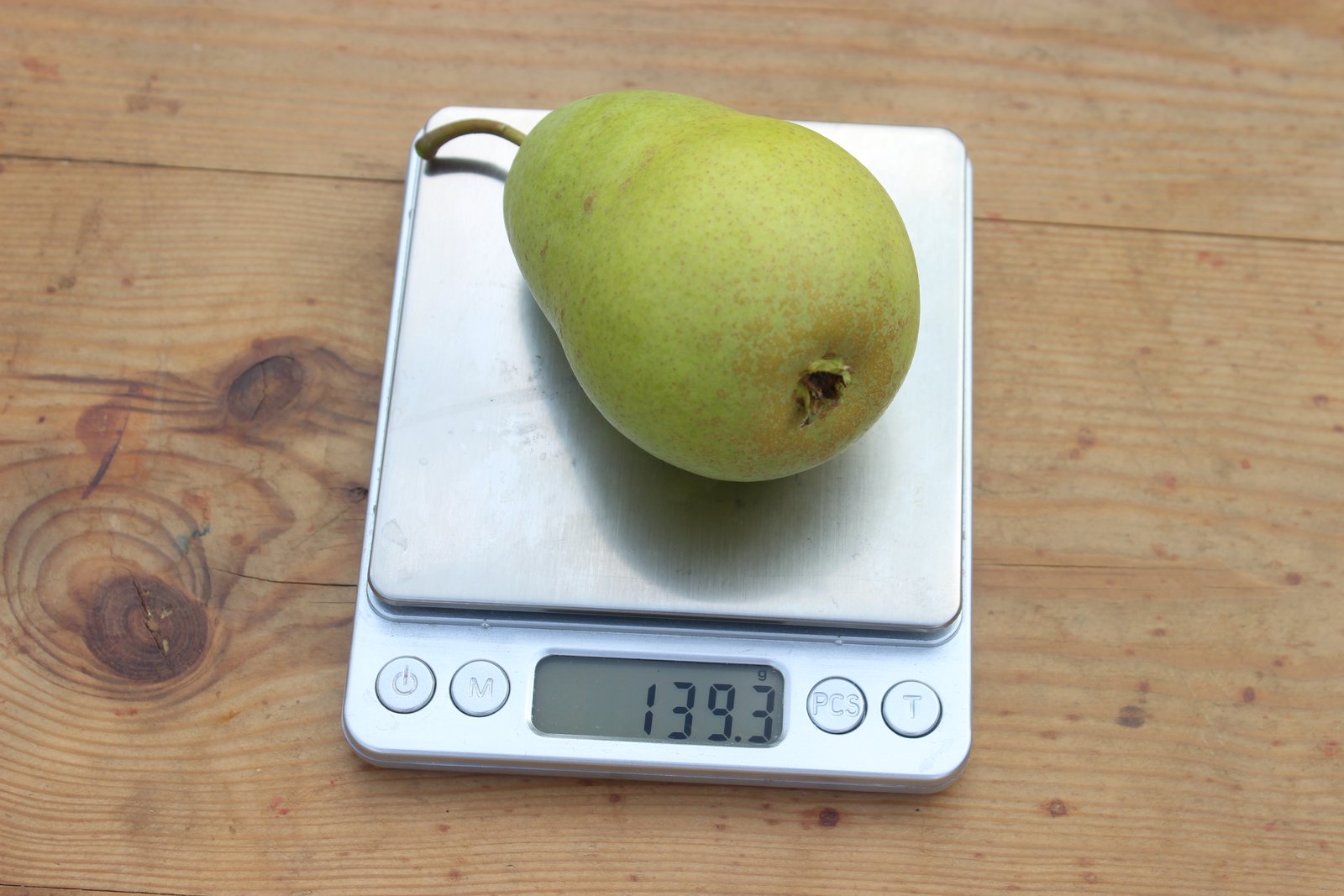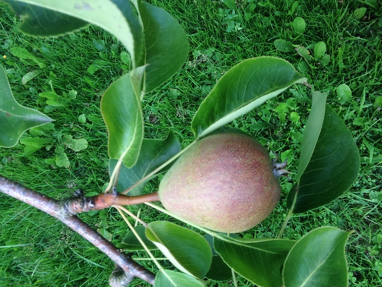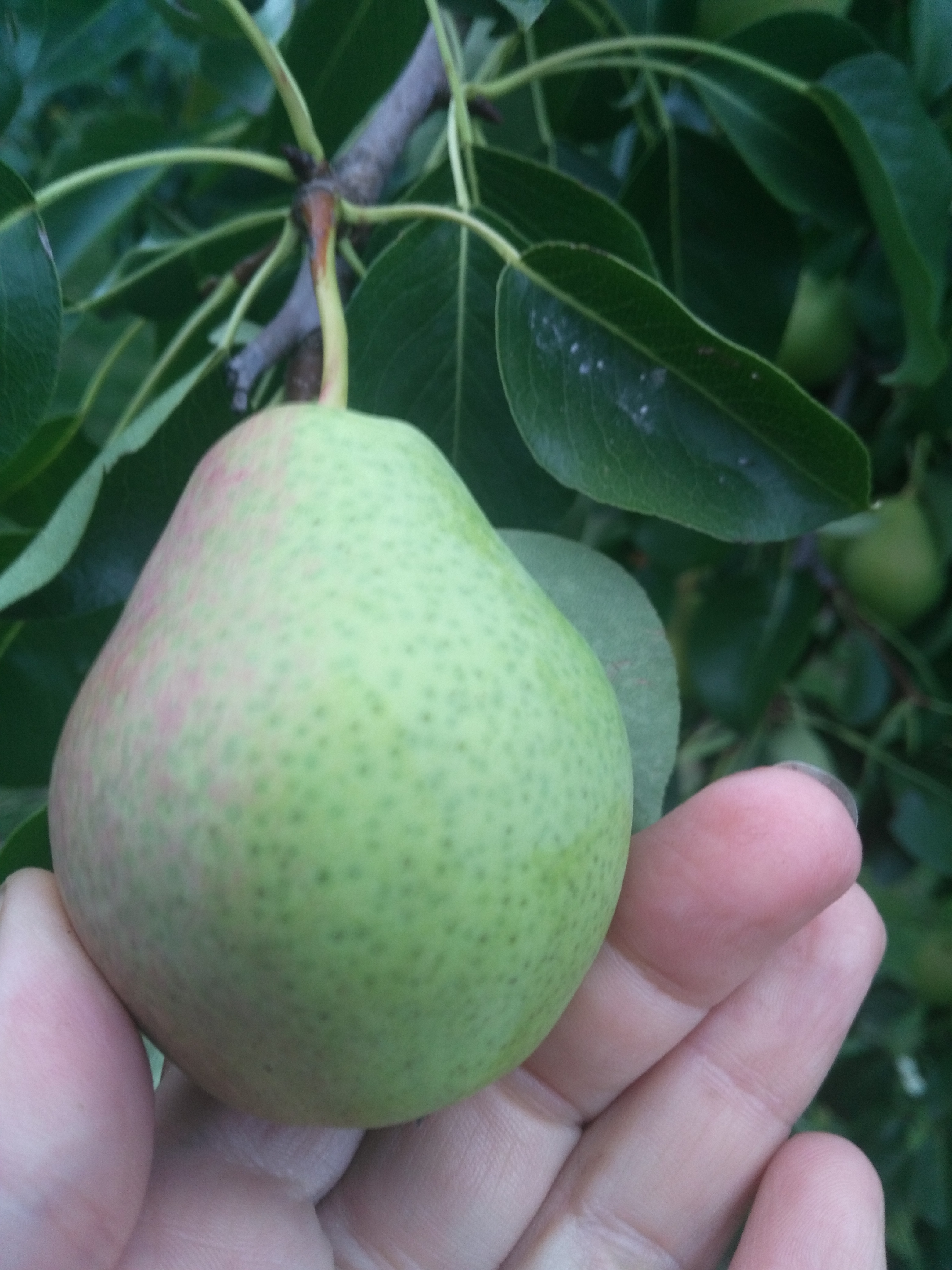 Сажал однолеткой осенью 2012 г. В этом году первое нормальное плодоношение, груш много, можно пробовать в разное время для понимания приблизительных сроков съема. Уже вполне съедобная, однако мякоть пока еще жестковата, хрустящая, хорошего кисло-сладкого вкуса. Снял несколько груш, подержу дома на предмет дозаривания.По-моему похожа, как считаете?