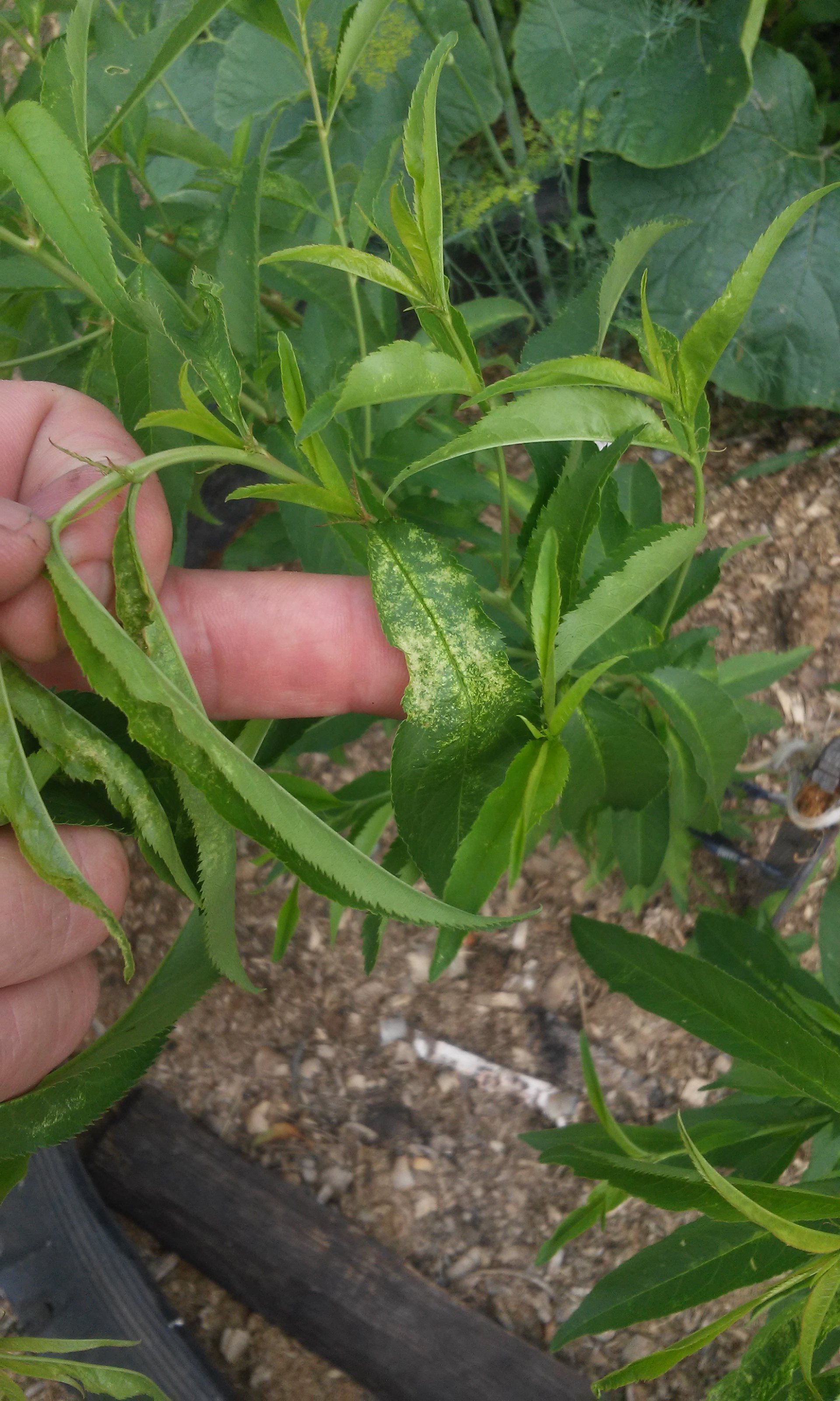 Может кто подскажет что такое с персиком происходит. Несколько листьев в более светлых пятнах и только на одном растении. Фото знакомый прислал, но саженец этот он брал у меня.
