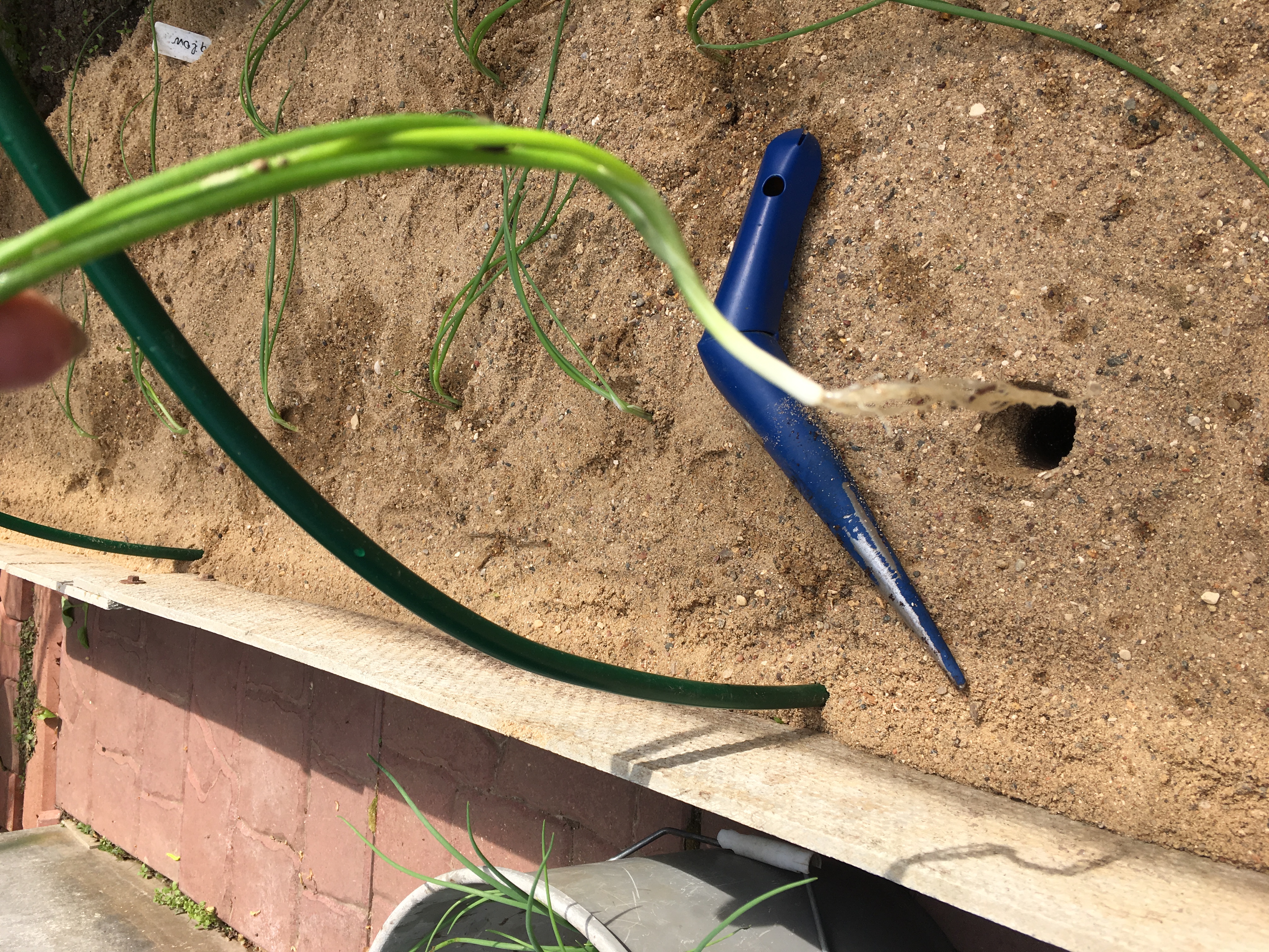 Вынимаю из ведра с водой рассадину, отверстие колышком уже сделано, при поливе песок в лунку чуть сыпнула с поверхности, вода затянет, подтянула вверх, если глубоко. Нетканкой накрою на первое время.