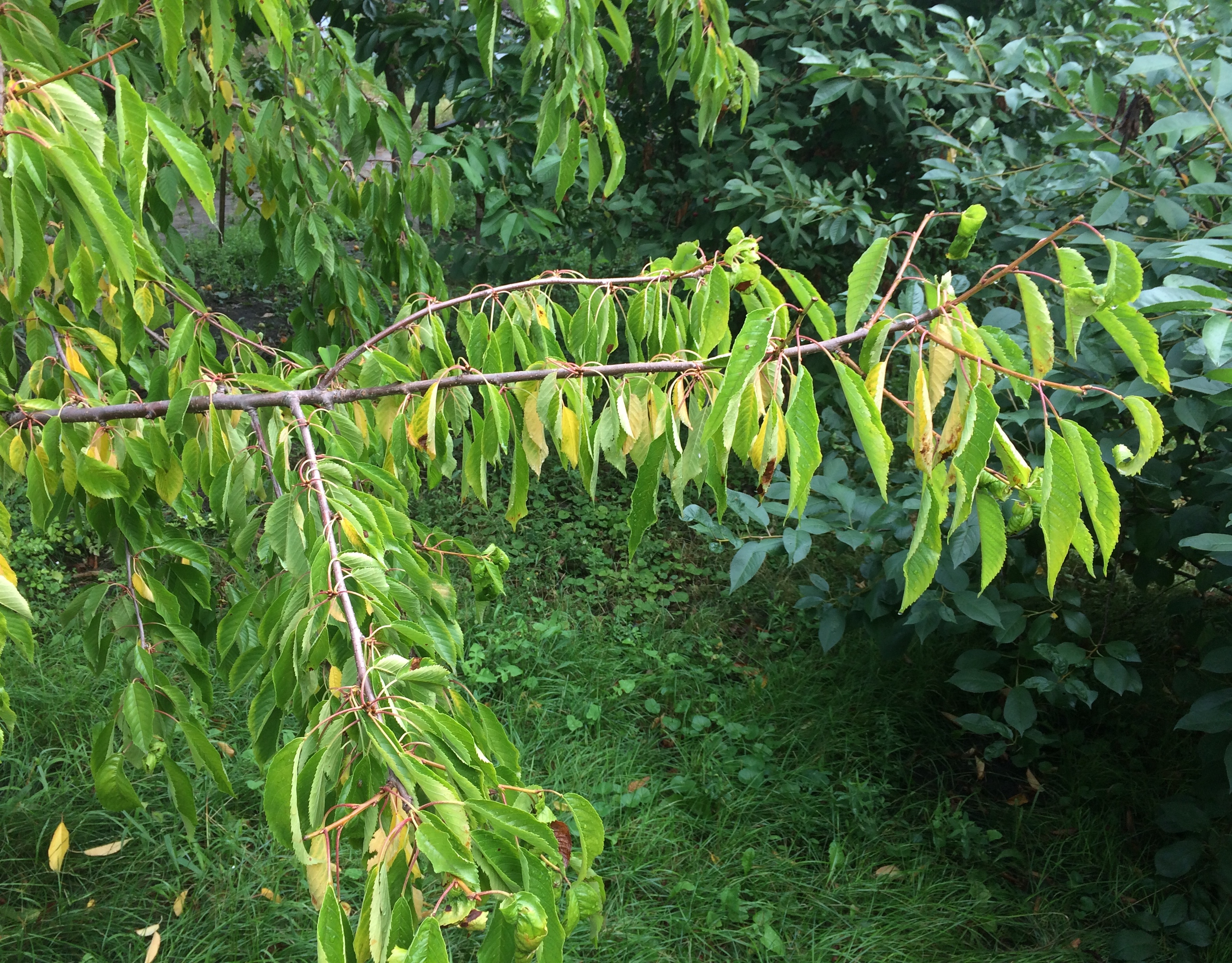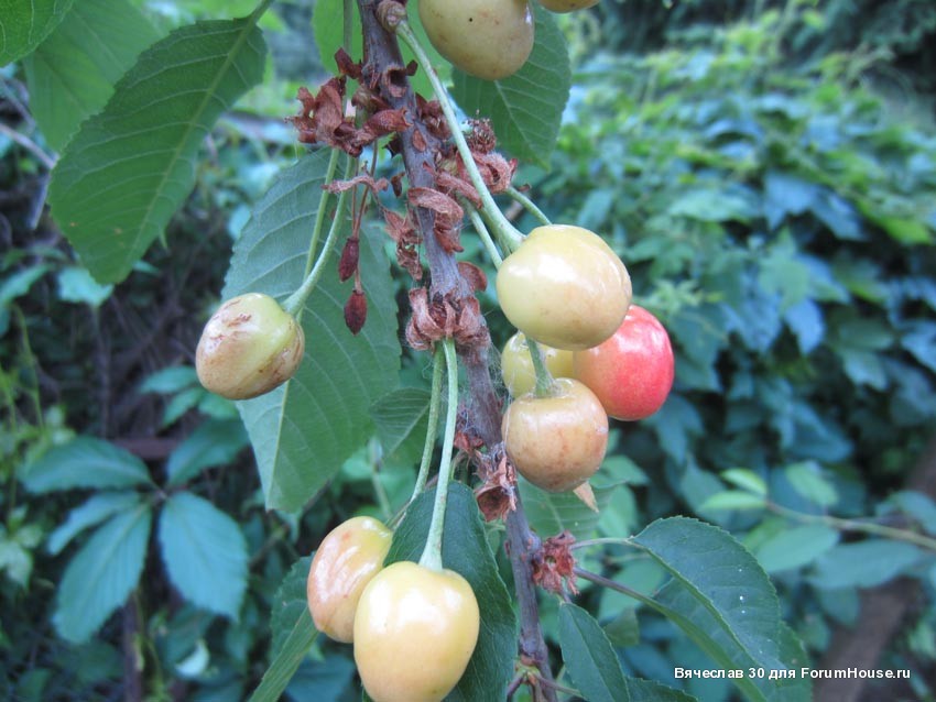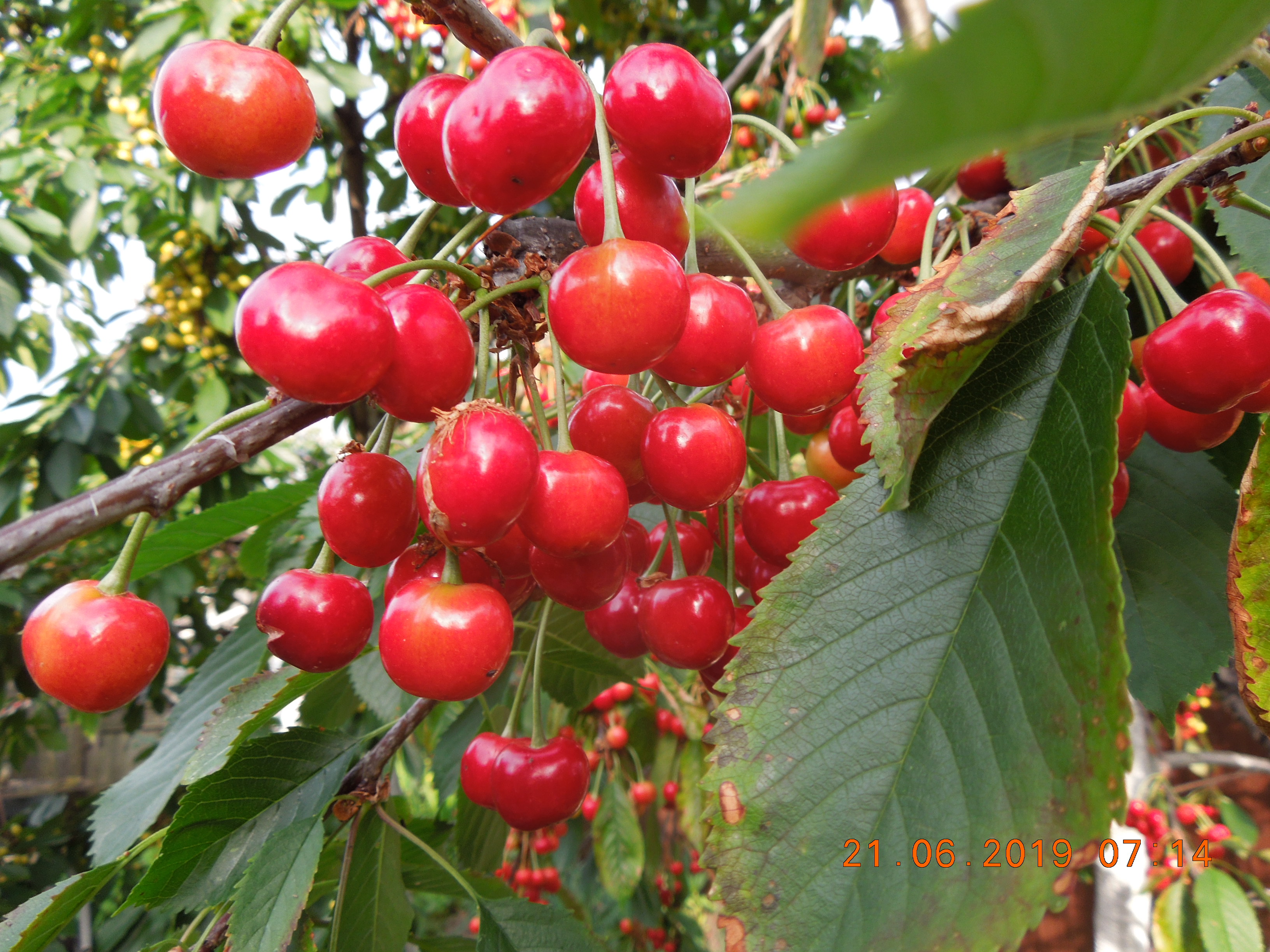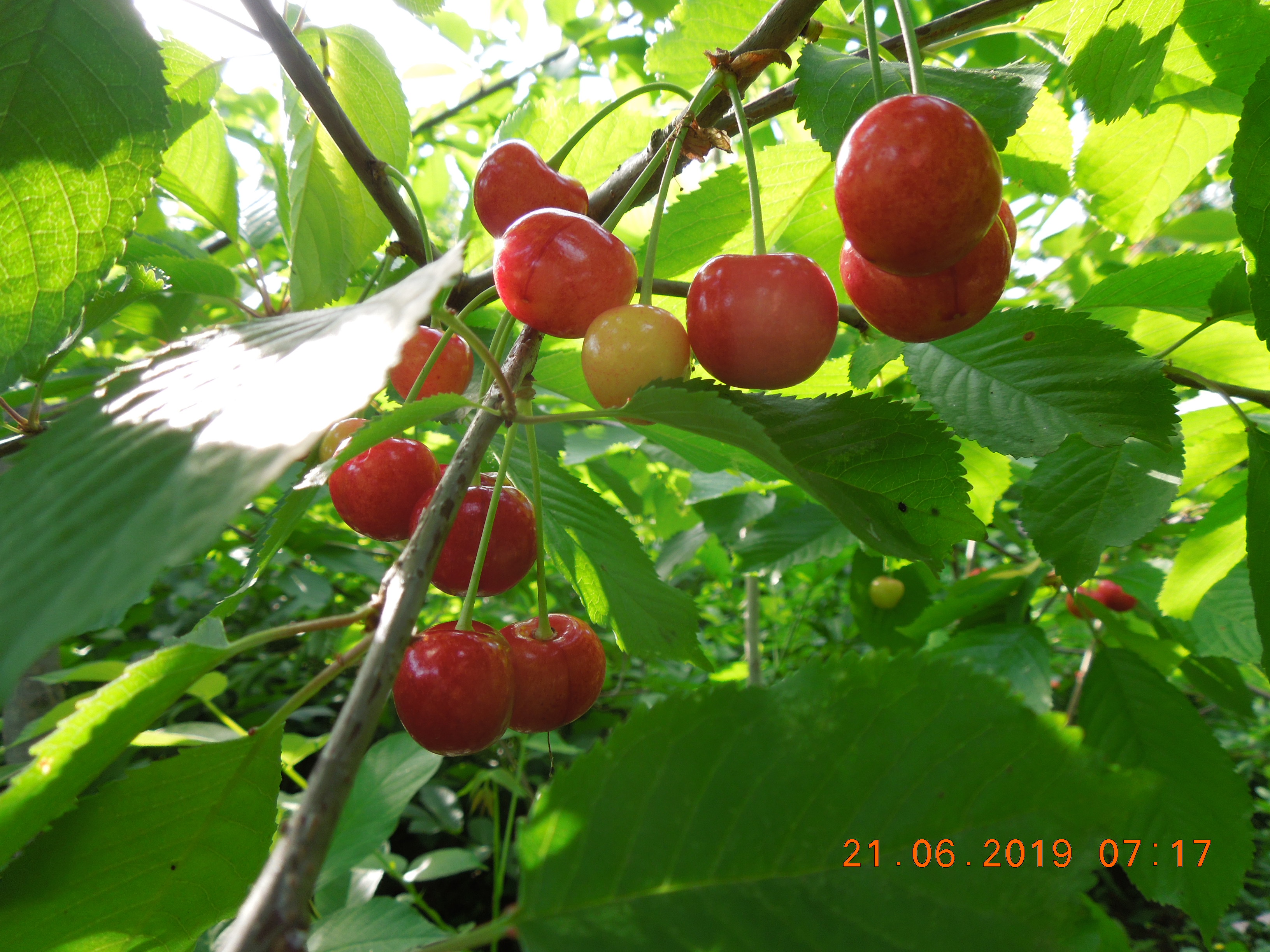 Одно дерево оказалось явным пересортом, но зато ранние ягоды, красные... воооот... из-за которых вечная война с дроздами. Успеваем собрать только внизу, верх объедается в стадии зелено-розовых ягод.