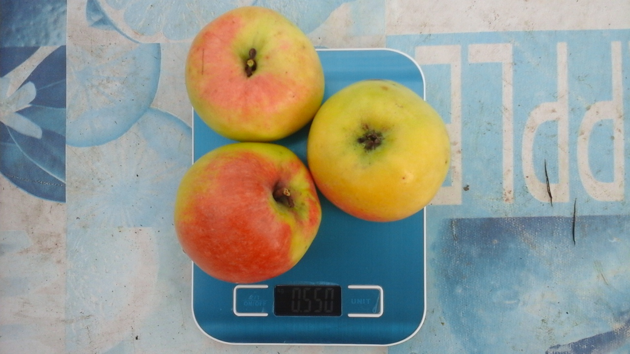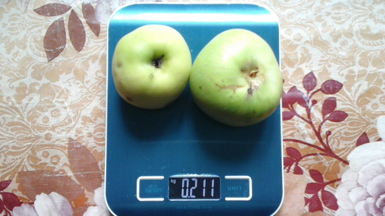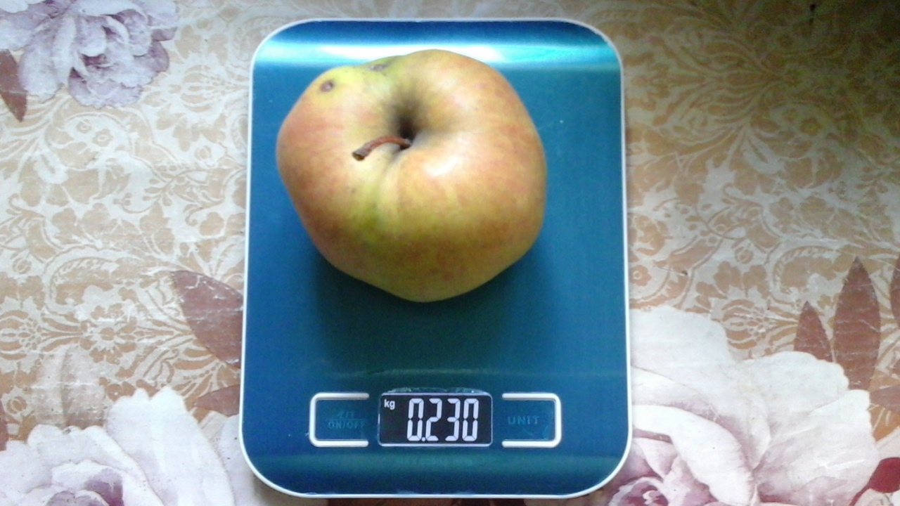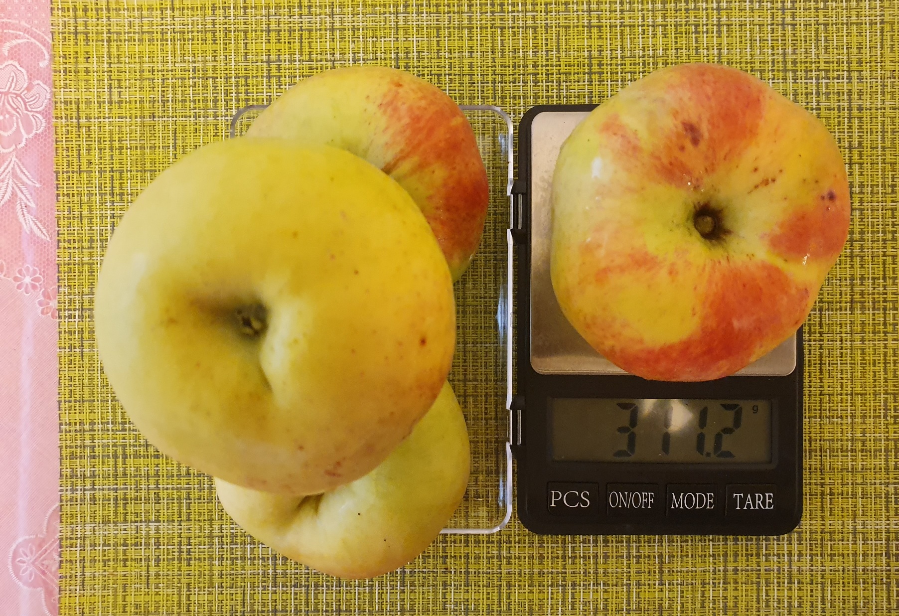 Родниковая Яблоки не очень крупные. То что на фото - 174 г. Думаю большая часть будет в диапазоне 120-150 г. Внешне очень красивое, держится прочно, оторвал с трудом. По вкусу не понравилось. Вкус чисто сладкий, без кислинки и основная претензия - мякоть чрезмерно сухая. На фоне ХК это просто провал.
