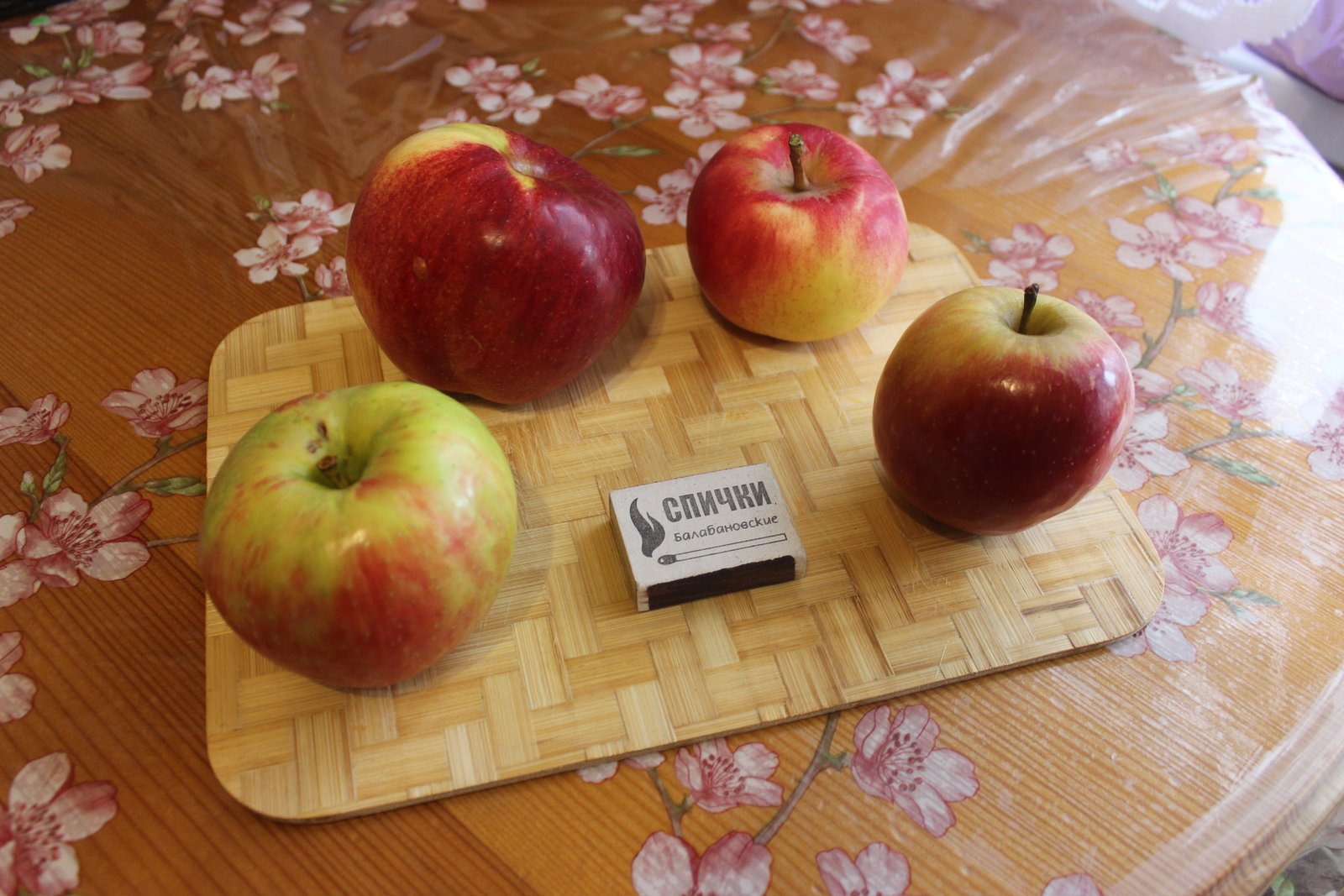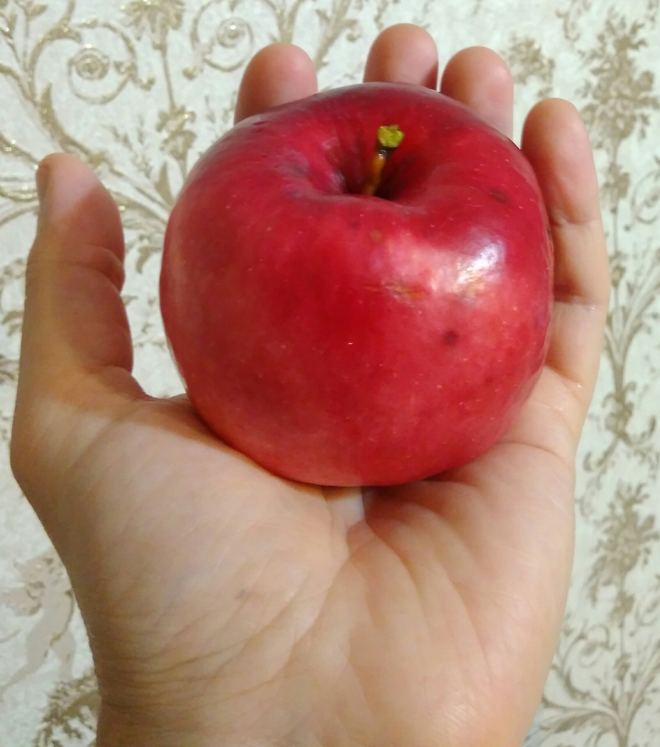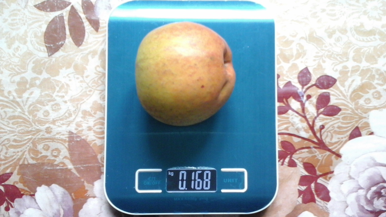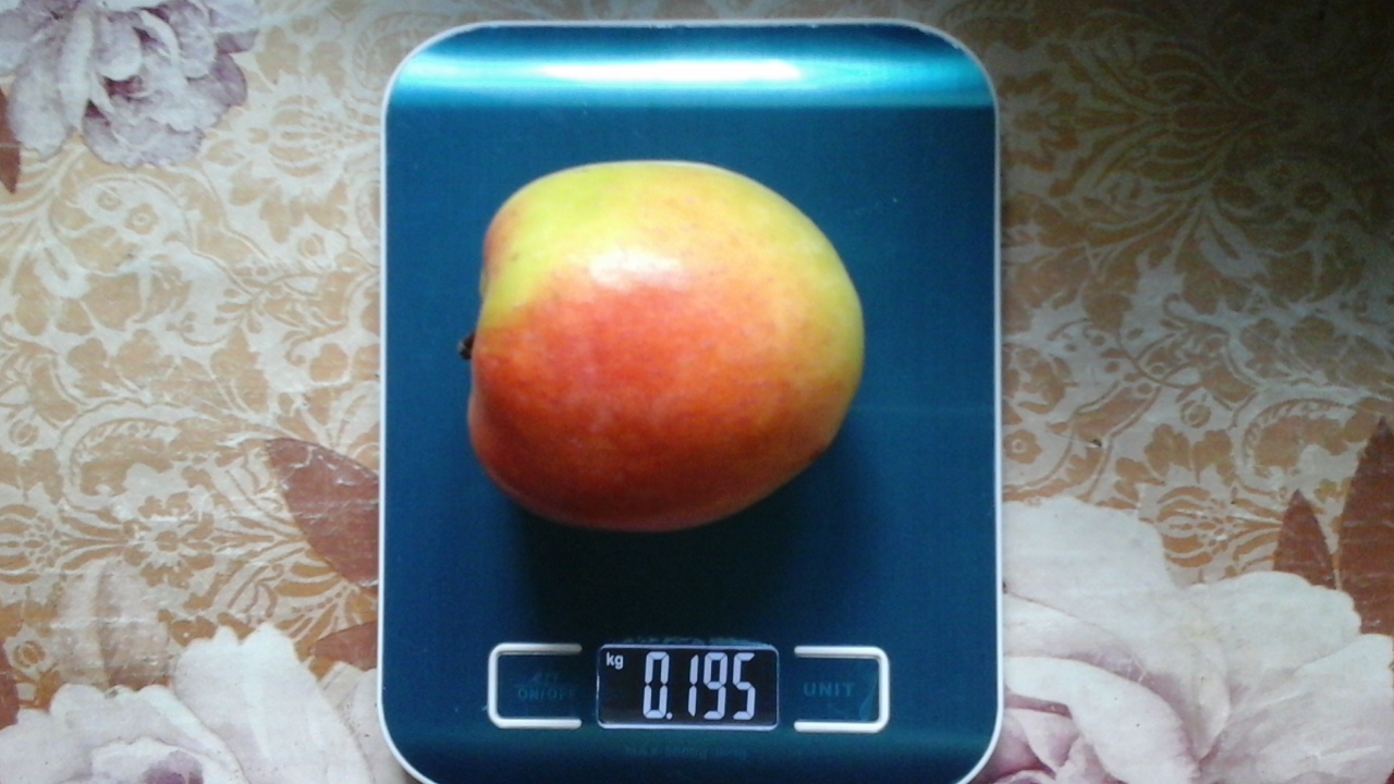Родниковая Яблоки не очень крупные. То что на фото - 174 г. Думаю большая часть будет в диапазоне 120-150 г. Внешне очень красивое, держится прочно, оторвал с трудом. По вкусу не понравилось. Вкус чисто сладкий, без кислинки и основная претензия - мякоть чрезмерно сухая. На фоне ХК это просто провал.