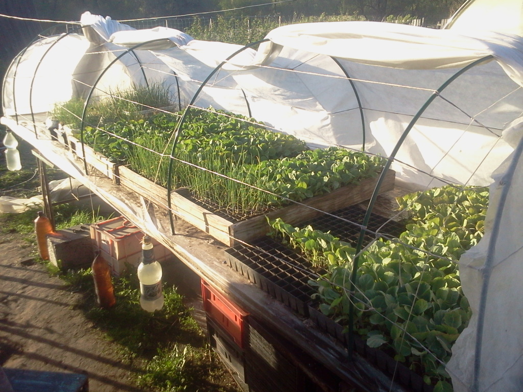 Я высадила капусту под пятилитровые бутылки, такая же история. У нас похолодание, придется сеять дома, а места-то все заняты.
