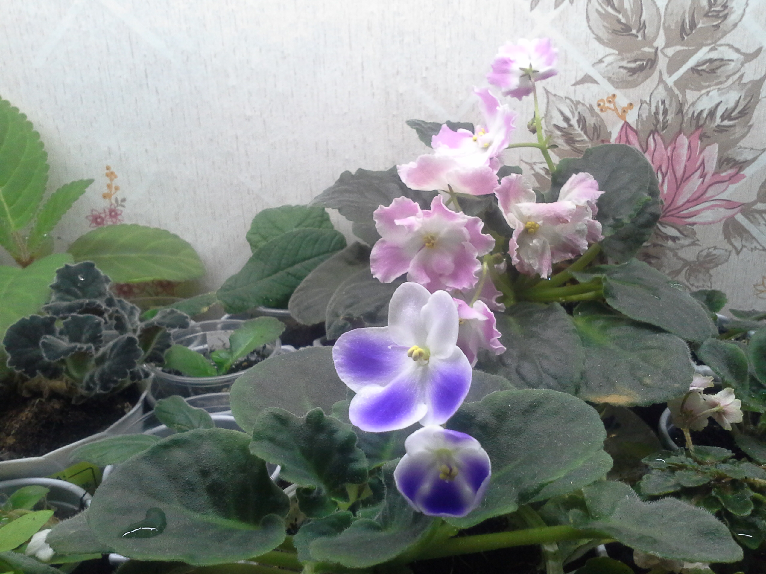 Это мои цветущие сенполии, есть ещё, но они из деток, пока массу наращивают.Розовая-ЛЕ Мамина улыбка, а синяя с белым не знаю, как называется.И вот беда.Доченька моя решила, что кустики загущены, листьев очень много.И, пока я на даче была, обрезала почти все листочки, оставила по три штучки и цветоносы с цветами.И вот от этого (больше не на что подумать, всё было по-прежнему) двуцветная уже погибла, а Мамина улыбка на грани умирания.Обрезанные листочки выкинула, зачем, у нас же взрослые растения есть.От Маминой улыбки уже и листика не взять на укоренение, уже коричневые.Рядом стоящие молодые сенполии стоят зелёные, крепкие, так что на заразу какую-нибудь я не думаю, только на кардинальную стрижку.