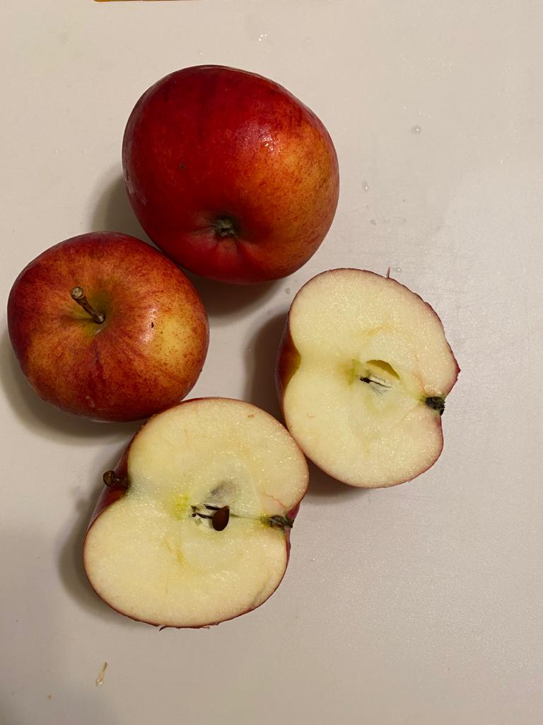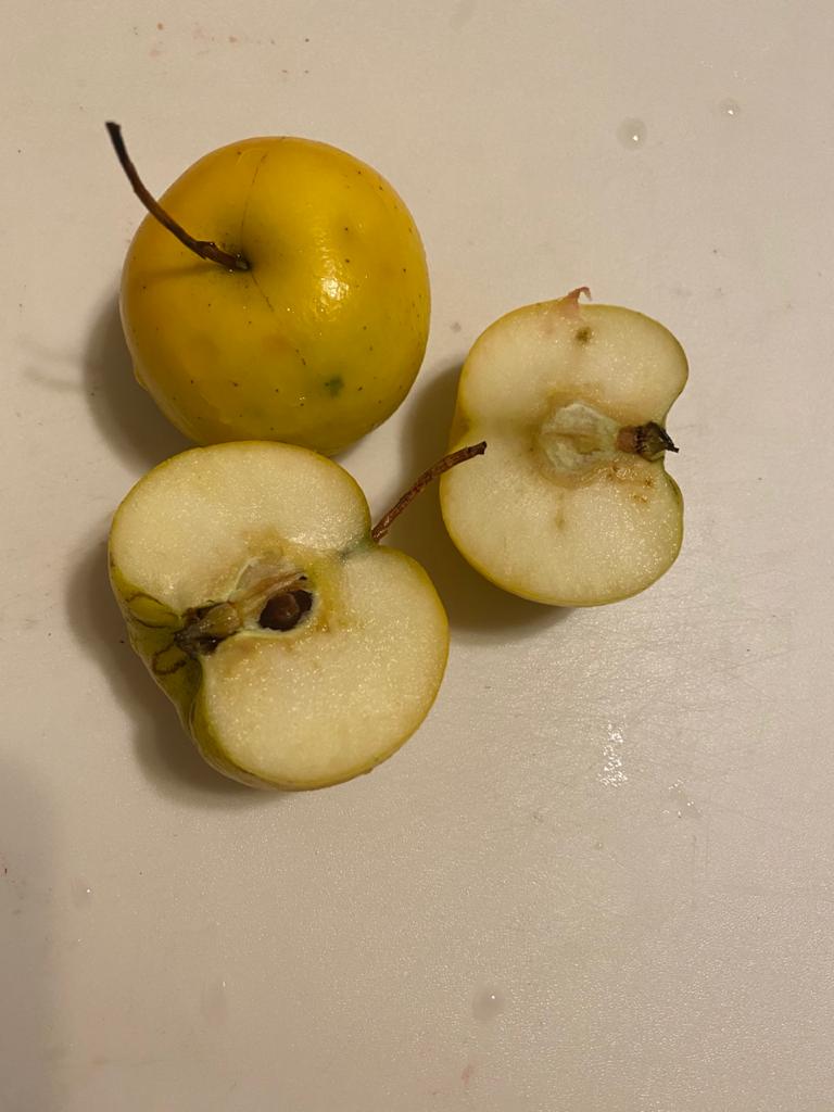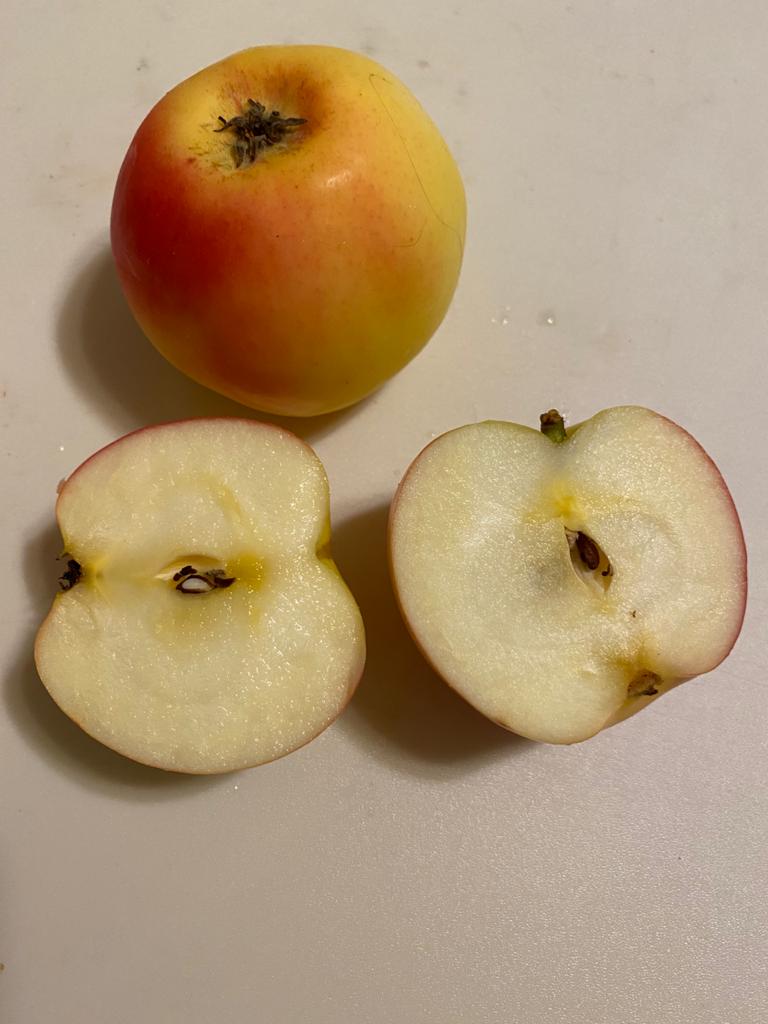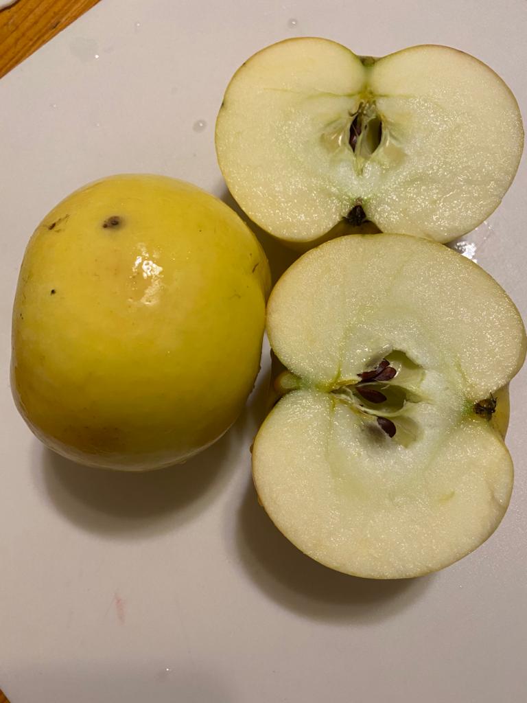 1) Лукомор – самое вкусное из списка. Размером с Пинову, и формой похож. Первый укус – как советский лимонад Дюшес. Ностальгия. Одно съела, и еще хочется. Желтоватая плотная, но не грубая мякоть, консистенцией похожа на Пинову. Тонкая для зимнего яблока шкурка.
