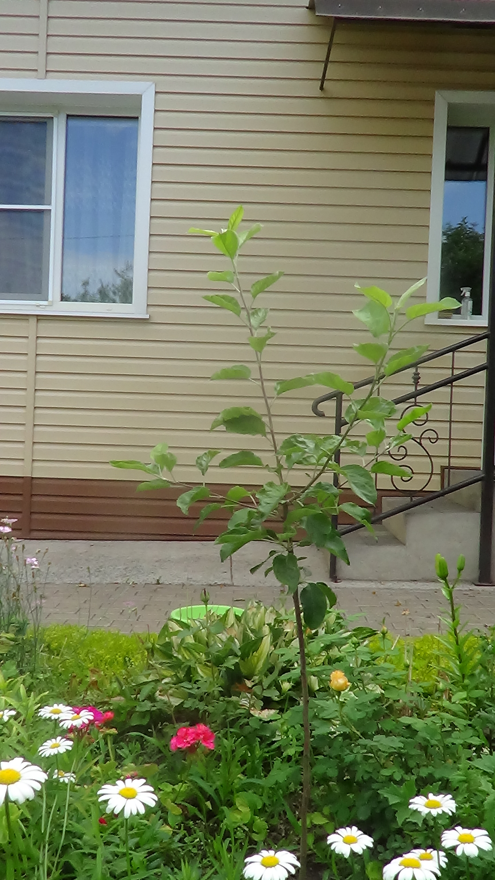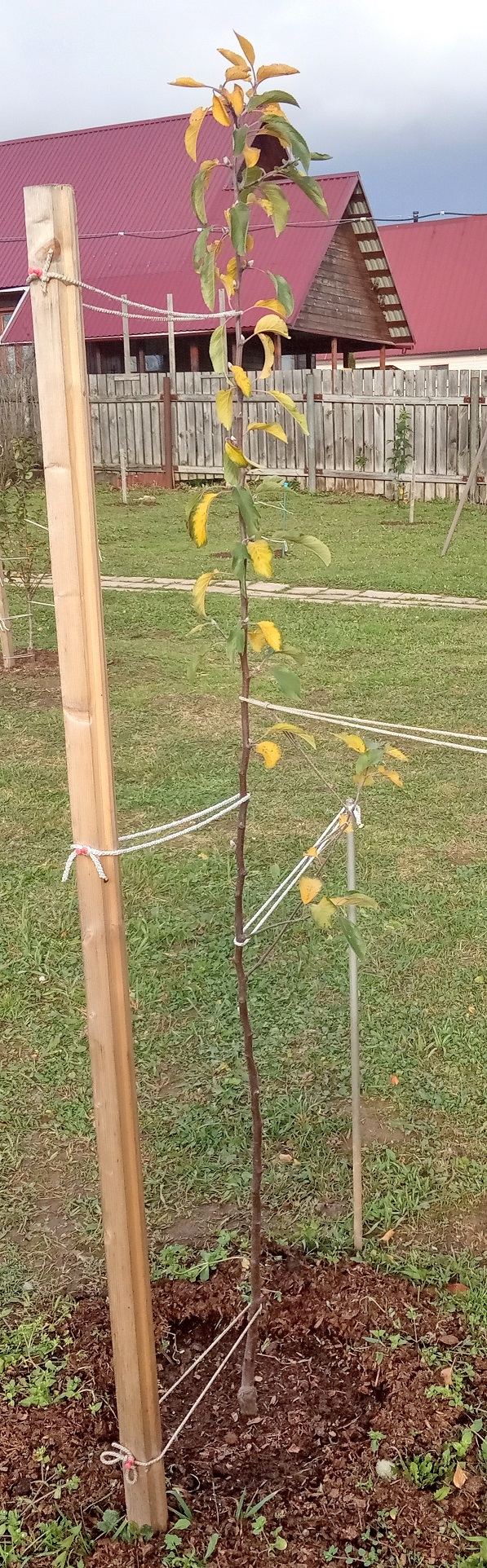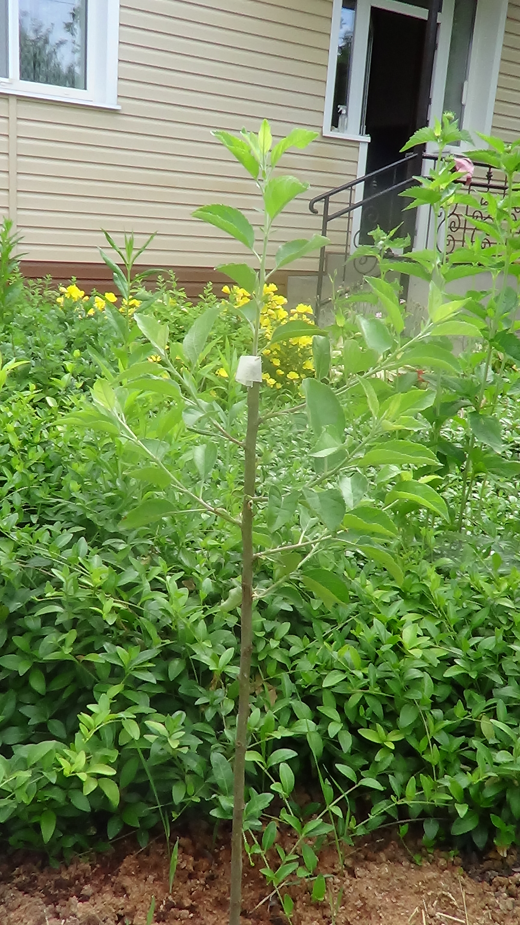 признакам, совсем другой пока неизвестный мне сорт (надеюсь, что на форуме помогут определить название). На момент посадки саженец выглядел следующим образом: высота около 160 см, проводник был похож на змейку (пришлось растяжкой более-менее его выпрямлять), веток было всего две и то одна свисала тонким ивовым прутиком к земле (такие обычно обрезают, но за неимением других я ее подвязал к растяжке под углом 45гр., чтобы вернуть ее к росту. Забегая вперед скажу, что эта веточка "подарила" мне одно из двух яблок этим летом). По неизвестным мне причинам девять веточек были удалены с яблони, так что издалека яблоня напоминала колоновидную. Поэтому встал вопрос, что нужно было предпринять, чтобы яблоня начала обрастать ветками. Мысли витали от кербовки до обрезки на обратный рост. Но, похоже, яблоне так понравилось новоселье