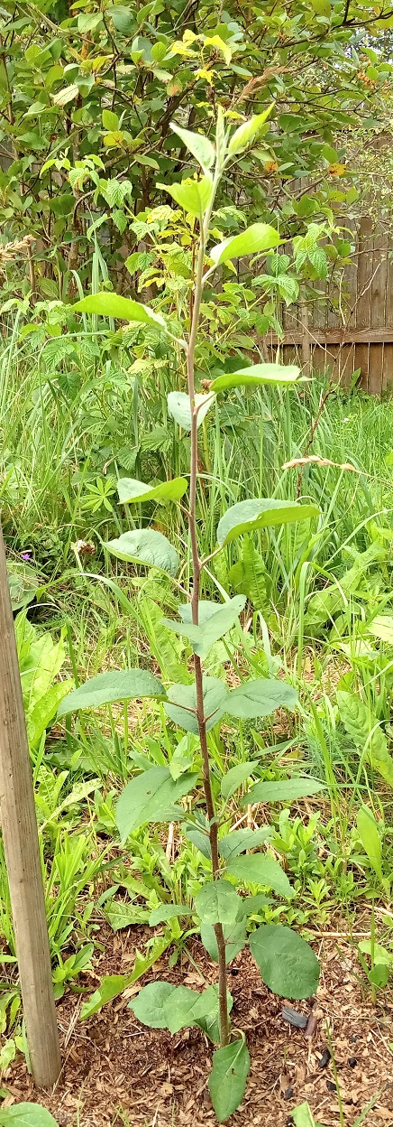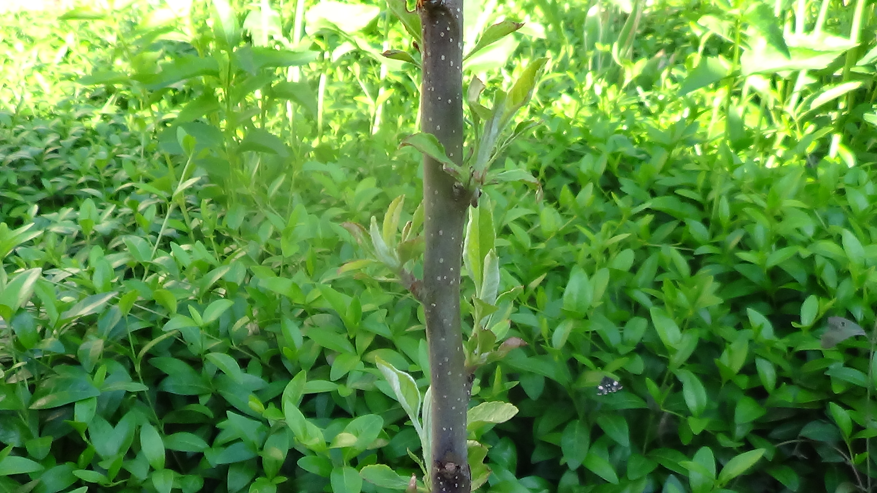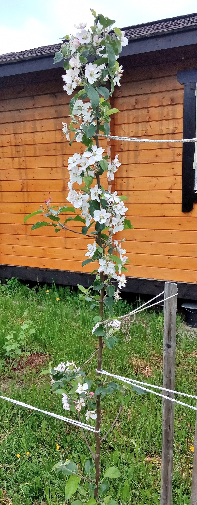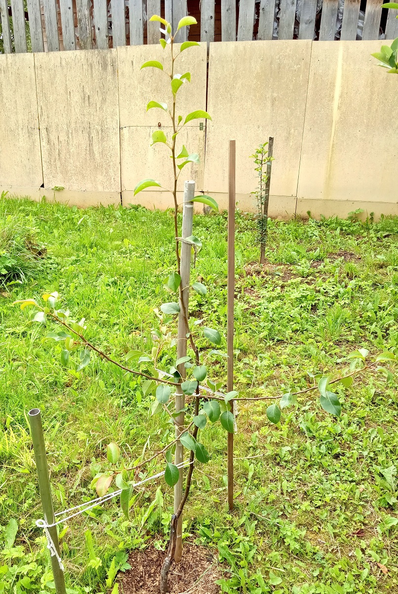 признакам, совсем другой пока неизвестный мне сорт (надеюсь, что на форуме помогут определить название). На момент посадки саженец выглядел следующим образом: высота около 160 см, проводник был похож на змейку (пришлось растяжкой более-менее его выпрямлять), веток было всего две и то одна свисала тонким ивовым прутиком к земле (такие обычно обрезают, но за неимением других я ее подвязал к растяжке под углом 45гр., чтобы вернуть ее к росту. Забегая вперед скажу, что эта веточка "подарила" мне одно из двух яблок этим летом). По неизвестным мне причинам девять веточек были удалены с яблони, так что издалека яблоня напоминала колоновидную. Поэтому встал вопрос, что нужно было предпринять, чтобы яблоня начала обрастать ветками. Мысли витали от кербовки до обрезки на обратный рост. Но, похоже, яблоне так понравилось новоселье