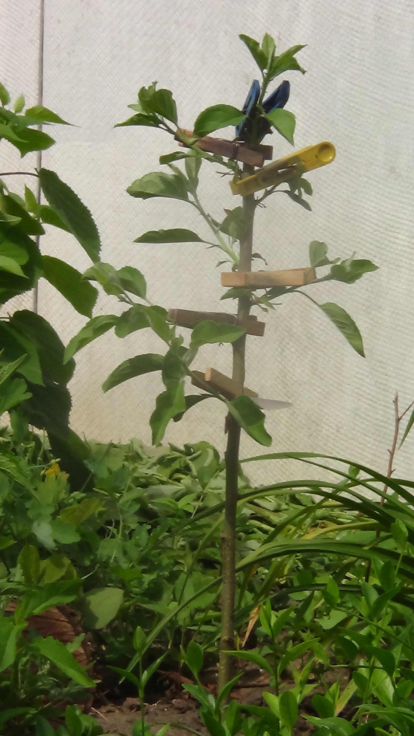 , что в августе она заложила плодовые почки, причем верхняя почка на проводнике тоже была плодовой. Тогда я решил ничего пока не делать и посмотреть, что будет весной в надежде, что многие плодовые почки перейдут в ростовые. В марте уже немного окрепшую подвязанную ветку я обрезал, оставив где-то около 40 см (летом прищипкой разветвил ветку и сейчас она самая мощная на дереве). Проводник трогать не стал, чтобы сдержать начало его роста, а все питание пошло на боковые почки. Правда пришлось обрезать небольшую плодовую веточку,выросшую рядом с верхней почкой проводника, опасаясь, что она перехватит питание и возьмет на себя роль проводника. К слову сказать, на яблоне ни разу пока не обрезался проводник. В общем, надежды оправдались и часть плодовых почек плавно перешла в ростовые, что мне и требовалось. Помогло еще и то, что яблоня склонна к загущению кроны и веток наросло даже сверх того, что требовалось. Всем я им придал с помощью зуботычек прямой угол отхождения, кроме той, на которой завязалось верхнее яблочко. Понадеялся, что под ее весом ветка немного опустится. Но ветка стала расти быстро и мощно и "гирьку" в виде яблока даже не почувствовала. В кроне проглядываются "пролысины" из-за удаленных в питомнике веточек, но, я думаю, что со временем они вырастут. Яблоня растет быстро и очень отзывчива на зеленые операции.