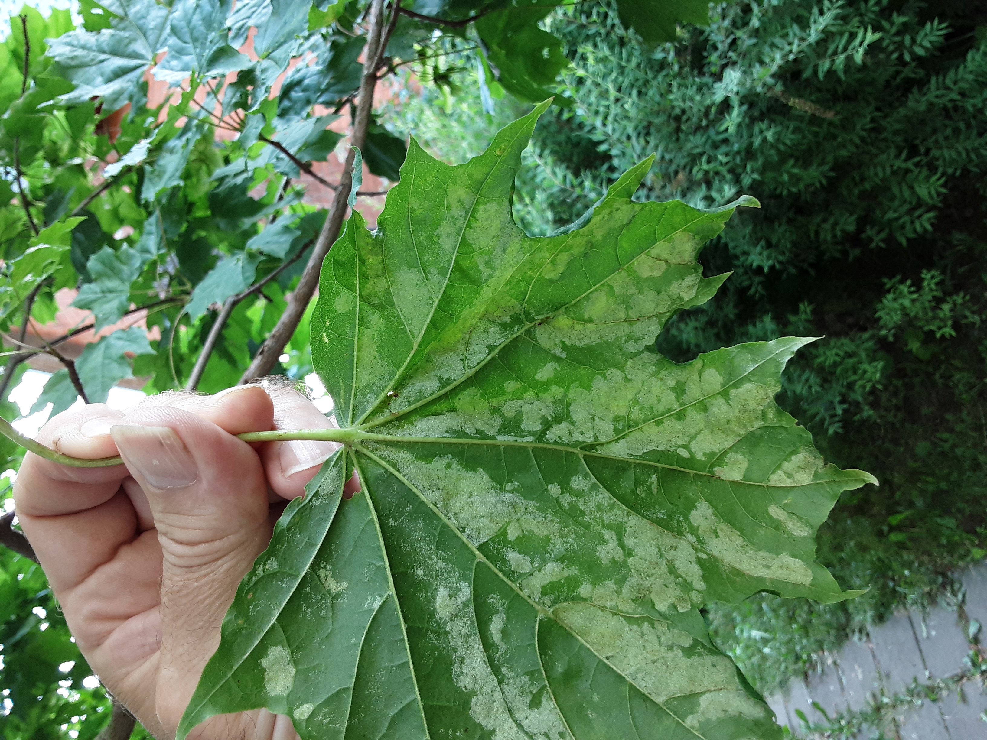 На листьях клена выступил "сахар". Подозреваю, от жары и сухости. Боюсь, как бы не сели сапротрофные грибы на сахар. Опрыскивать, нет? Ни у кого не было?