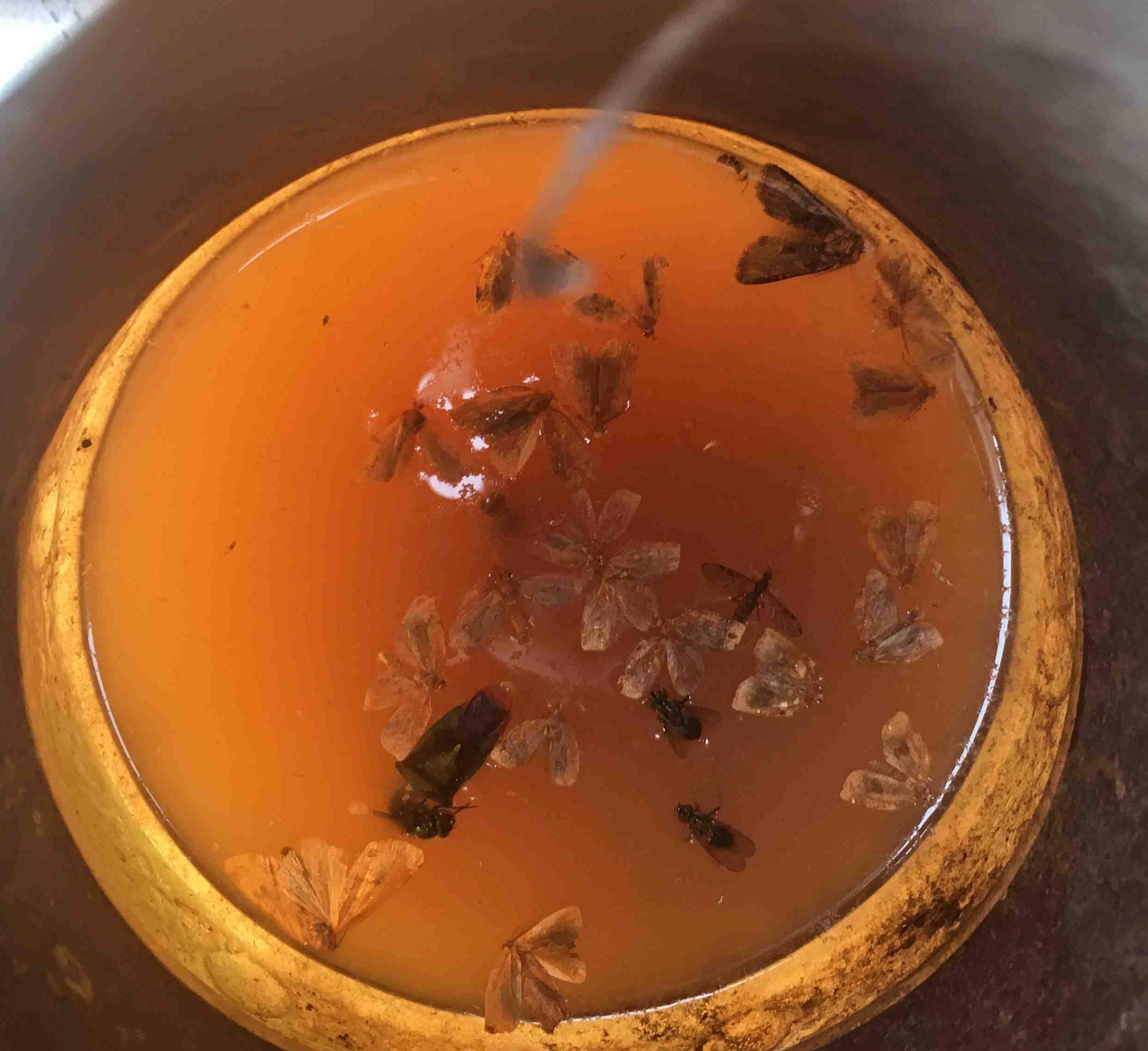 Я второй год вешаю на сливу и яблоню ведерки из ПЭТ бутылок с бродячей жидкостью. Разная дрянь топится. Много совок. Когда пойдёт ежевика, там я вешаю пяти литровые реакторы для мух и ос. Вот сливовое ведёрко.