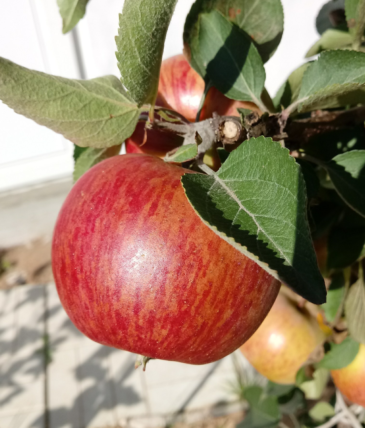 Яблочко выглядит и зимой (на фото еще листья на дереве) очень позитивно - нарядное яблочко.