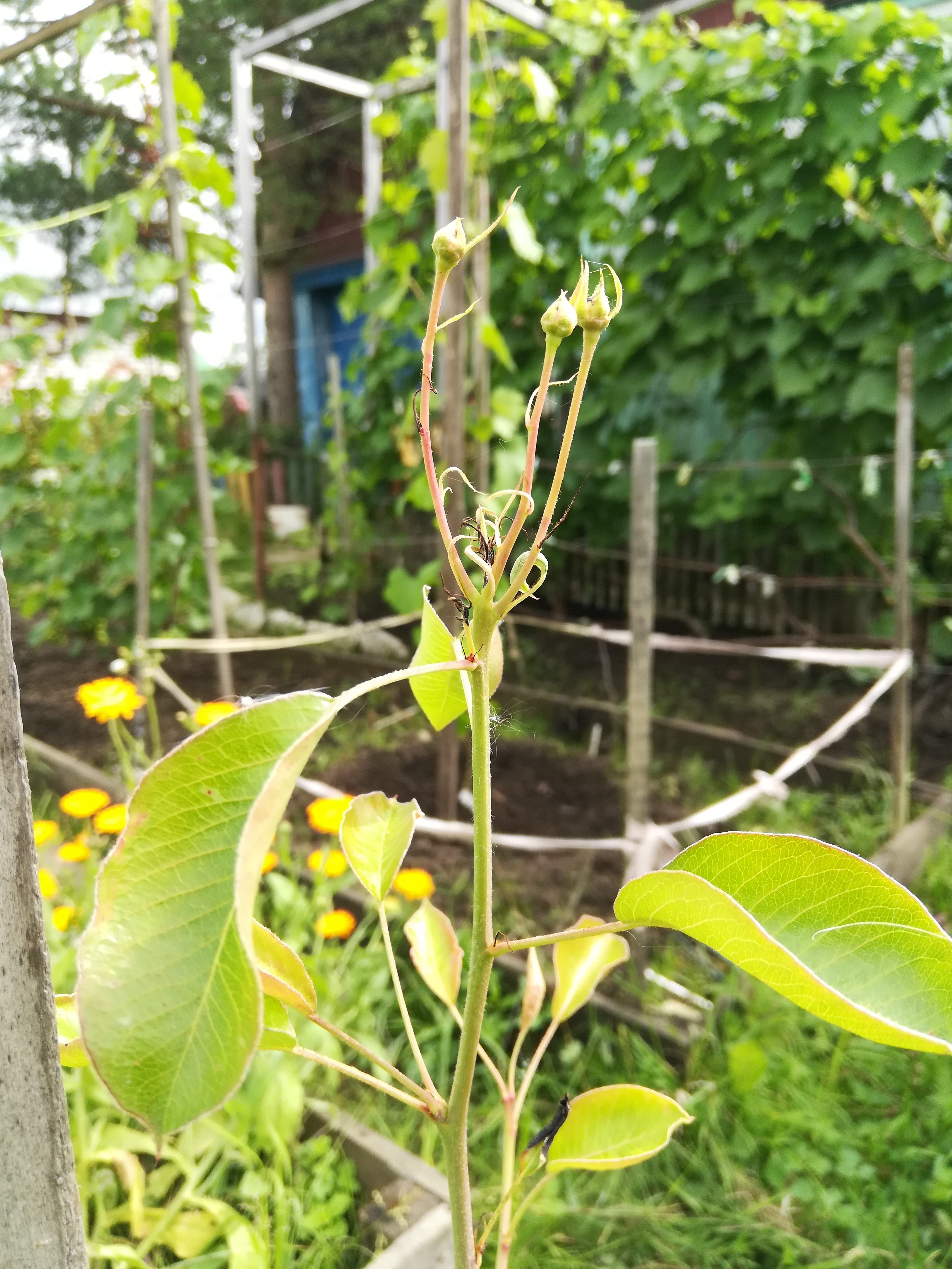 Доброго времени суток! В прошлом году осенью посадил саженец груши "кафедральная". В этом году по весне появились листочки, но кто-то съел макушку. Не каких признаков дальнейшего роста. Во второй половине июля неожиданно появились побеги. А в августе на макушке появилось непонятное соцветие. Что это может значить?