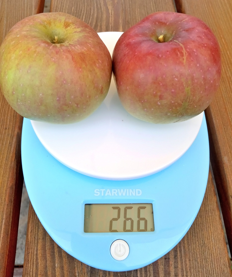 Черешок средней длины, яблочки тоже среднего размера: диаметр - 5,5 см (по экватору), вес - 73 гр. (примерно все одинаковые). На вкус очень нравятся - очень вкусные, сладкие, когда спелые - янтарно-прозрачные и с соком в серединке (тем, кто любит кислые и твердые яблоки, точно не понравятся). )))