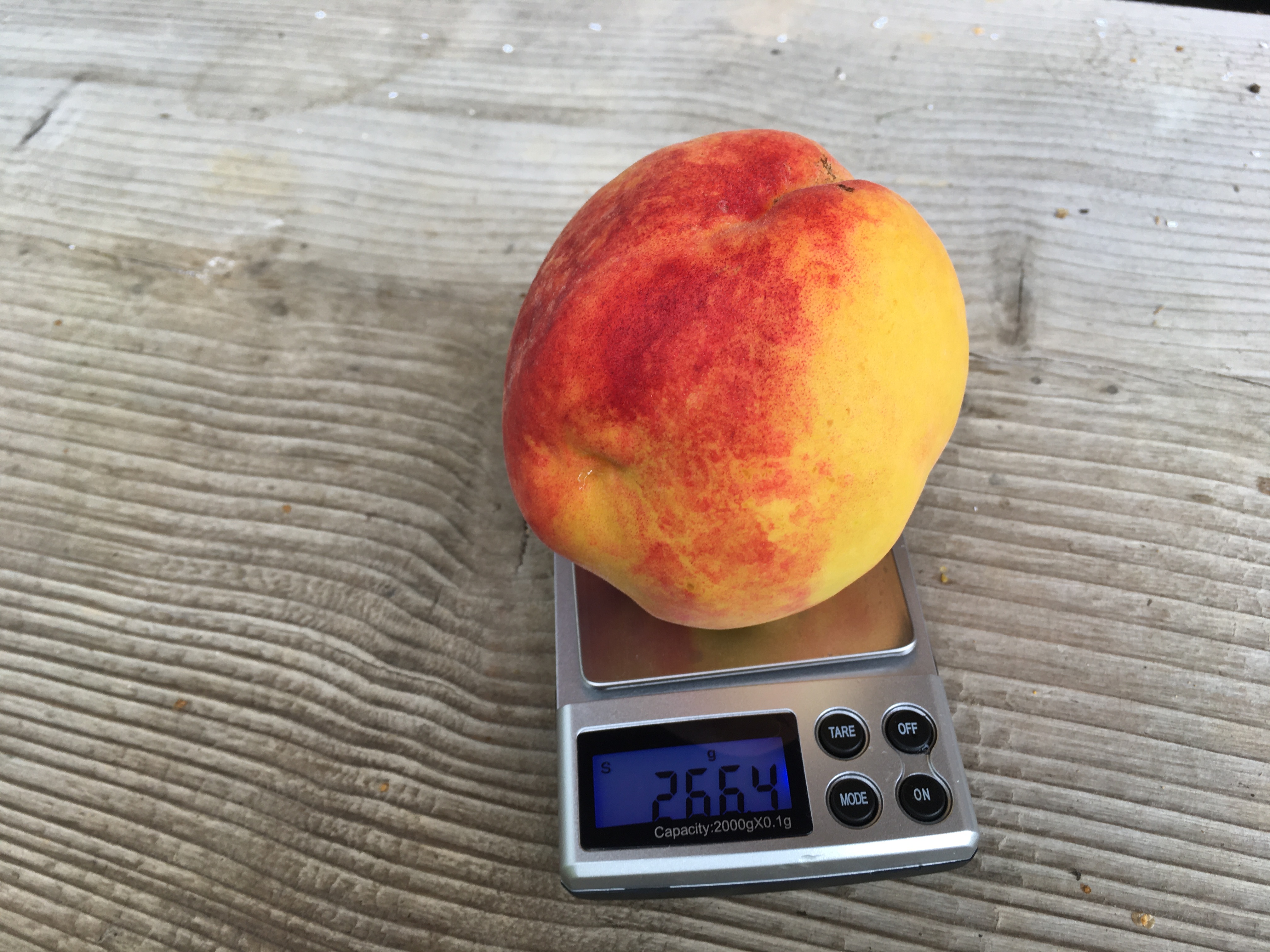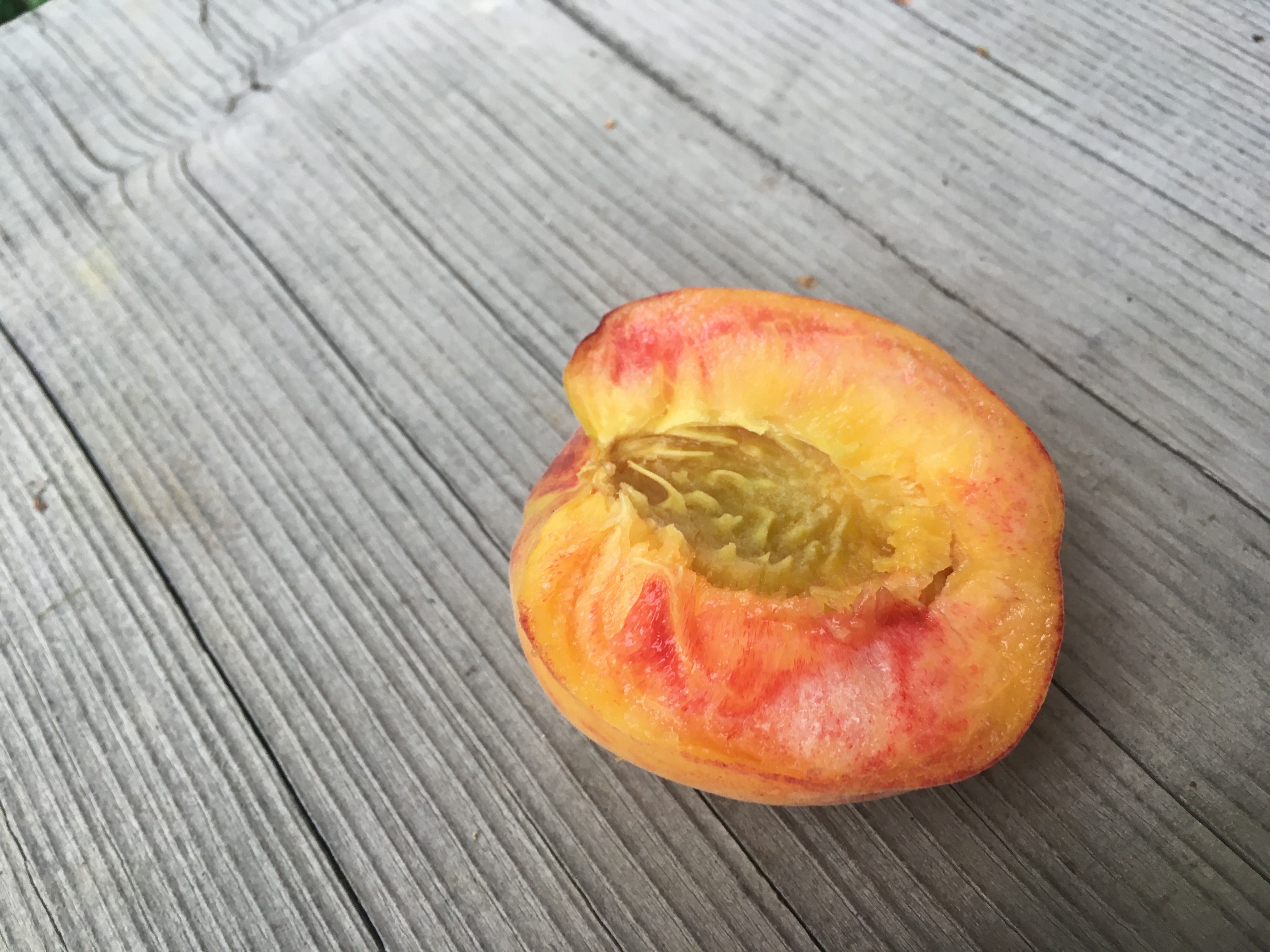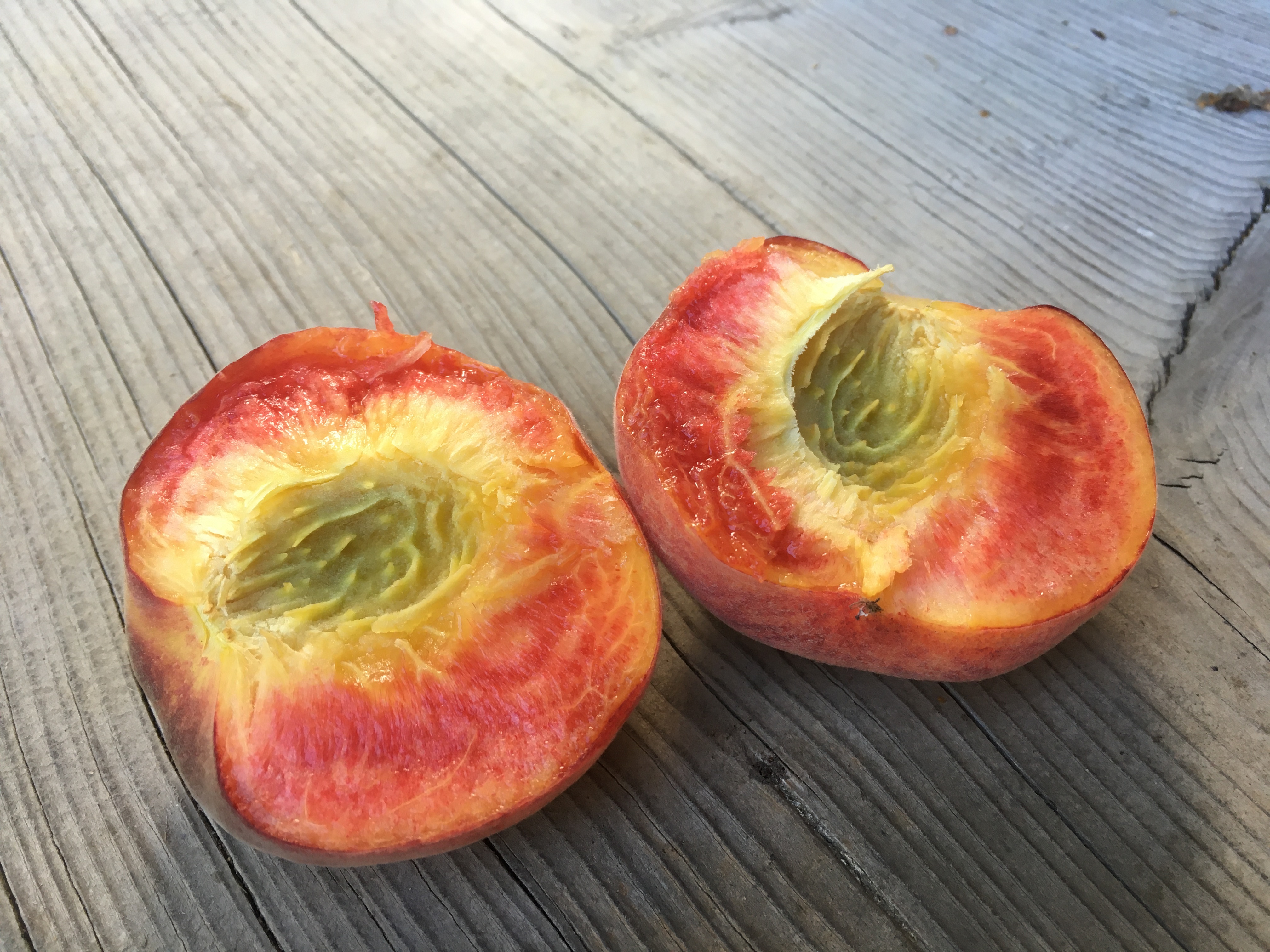 Персик Лойко можно было начинать есть чуть раньше неИскры, как писал ранее, беломясый сорт, но, из-за достаточно высокой устойчивости к курчавости, до прореживания завязей руки не дошли, в результате получил около 5 кг плодов массой примерно по 30-70 грамм. Плоды так же окрашиваются полностью в красный цвет, кожица также легко снимается, косточка зрелых плодов отделяется от мякоти. Вкус сладкий.