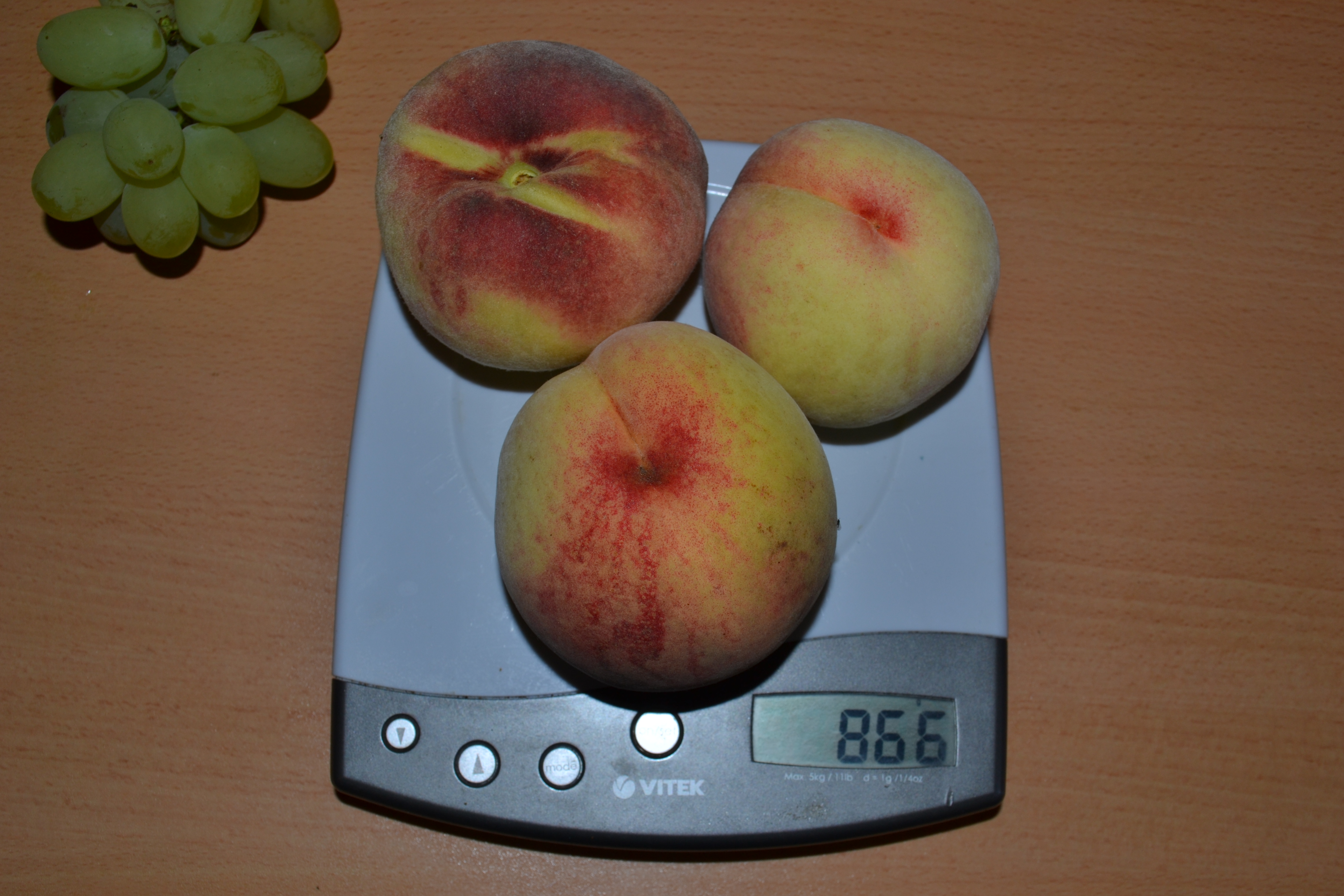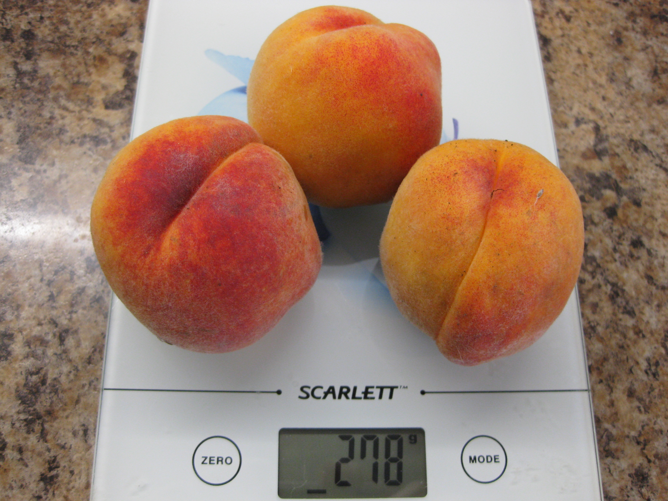 С начала второй декады августа начал зреть сорт Триумф, так же не соответствующий литературному описанию. Также желтомясый сорт, но, в отличие от неИскры, плоды неТриумфа слегка сжаты по высоте. На солнце также полностью окрашиваются, кожица также легко снимается, косточка также отделяется. Вкус сладкий, кислинка выражена слабее, чем у неИскры.