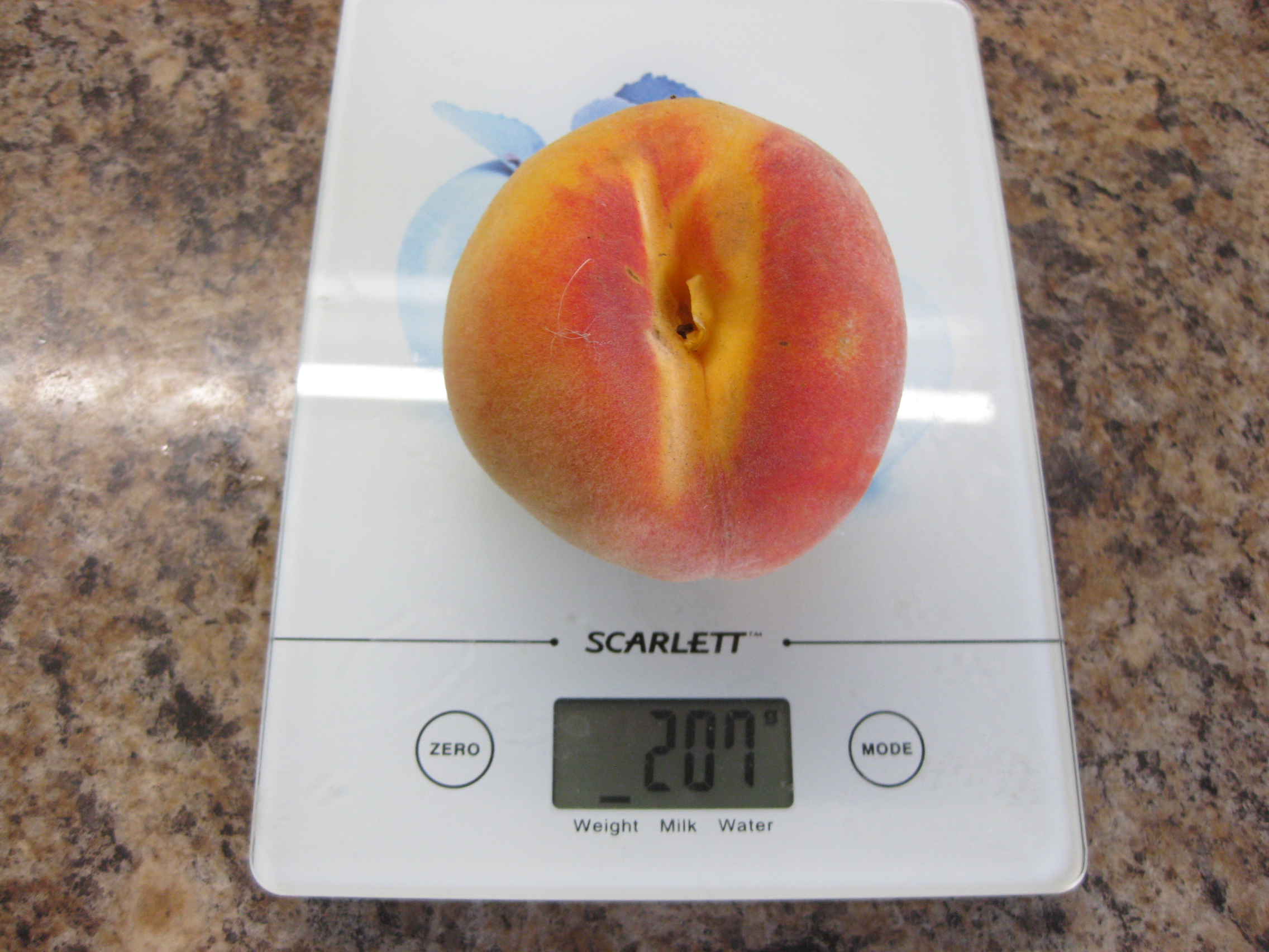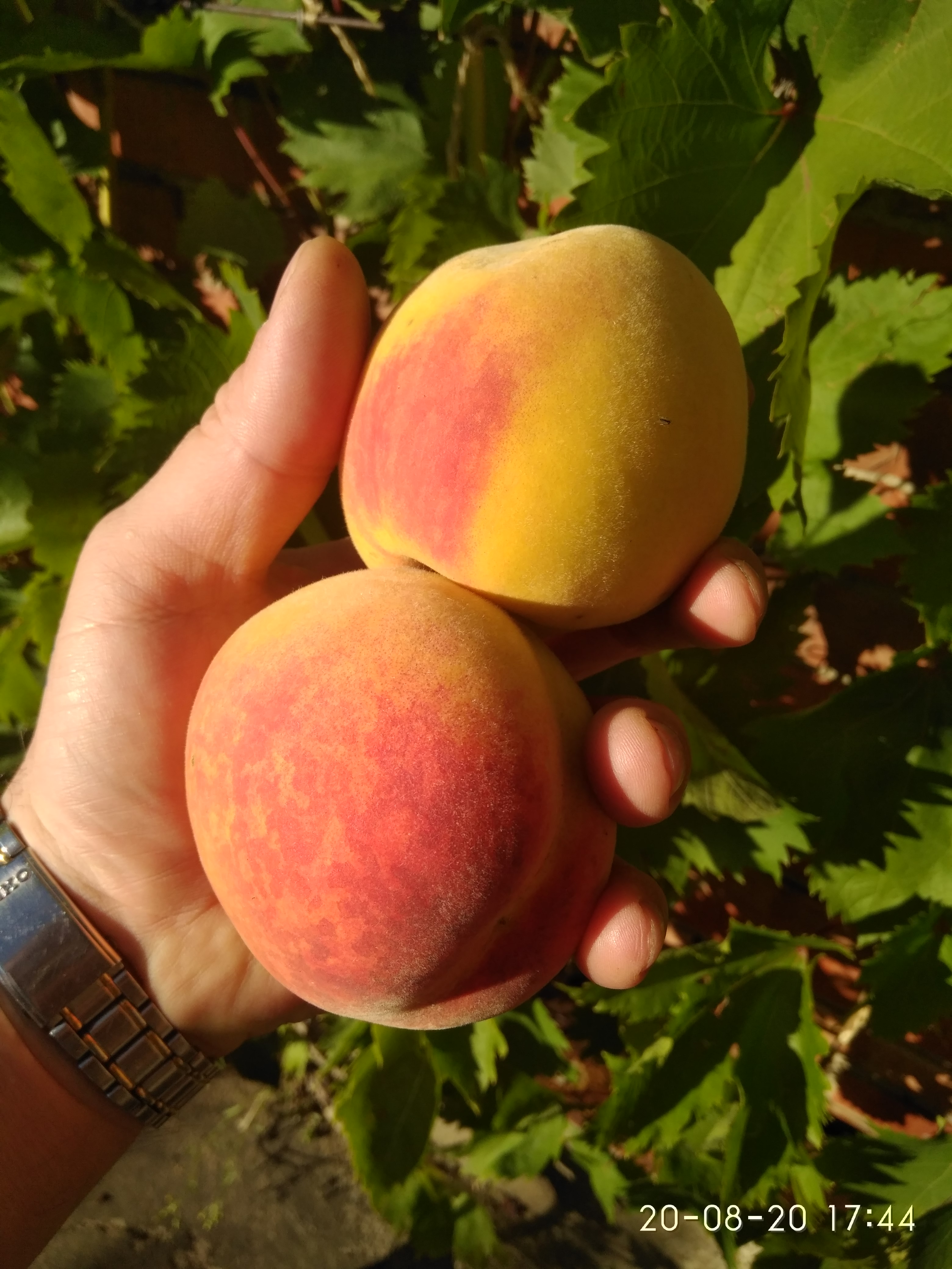Первыми (в первых числах августа) начали зреть Персик Лойко и Искра. Правда к этому моменту я уже знал, что Искра у меня неИскра - не соответствует литературному описанию, оказался сильно восприимчив к курчавости, пришлось даже провести прореживание завязей, оставив около десятка плодов, да и те были мелковаты. Плоды опушённые, желтомясые, на солнце полностью окрашиваются в красный цвет, в тени на жёлтом фоне разлит "мраморный" рисунок, полностью сливающийся на освещённой стороне. У вызревших плодов кожица легко снимается, что очень понравилось ребёнку, да и жене тоже. Косточка отделяется от мякоти, вкус сладкий, с лёгкой кислинкой.