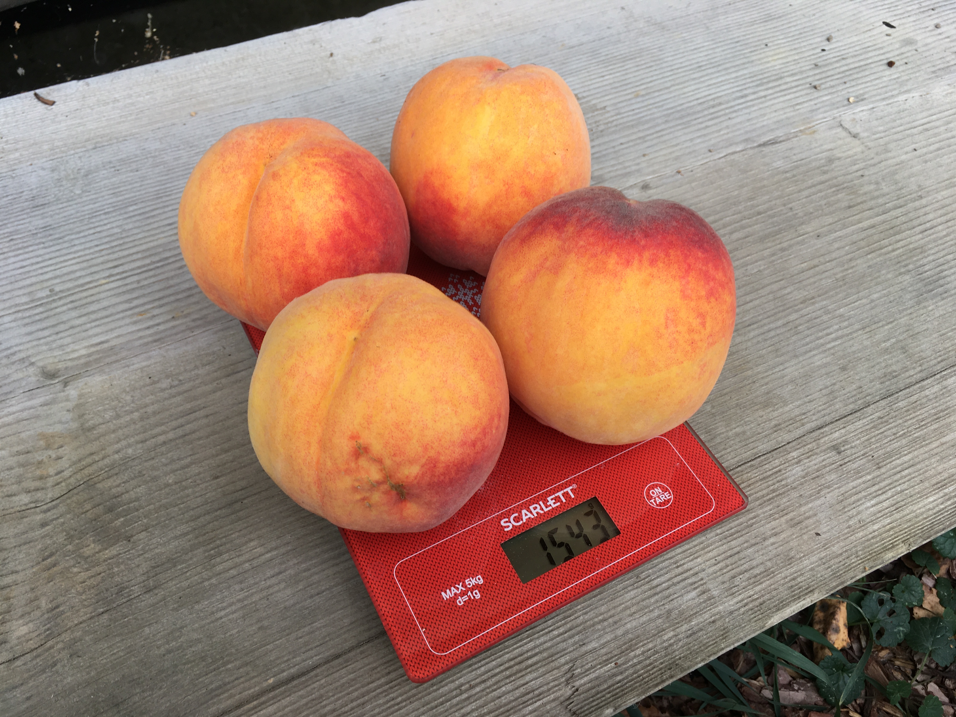Следующим, в середине месяца, начал зреть сорт Реалис. Плоды жёлтые, с загаром, полного окрашивания на них не было, хотя, возможно, виной тому то, что я забыл про него при закладке сада и плодоносил у меня саженец в питомнике, загущённом. Мякоть жёлтая, хорошо отделяется от косточки, кожица отделяется от мякоти, но чуть труднее, чем у предыдущих сортов, на мой взгляд - самое удачное сочетание сладости и кислинки во вкусе.