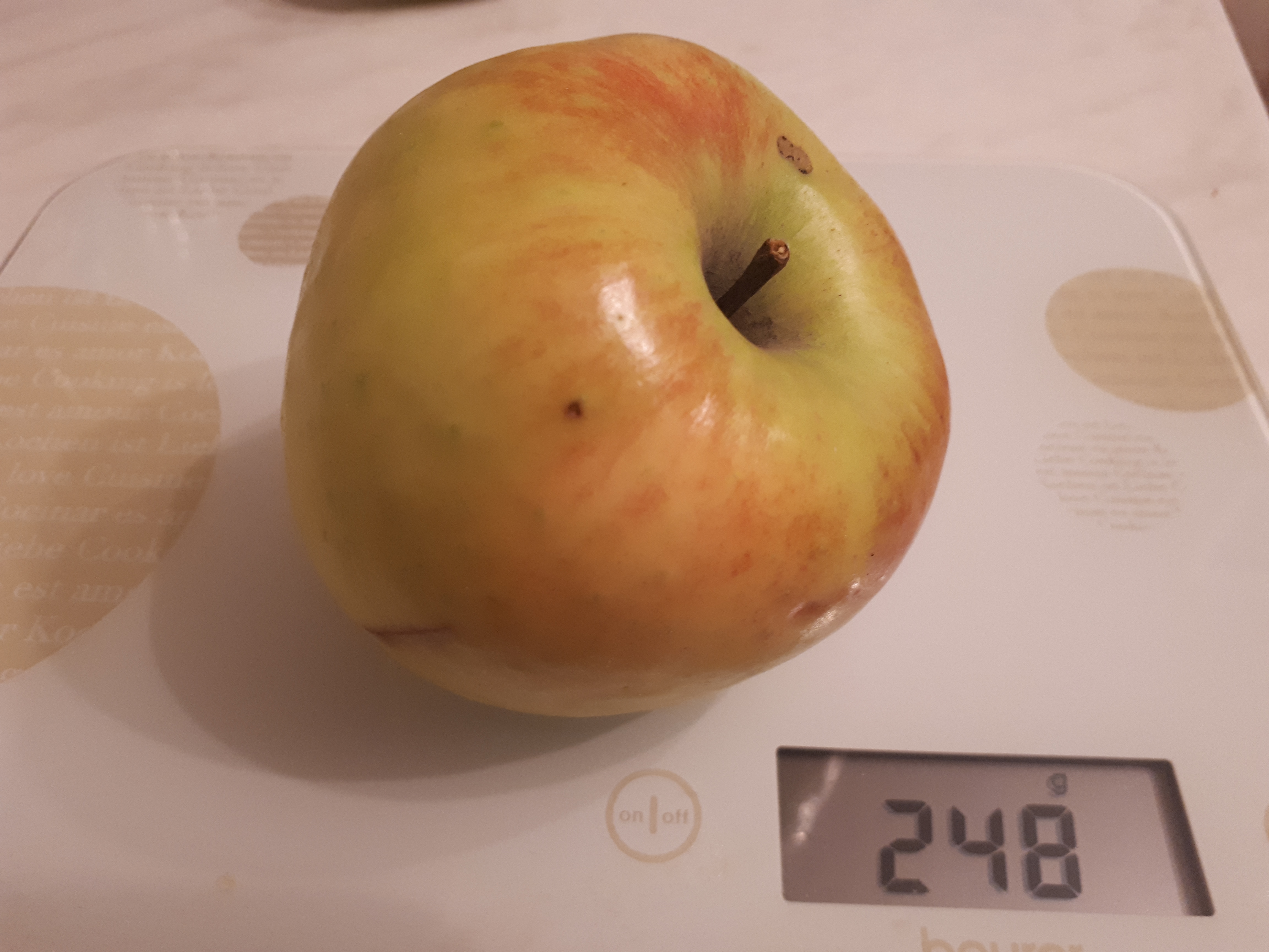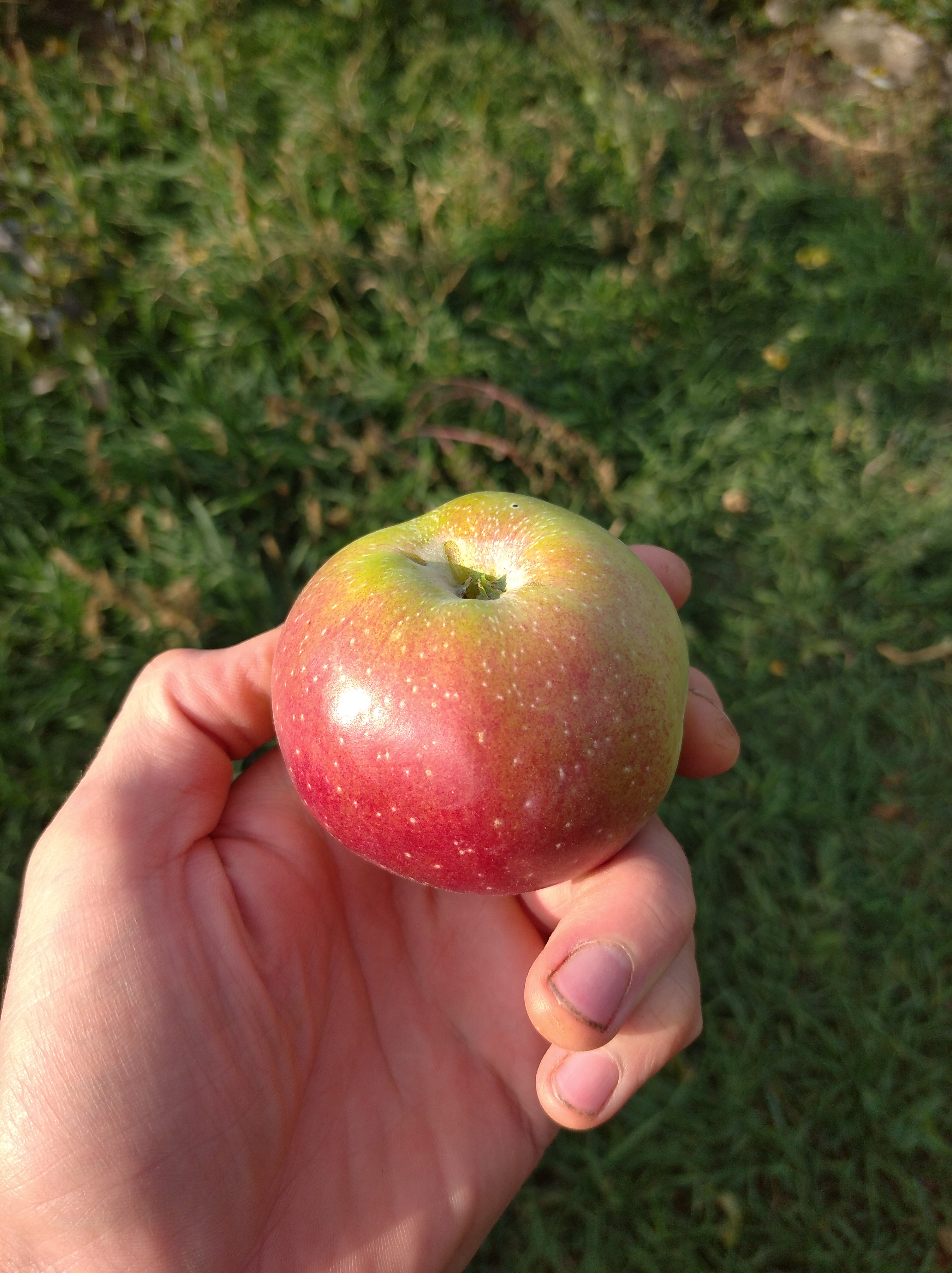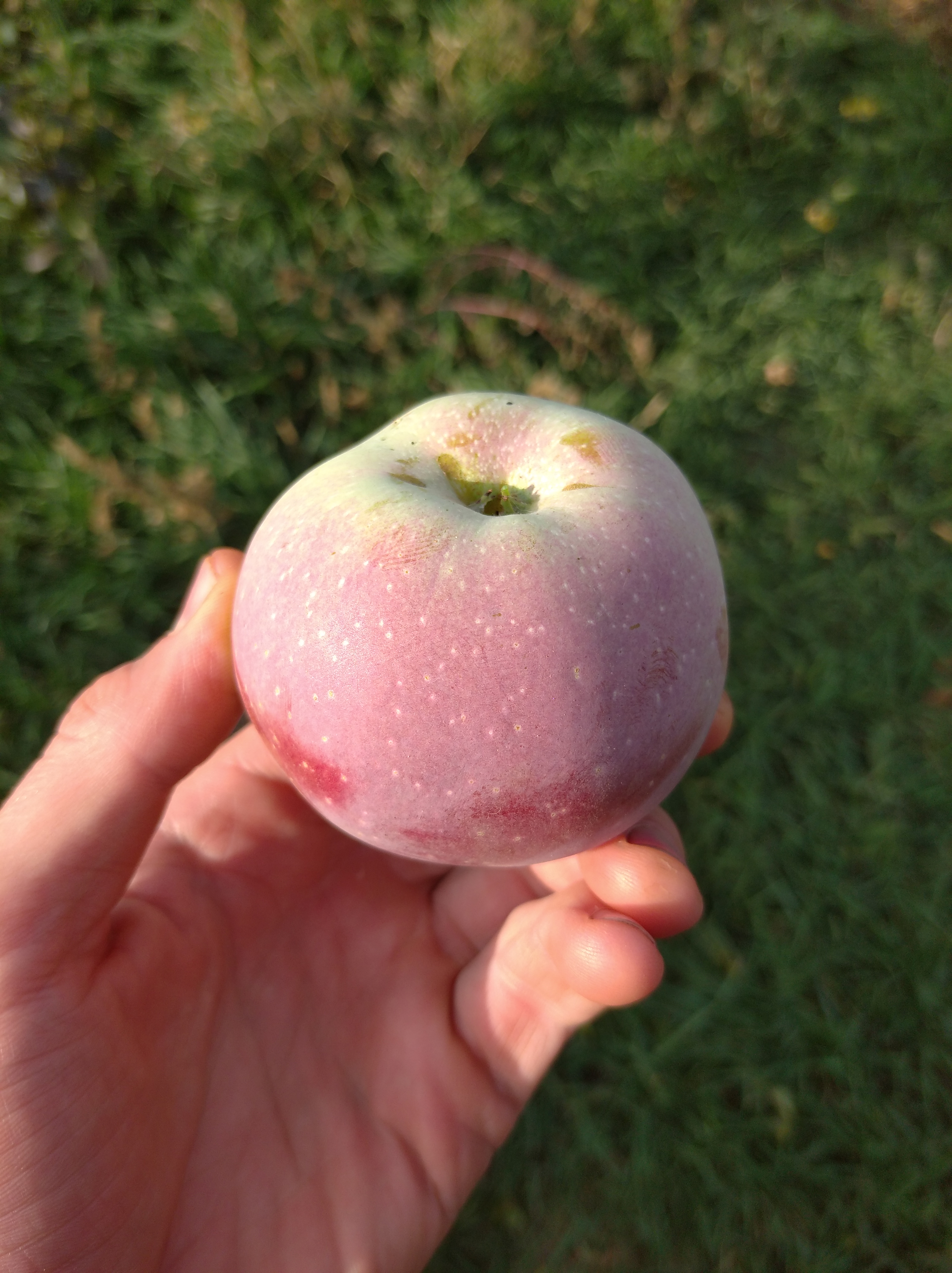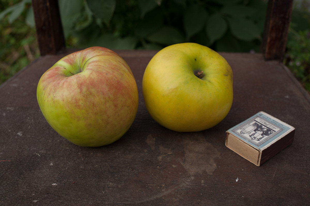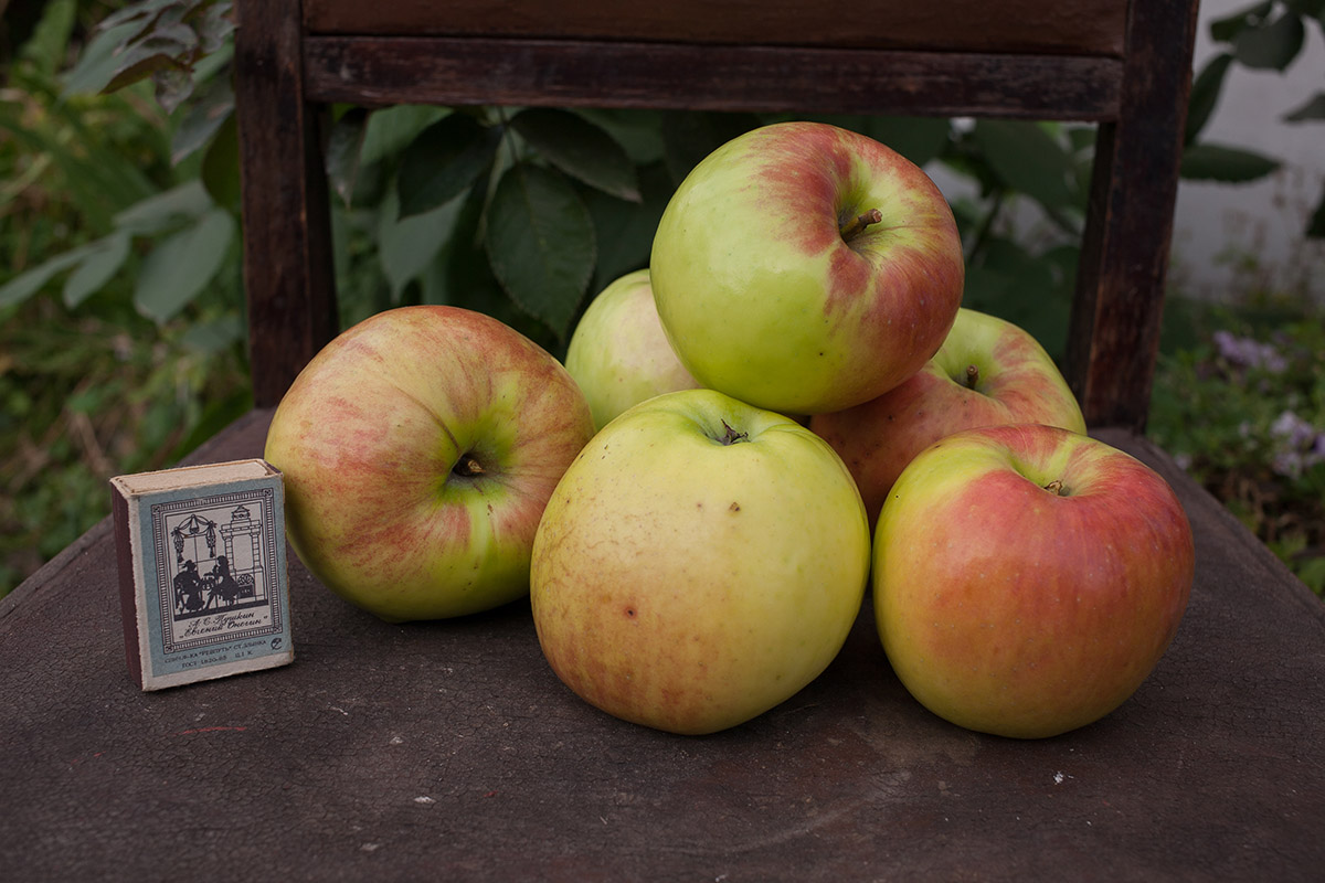 Бывает такое, что ищущий не всегда находит… как в данном случае с сортом яблони в возрасте не более 15 лет. Дерево удивило стойкостью к болезням, рядом стоящий спартан полностью захвачен паршой. Среднерослое около пяти метров с округлой формой, гладкими с поперечными штрихами, как у косточковых, стволами, грубая кора внизу штамба. Ветви отходят под углом 60 градусов, однолетние приросты тонкие, листья широкоокруглые, черешок и прожилки с краснотой. Плоды крупные, светло-зеленые с полосато крапчатым румянцем (в полной тени без окраски), воронка практически без оржавленности, плодоножка короткая, толстая, скошенная, не выходит за пределы воронки. Чашечка не глубокая, складчатая. Подкожные точки редкие, темнозеленые на зеленом фоне и серые на красном. Мякоть плотная, желтоватая, сочная, очень ароматная, кисло-сладкого насыщенного вкуса с преобладанием сахара. Кожура бугристая, глянцевая, при дозаривании маслянистая, грубоватая, но особого дискомфорта не вызывает. Плоды дозариваются в тепле за 2 недели и источают сильный аромат. В холоде не пахнут и до НГ долежат легко. На дегустации было восемь человек. Жена сказала, что вкуснее осеннего яблока не ела и определила вкус как трех штрифелей, что для шарлотки и всякой выпечки лучше не найти. Её сестра нашла во вкусе антоновку и в целом все дали высшую оценку. Осталось понять, что за сорт?