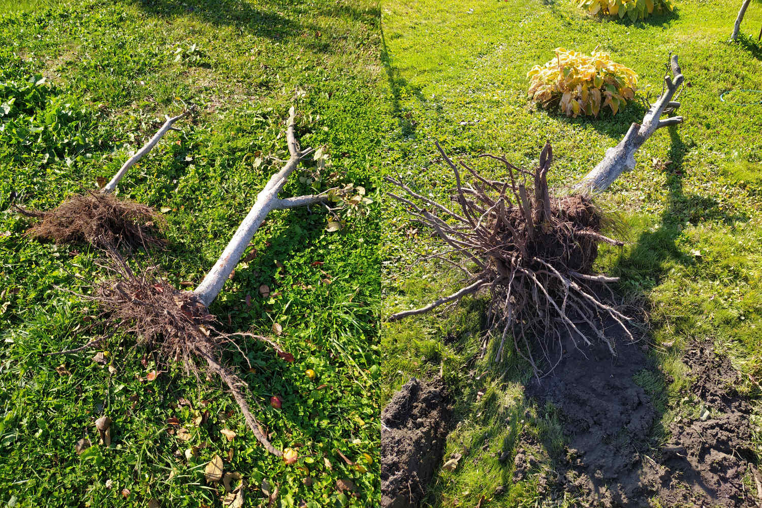 Слева направо: 62-396 (6 лет), 62-396 или аналогичный (16 лет), сеянцевый подвой (12 лет). Первые два были раскорчеваны с минимальными физическими усилиями всего за несколько минут. На сеянцевый подвой я потратил около часа, используя самые простые инструменты: лопату, небольшой топорик и садовую пилку. Помощников не привлекал, но очень помогли сноровка и богатый опыт корчевания. Весит такая «бандура» более центнера, одному не поднять. Далее с помощью цепной Макиты и топора-колуна будет превращена в дрова для мангала. Корни на дрова не годятся и будут утилизированы в бочке для сжигания садового мусора. Еще два дерева были удалены чуть раньше и на фотосессию не попали.