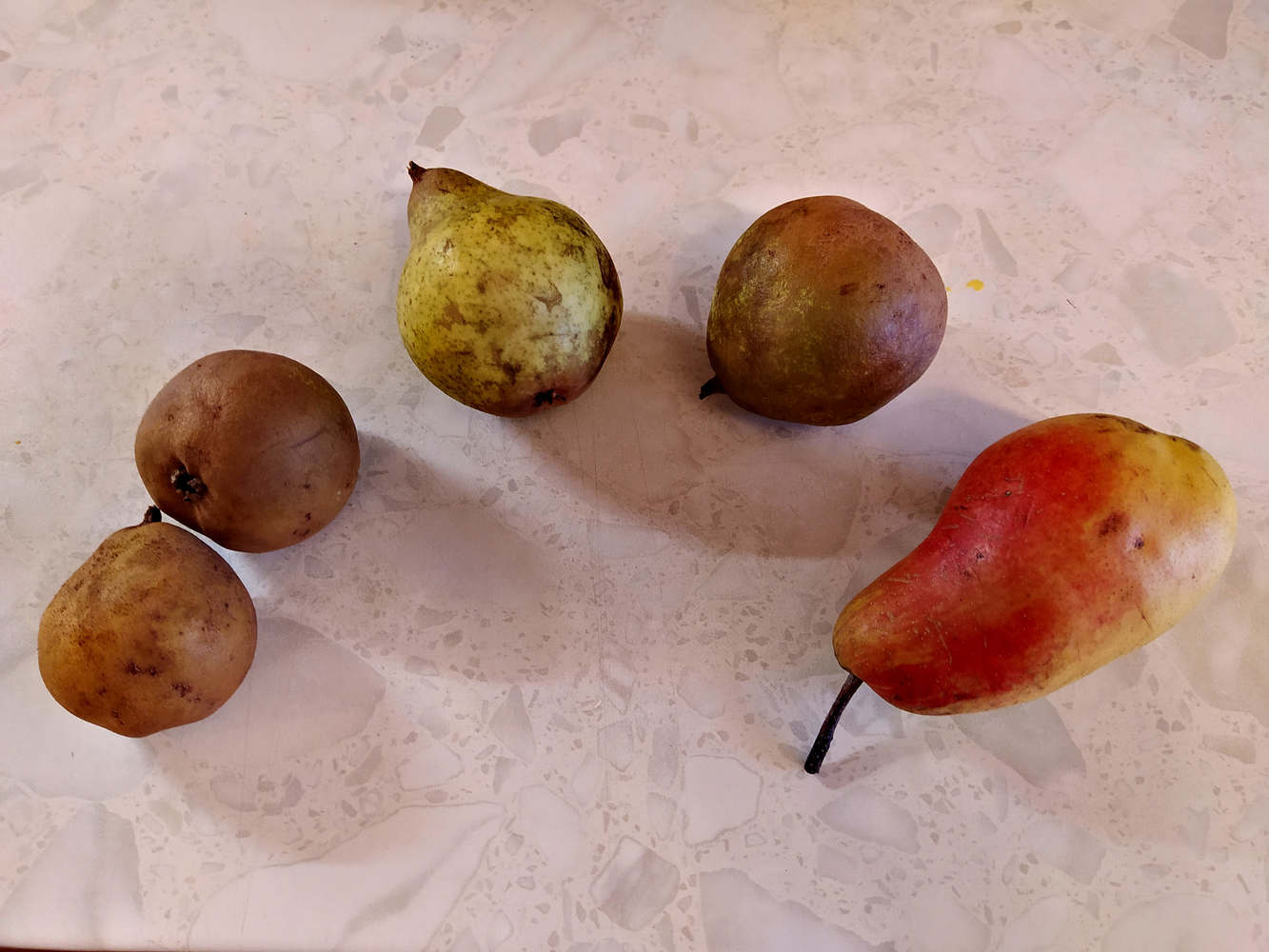 Небольшая сравнительная дегустация нескольких зимних сортов груши. На фото слева направо: Белорусская поздняя, Завея, Веснянка, Талгарская красавица:
