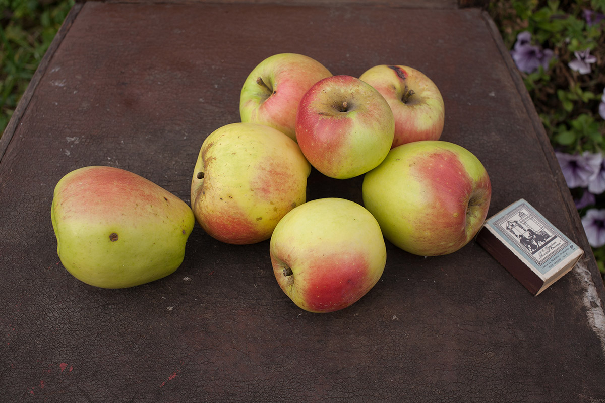 Вот описание. Яблоки весят 180–200 граммов. Кожица является уплотненной, блестит, имеет зелено-желтый оттенок, иногда покрывается светло-розовым или красным румянцем, который занимает большую часть поверхности плода. Есть небольшой налет воска, через который можно увидеть точки желтого цвета. Мякоть кремовая, крайне сочная и плотная. Вкус кисло-сладкий, приятный, встречаются плоды с привкусом лесной ягоды и ванили. Плоды довольно крупные, их диаметр – 6–7 см, форма округлая, напоминает конус.
