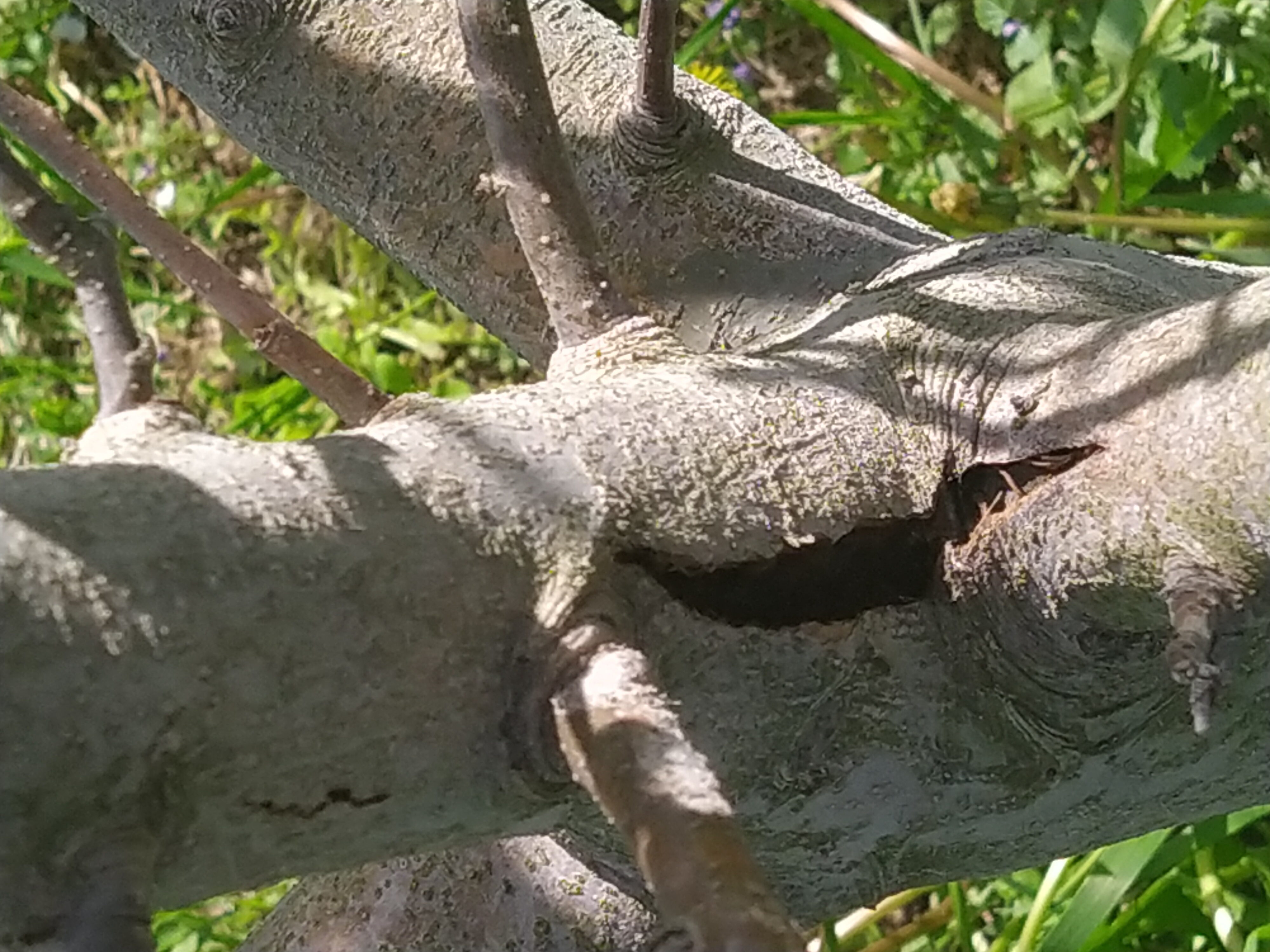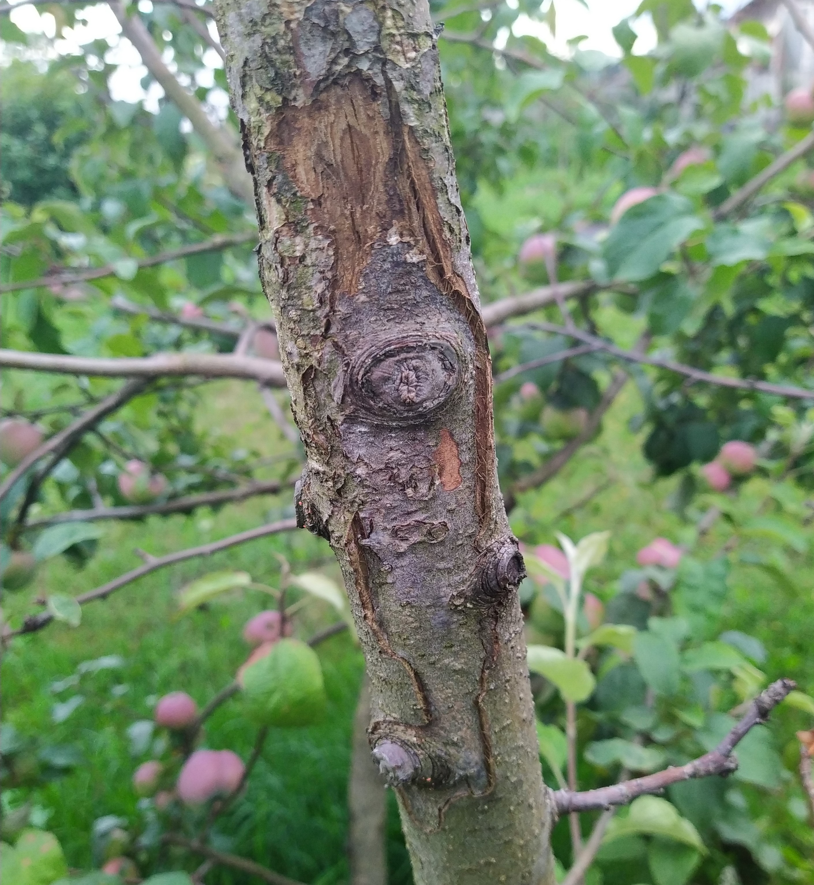 Академик Казаков на 54-118. Цветет обливенно. Но много морозобоин на ветвях и вот самая серьезная на фото. Очень жаль, вряд ли перезимует ещё раз. Вкусные, довольно лёжкие яблоки, легко формируется дерево. Иммунный к парше. Возможно, дело не в сорте, у этого дерева как-то были голубые листья, я писала здесь, может, что-то грибное, и теперь усугубилось.