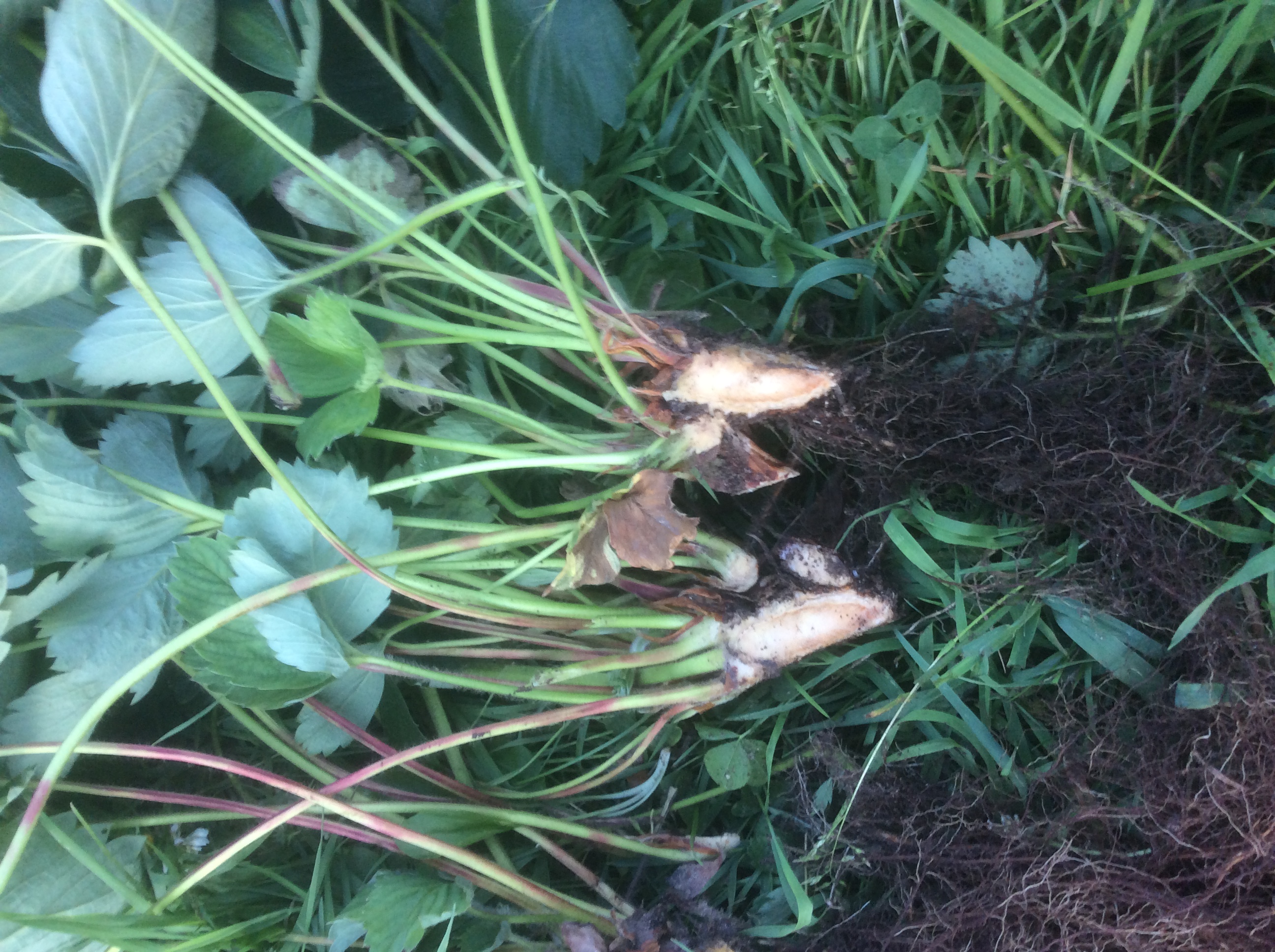 По фото сложно сказать однозначно, но скорее всего это фитофтороз (Phytophthora crown rot или Phytophthora cactorum). Профилактически помогает пролив под корень препаратом Квадрис (10 мл. на 10 л. воды, примерно 1-2 л. под корень) перед цветением. А если это фузариозное или вертицеллезное увядание, то хорошо помогает Фундазол (20 г. на 10 л. воды) перед посадкой земляники в лунку (примерно 1 л. на лунку). Чтобы точнее сказать нужно куст в динамике наблюдать. Но это все хорошо делать профилактически. Если увядание уже имеет место быть, то я бы не ждал от подобных кустов ничего хорошего. Как только вижу подобные симптомы, куст выкапываю. Землю либо кипятком пролить, либо Фундазолом. На это же место высаживаю новое растение и оно чаще всего благополучно растет на этом месте. Опять же большое внимание нужно уделять подбору устойчивых сортов, чтобы не использовать постоянно химические препараты.