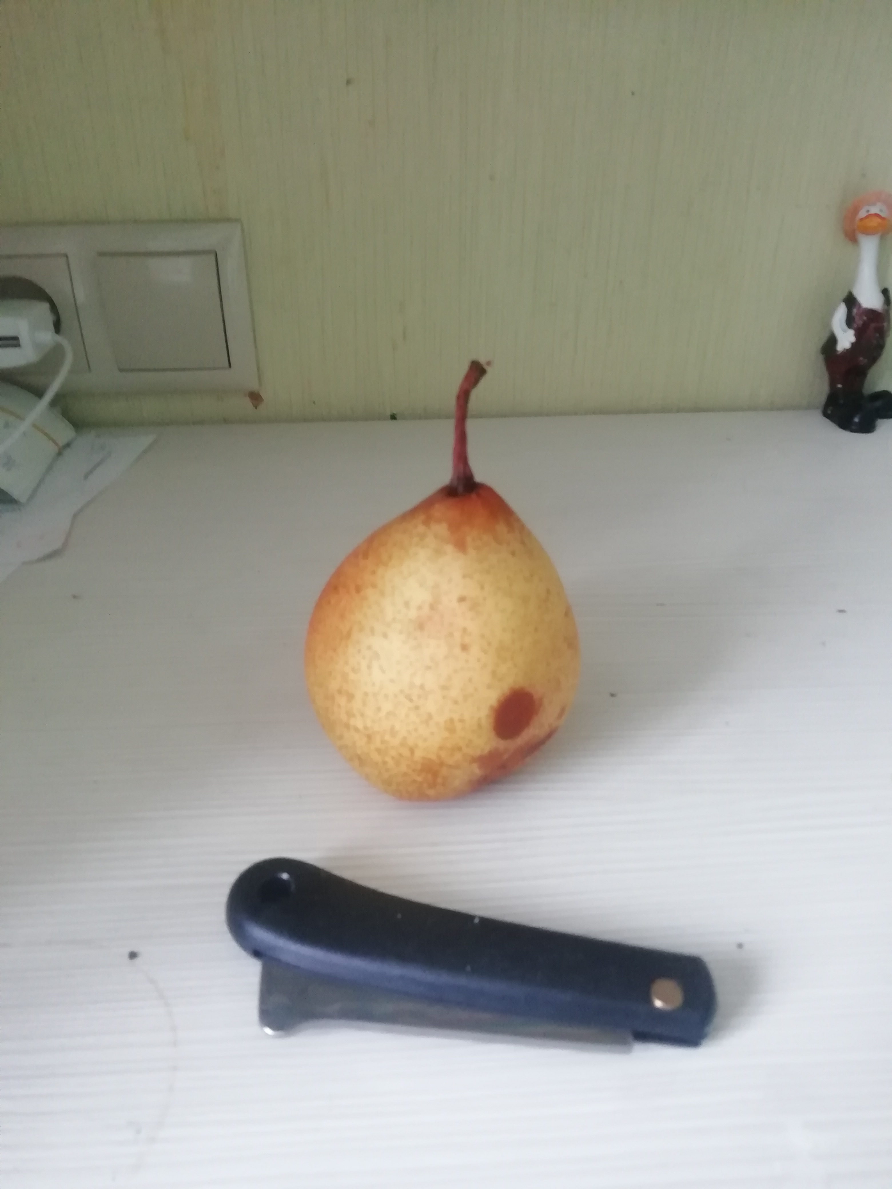 Угостили грушой "Золотая осень", выращена под Минском. На фото маленькая, в реале в 1,5-2 раза крупнее, выбирал просто поцелее. На вкус сладенькая водичка, похожа на вкус китайских груш из магазина. Внутри оказалась довольно тверденькая, сочная, с небольшим хрустом.