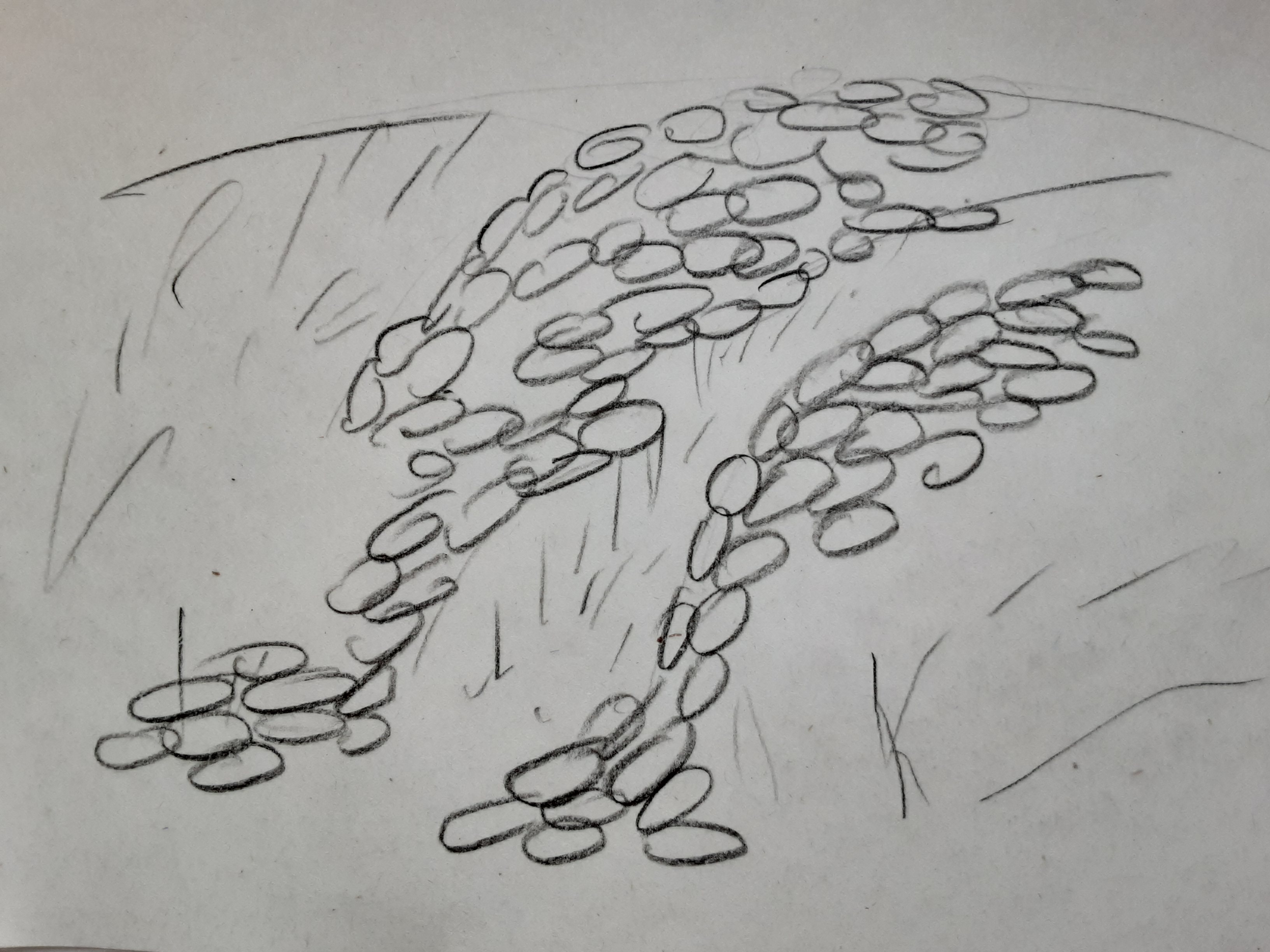 Крупные окатыши легче вымываются с вррха склона водой дождевой и снеговой. Они сползают вниз потихоньку. Маленькие на месте остаются. Все крупные накапливаются у подножья склона. Вот так думаю и свой склончик оформить - пару самых крупных внизу.