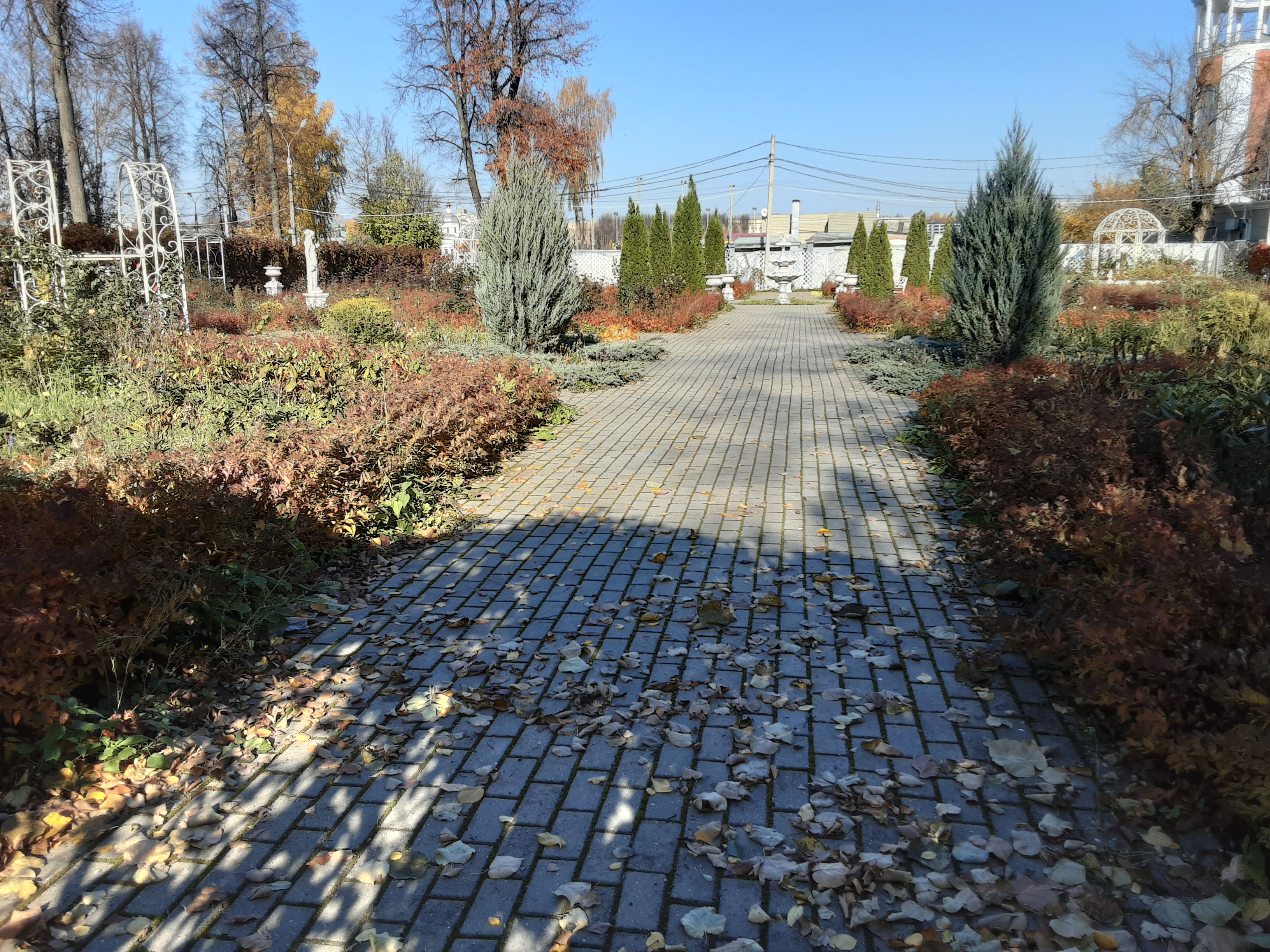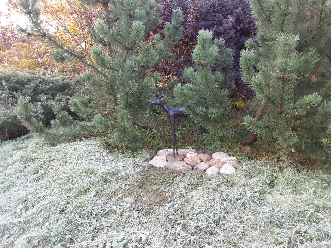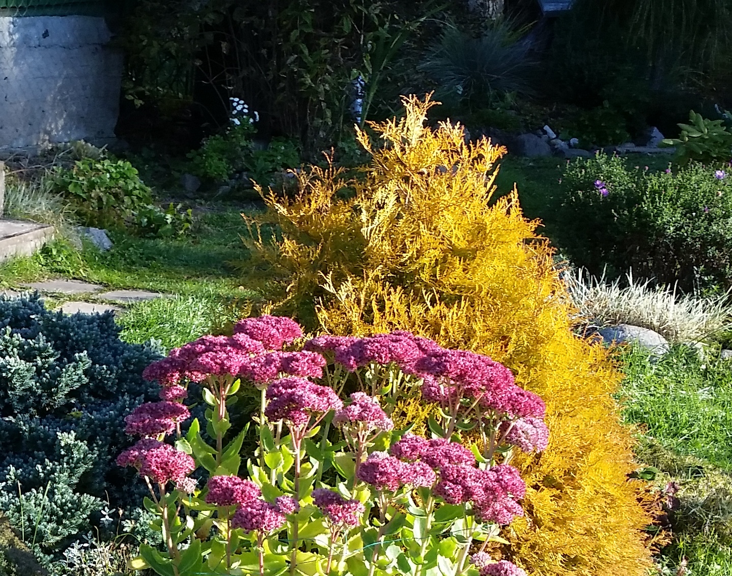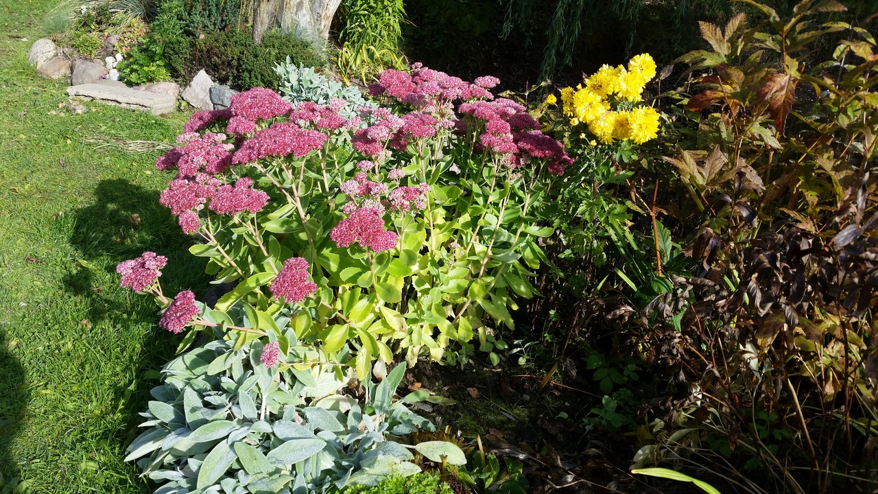 Цвета не хватает. Может куст с красными листьями или плодами? Сейчас осень, краски яркие... вот у нас в парке посадили клёны остролистные с красными листьями - красиво, но не долго, скоро, думаю, облетят. А видела дом, где за забором посадили ряд таких клёнов.