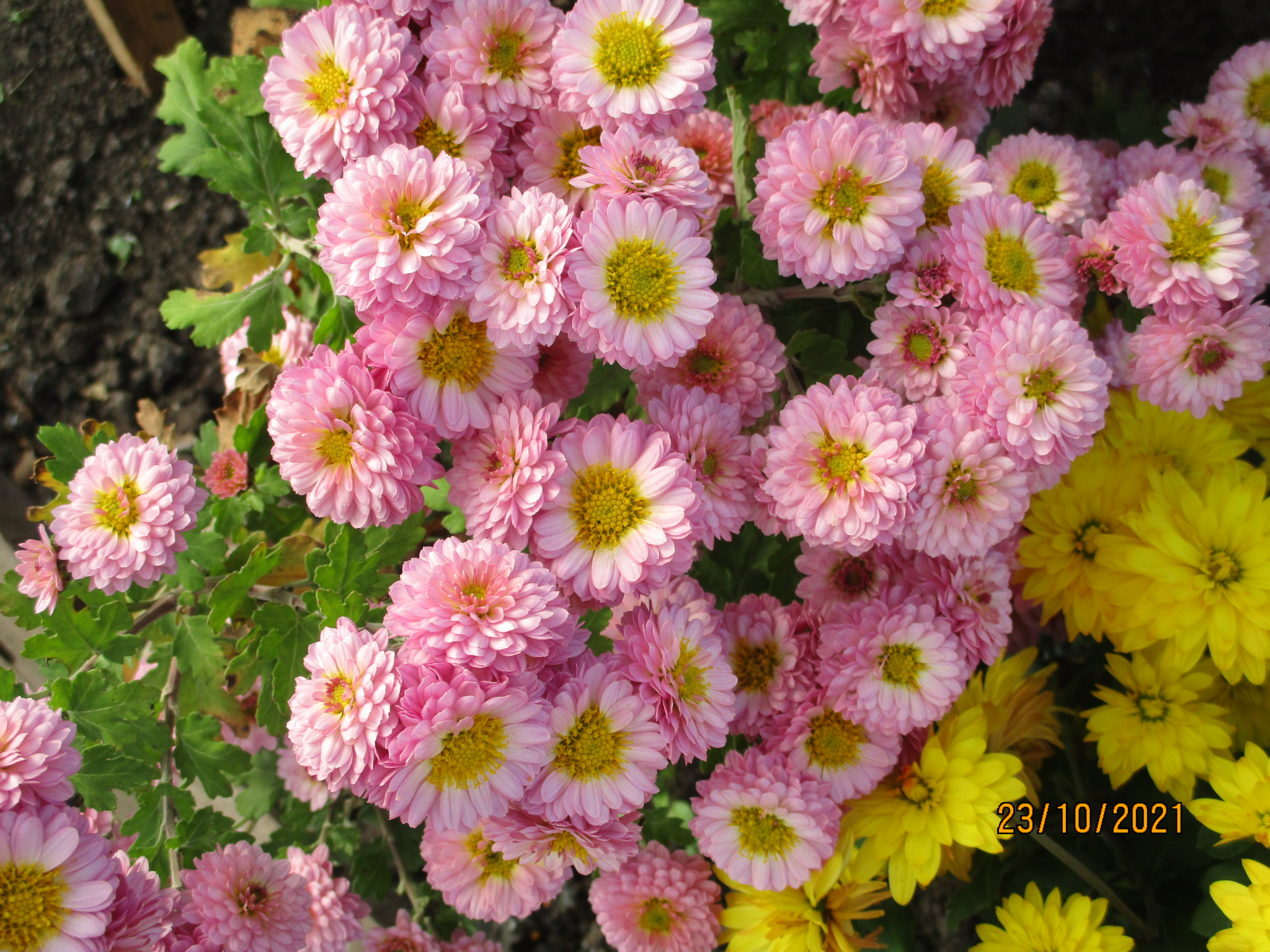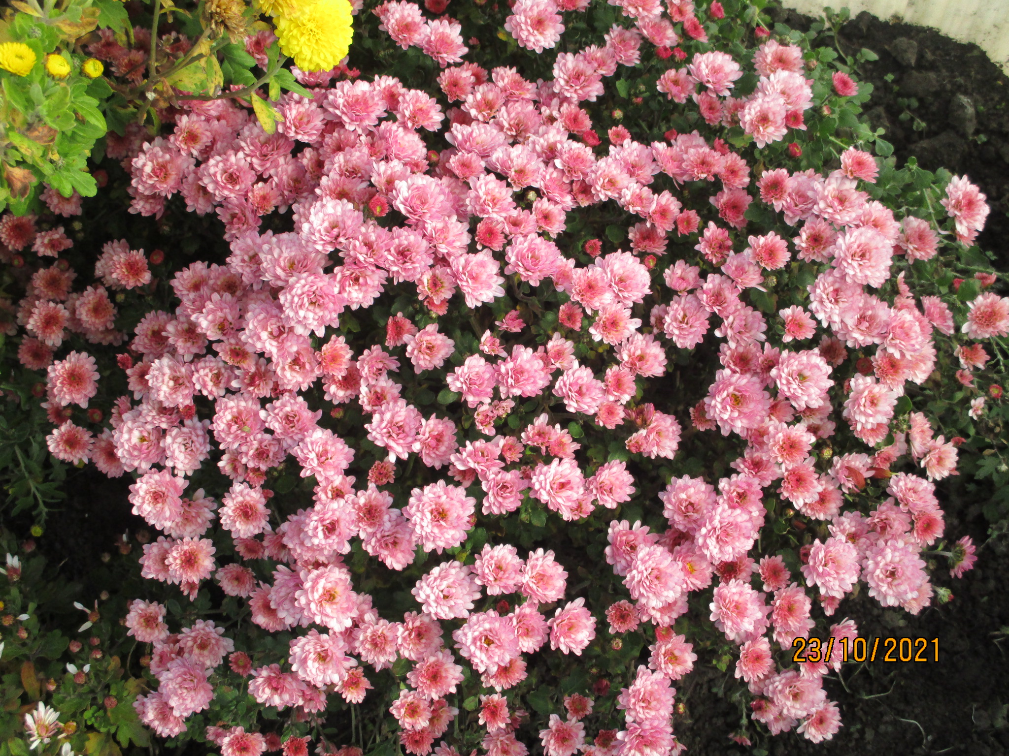 У меня 2 молодые хризантемы махровые среднего размера: желтая и розово-лиловая в этом году 2021 году не цветут, только бутоны пока