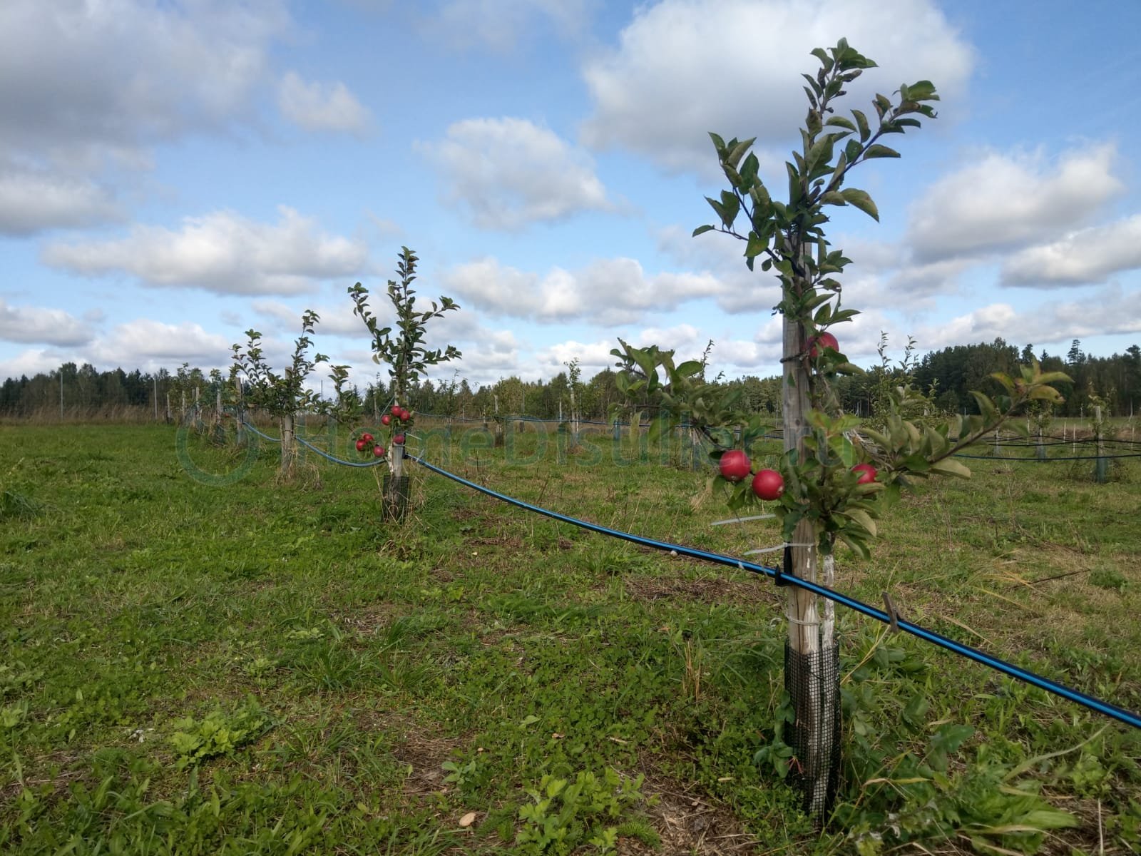 Планирую по максимально интенсивной схеме заложить сад - 0.9х2м. Столбы для шпалеры планирую использовать деревянные оцилиндрованные и пропитанные антисептиком под давлением в барокамере. Крайние 140мм, промежуточные 100мм высотой 3м. Между столбами 10м. Для каждого дерева бамбуковую опору по нынешним временам дорого ставить (2-3 евро штучка), наверное просто распущу доску 33х100 на три части и ее поставлю. Проволока 2-3мм оцинкованная с натяжителями. От зайцев штукатурной сеткой на метр высотой нужно обернуть ствол. Труба магистральная 50мм закопана в землю, к ней седелками подходит слепая трубка 16мм с краником, после краника капля многолетняя (как вариант пнд труба 20мм с капельницами вместо капли 16мм). Растворный узел с эжектором. Возможно замульчирую на метр шириной геотканью для борьбы с сорняками и для защиты корневой от мороза. Междурядья обкашивать трактором-косилкой, у меня уже есть такой мощностью 20лс, к нему и прицеп есть со съемными бортами. В прицеп можно ставить ящики при сборе урожая.