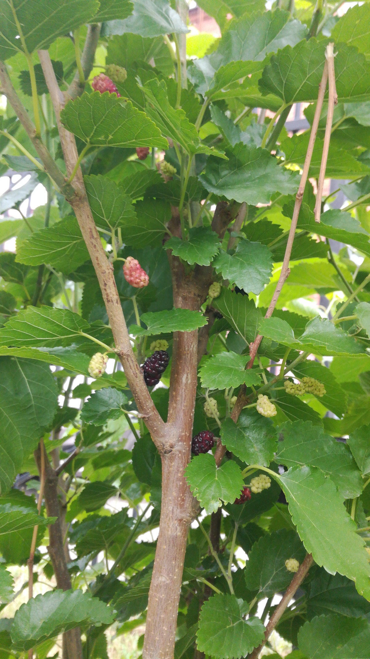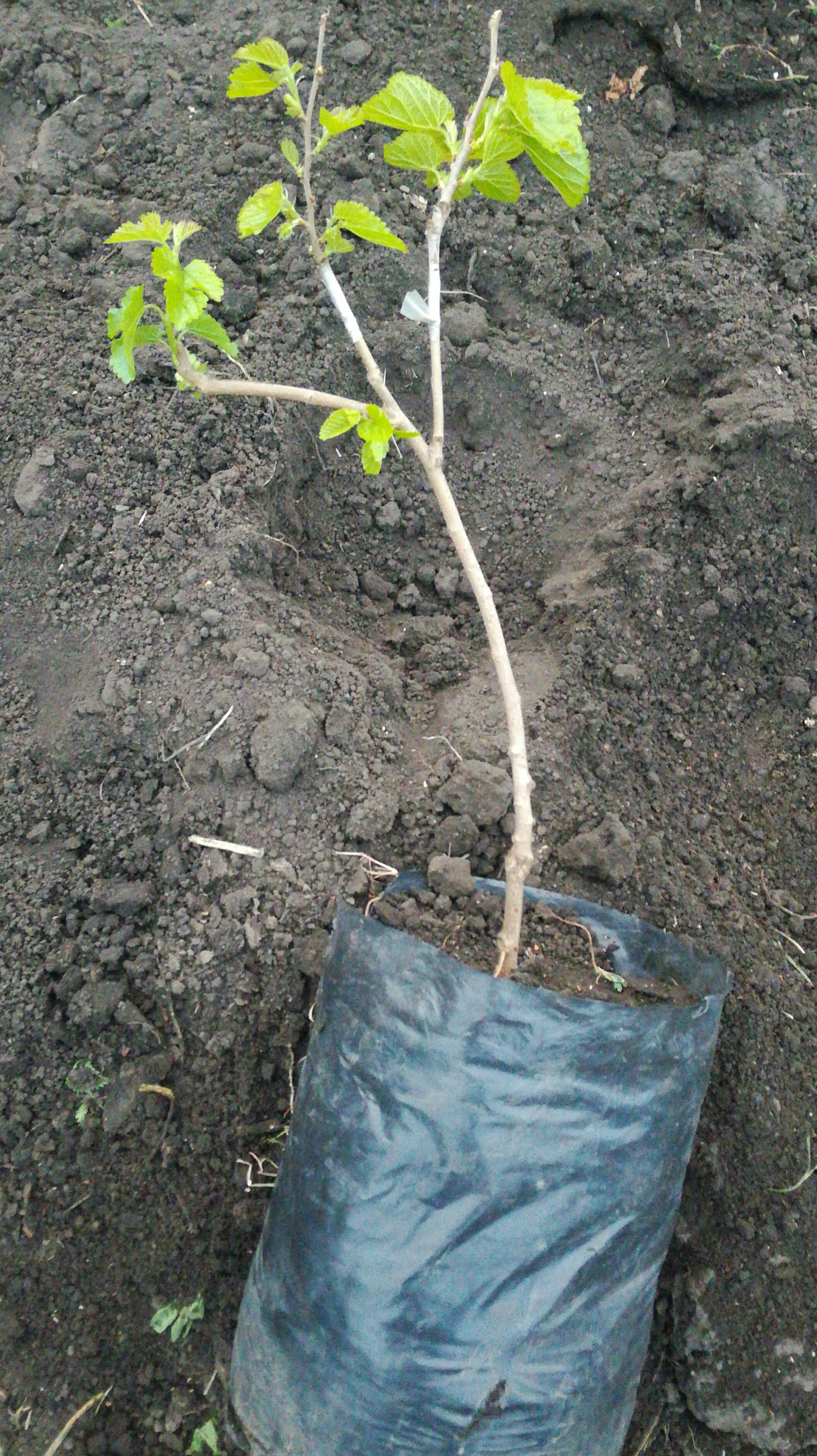 Посадил сегодня на постоянное место из 10л пакета трехсортовое деревце, задумка была по одной ветви с черными, розовыми и белыми плодами (подвой), но последний оказался чисто мужским растением и придется ещё раз перепривить.