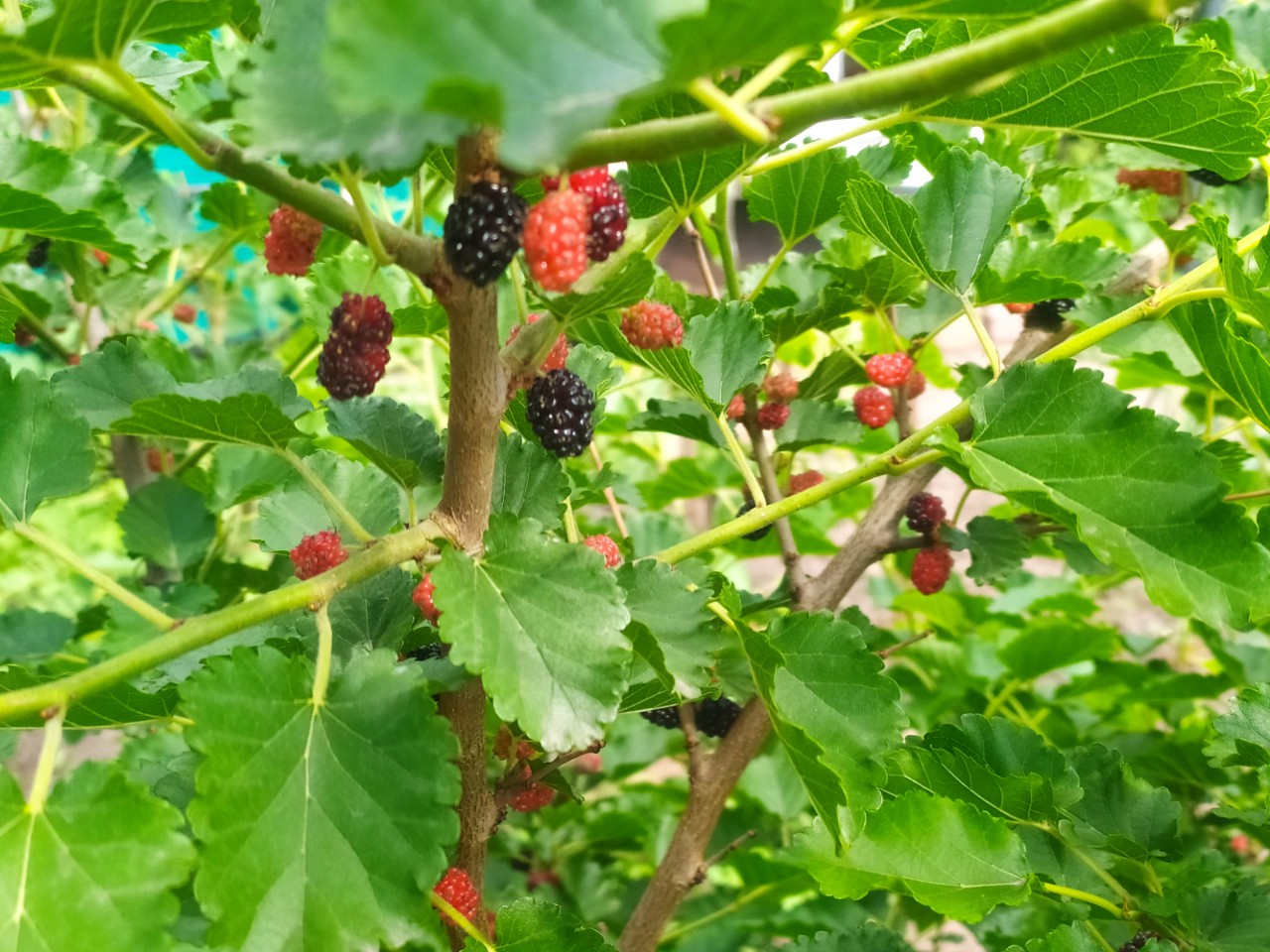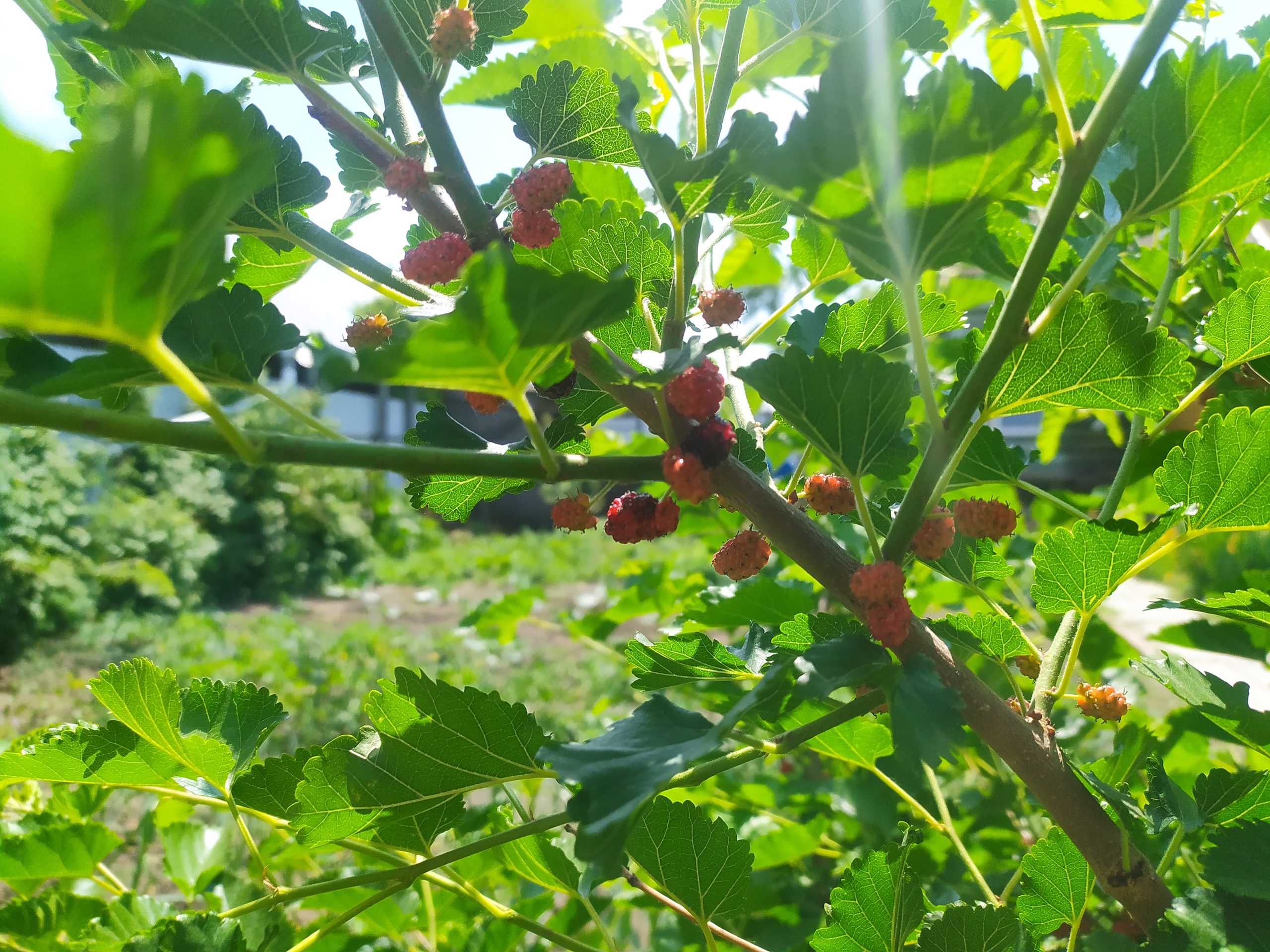 С конца июня начали созревать и киприотки, фокус с опылением привезенной во время цветения со своего участка ветки с мужскими сережками удался - плоды в сравнении с прошлыми годами преждевременно не осыпаются и содержат семена внутри. Рядом другие мужские посажены, но пока не цвели. Сами соплодия крупнее тех оренбуржских раза в полтора, одна шелковица получилась с плоской формировкой и высотой примерно 2,20 м, а вторая - кустом и примерно 1,5 м.