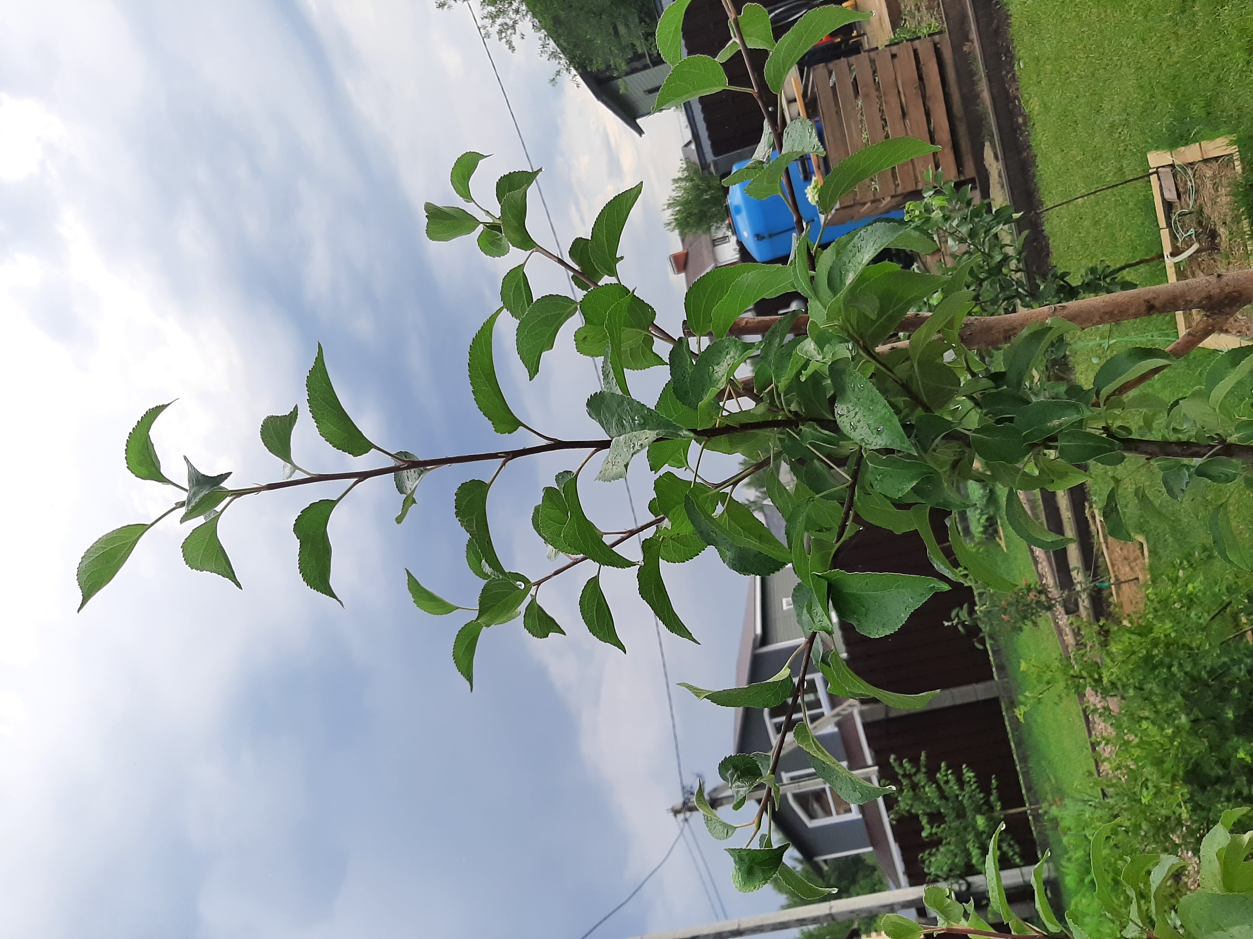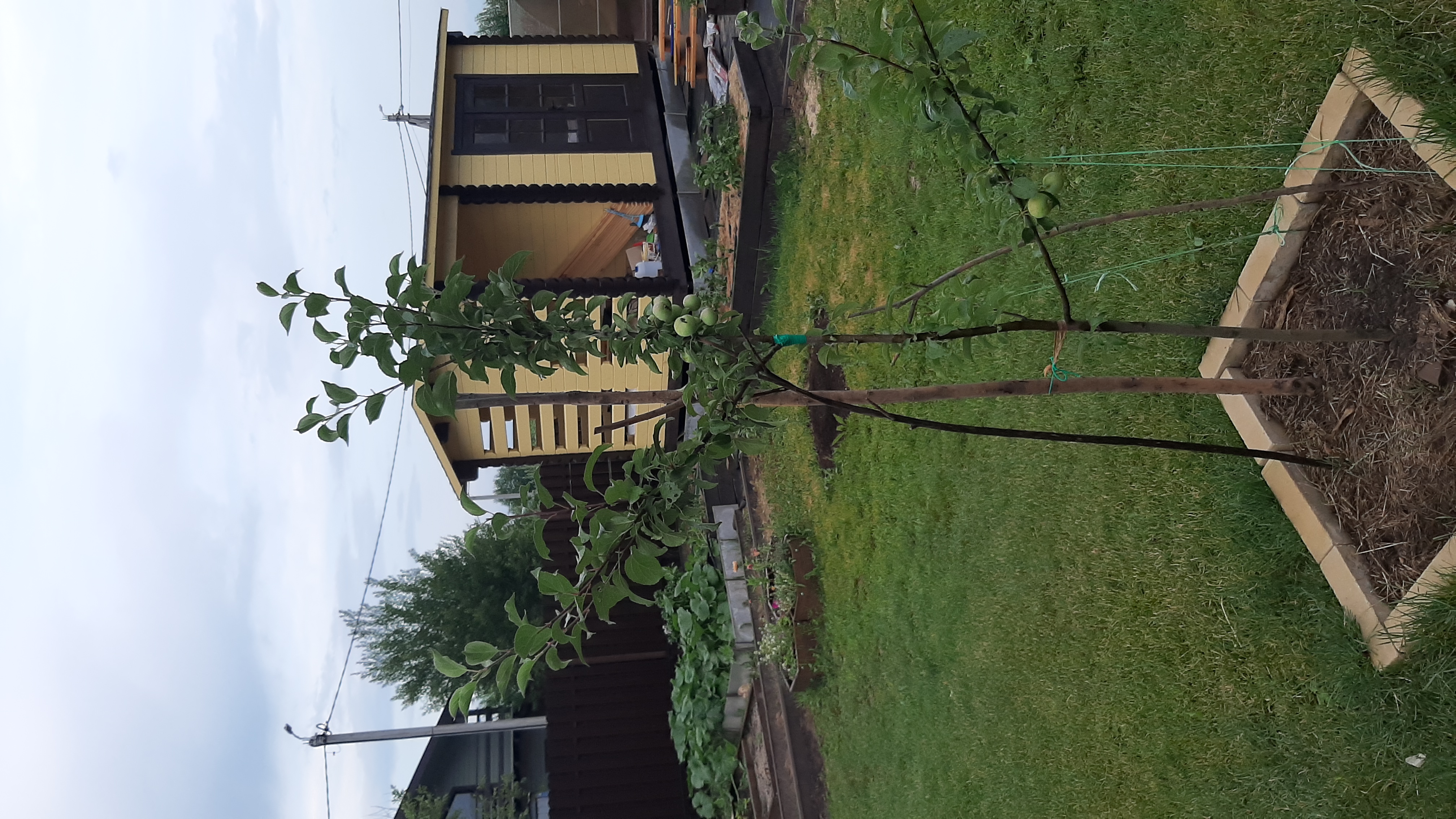 Одна яблоня какая-то крайне странная. Всего две ветки и огромное расстояние между ними. Недавно отогнула ветки, чтоб хоть их не лишиться, т.к. обе растут под острым углом. Основной ствол подвязан тоже. Вчера был дикий ветер и сломало верхнюю ветку. Причём очень сильно, выдрав приличный кусок ствола. Примотала её на место изолентой, может приживётся.