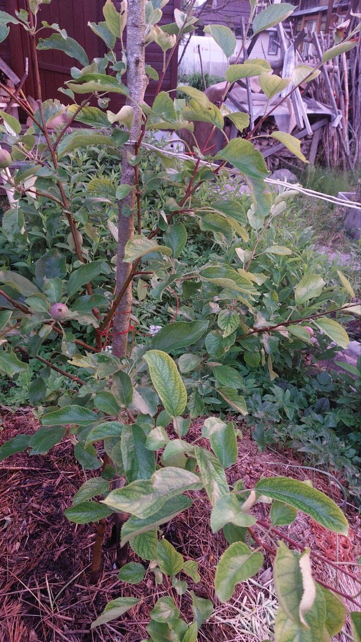 Вот фотка того же деревца в 2022г. Вроде, хлороз слабее. Она даже отцвела, оставили 3 завязи попробовать.