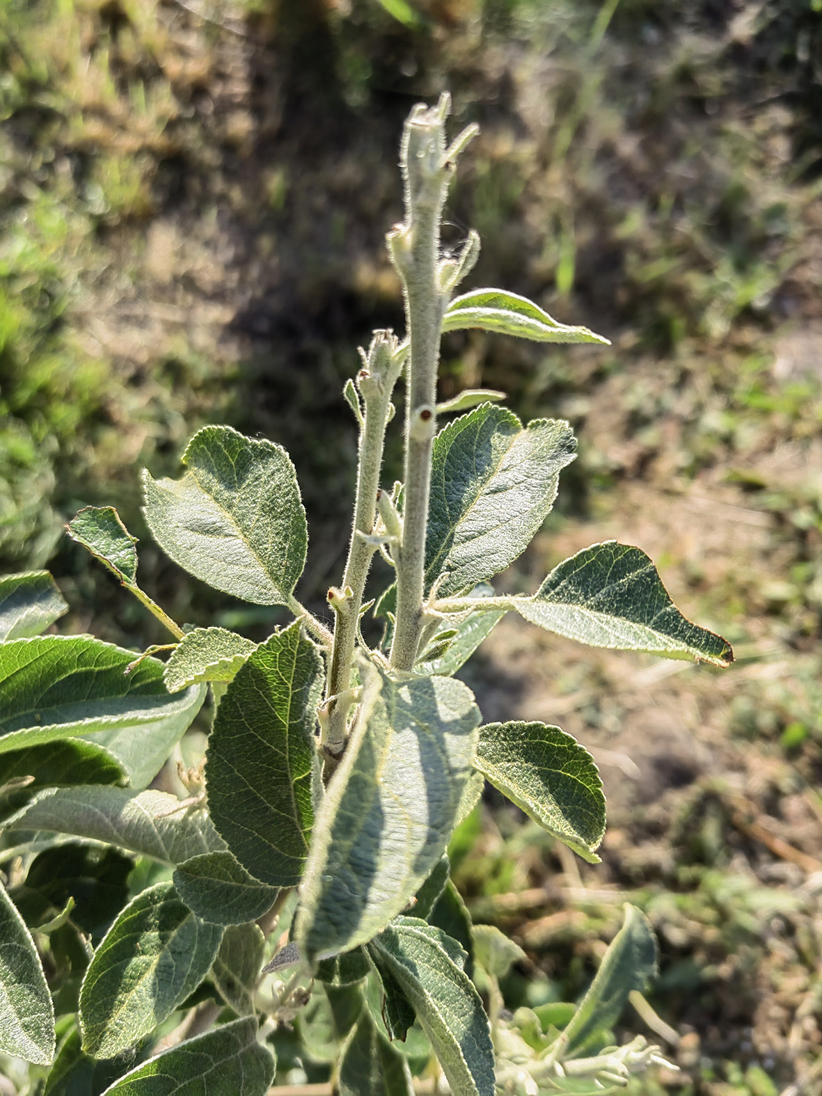 Саженец на ММ 106, прививки в кроне, в т.ч. на старой Антоновке, все с такими же листьями.