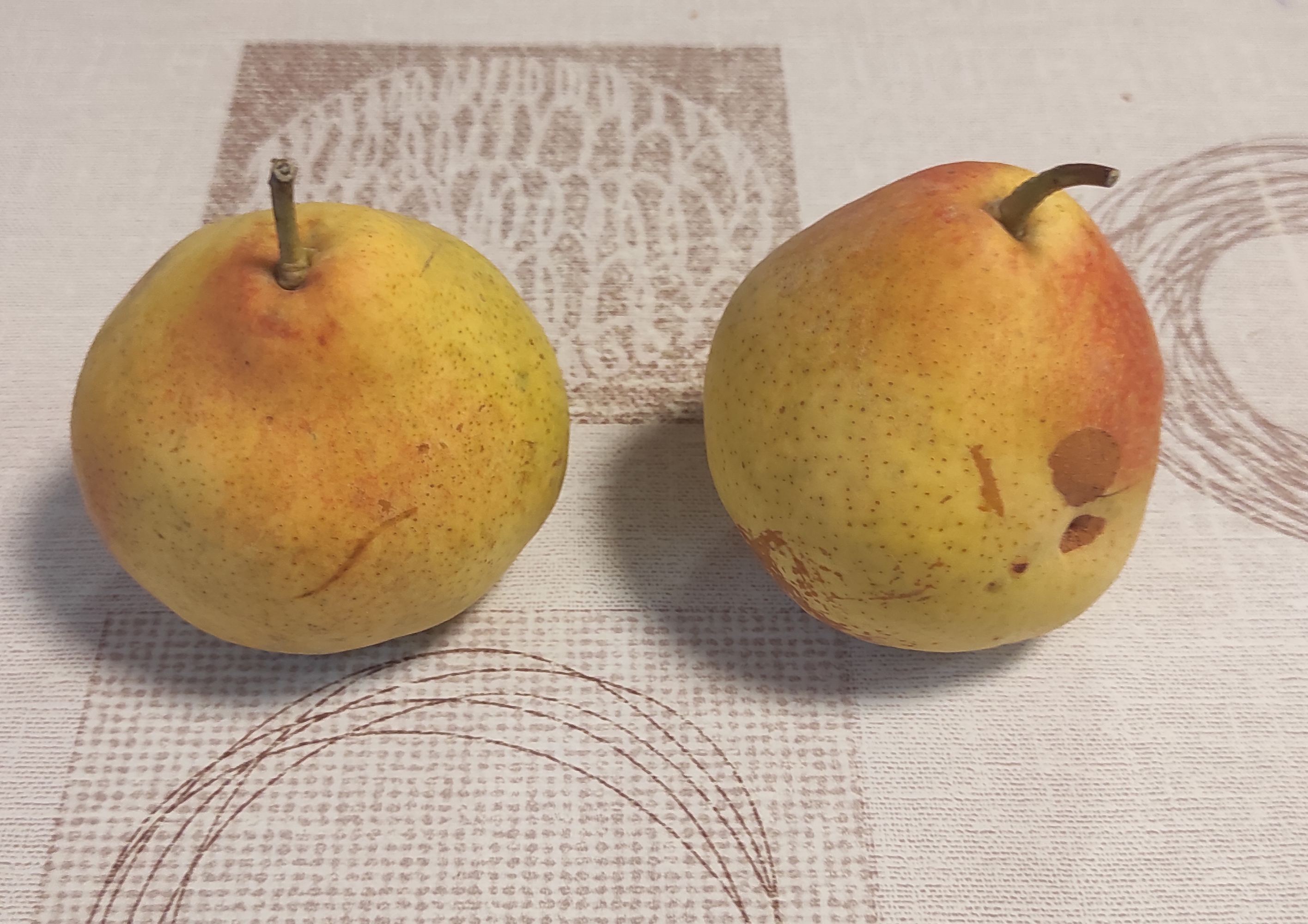 М-да! Искусственное освещение может изменить картину мира и ввести в заблуждение. Груши еще совсем не желтые. Оригинальное фото правильно передает цвет. А плохое качество - это слегка размытое изображение.