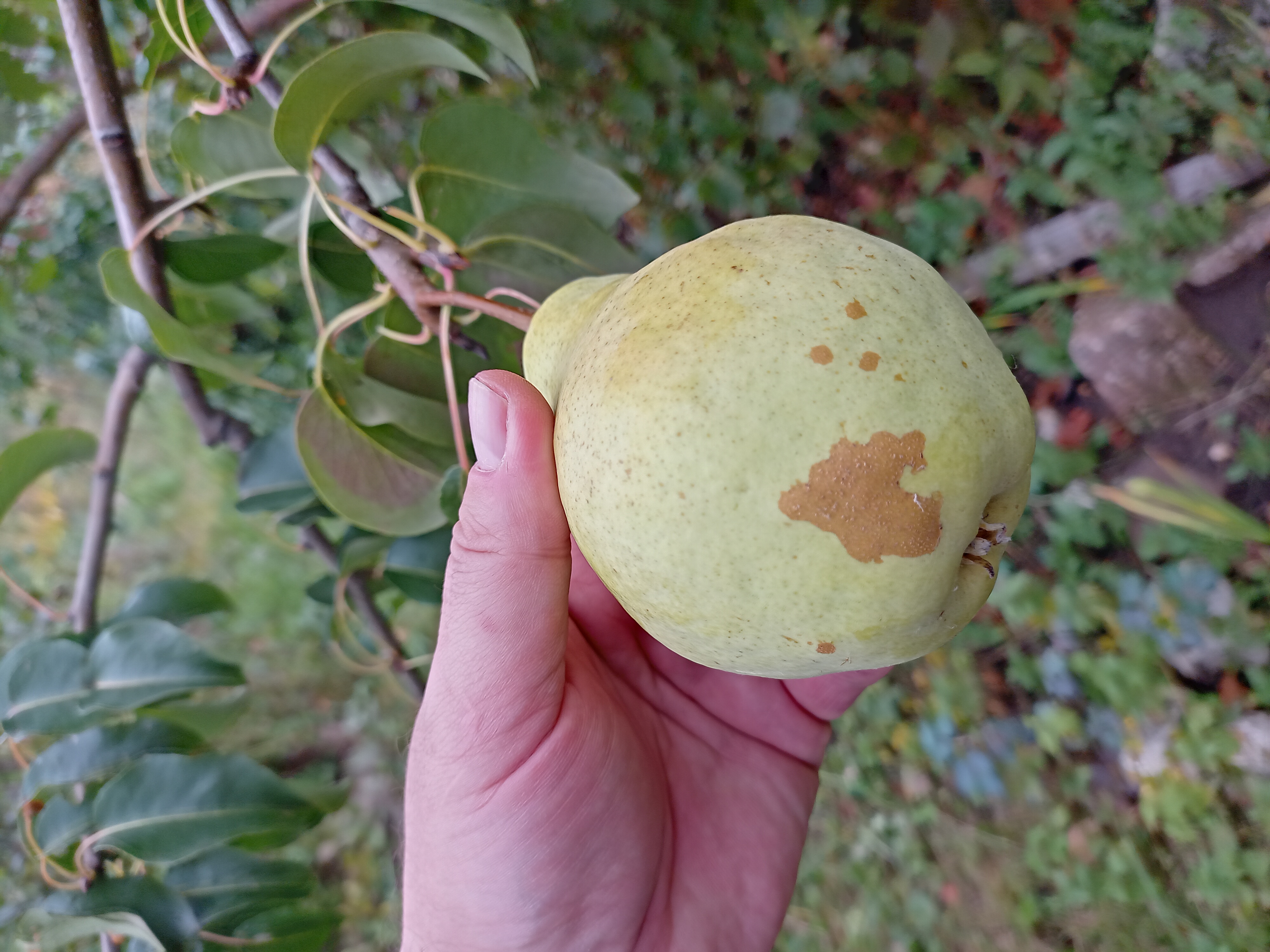 Ещё белорусская поздняя понравилась по вкусу. Была одна грушка на дереве, умудрилась поспеть и упасть. Вот теперь гадаю, это пересорт или просто первое плодоношение не показатель.