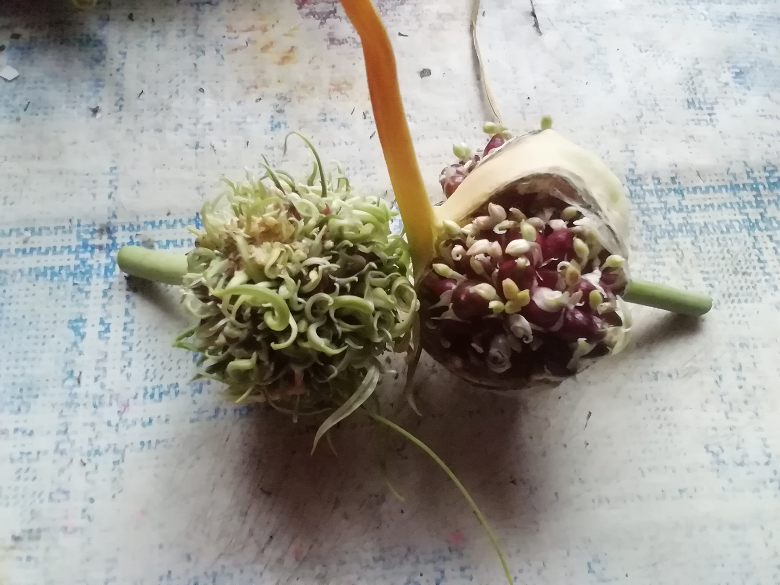 sosed, ну во-первых, сорта разные, это и по цвету видно. А что проросли, ну бывает такое, сыро, прохладно вот они и решили, что пора расти. Сажайте, если вам эти бульбочки нужны. Обе ведь головки проросли, только левая раньше, это сорт видимо более ранний, а правая попозднее.