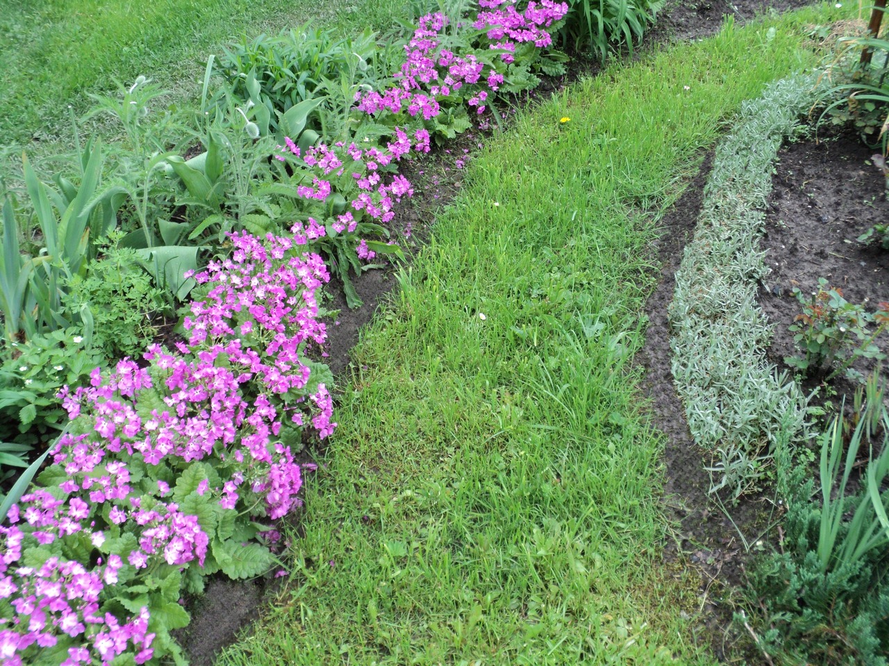Про примулы уже писала, агитировала делать бордюры. Времени по уходу занимают мало. Этому бордюру уже больше 10 лет, я его не пересаживала. Только подправляю край. Но трава с газона уже влезла - в этом году придётся обновить его
