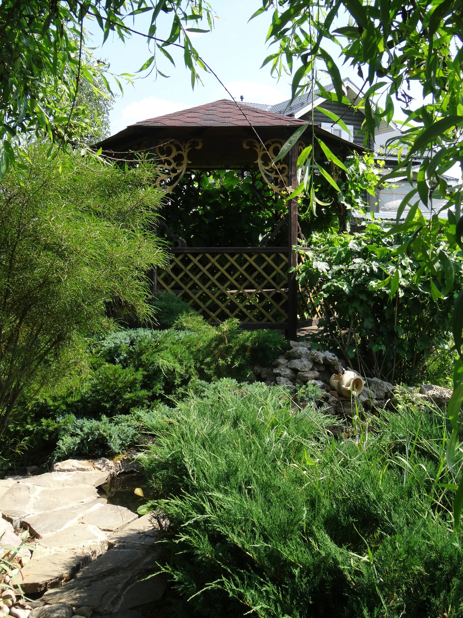 Беседка, из-под нее течет водопадик в один из прудиков.
