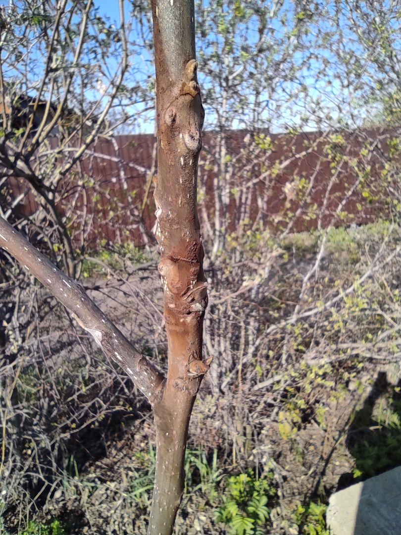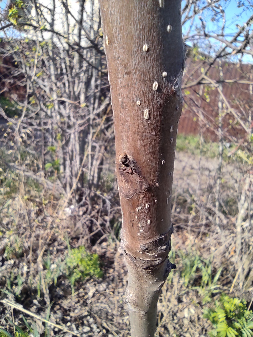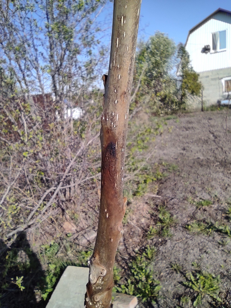"..экземпляр (фото) несколько лет подряд уверенно зимовал, сохраняя верхушечную почку, и потому выглядел очень перспективным. Но в этом году он плохо перенес зиму, весной открылись сокотечения в нескольких местах на стволе (на фото это коричневые потёки на коре), это места размерзания древесины и флоэмы. Растение потеряло больше половины своей высоты, почки пробуждаются от уровня снега. Пока не бракую этот экземпляр, но ставлю ему минус. Надо отметить, что в прошлом году этот экземпляр начал отрастать позже обычного. Хотя внешних признаков зимних повреждений отмечено не было, но такое запаздывание в раскрытии почек это тоже результат внутренних повреждений, которые растение сначала пытается залечить, а потом уже распускается".